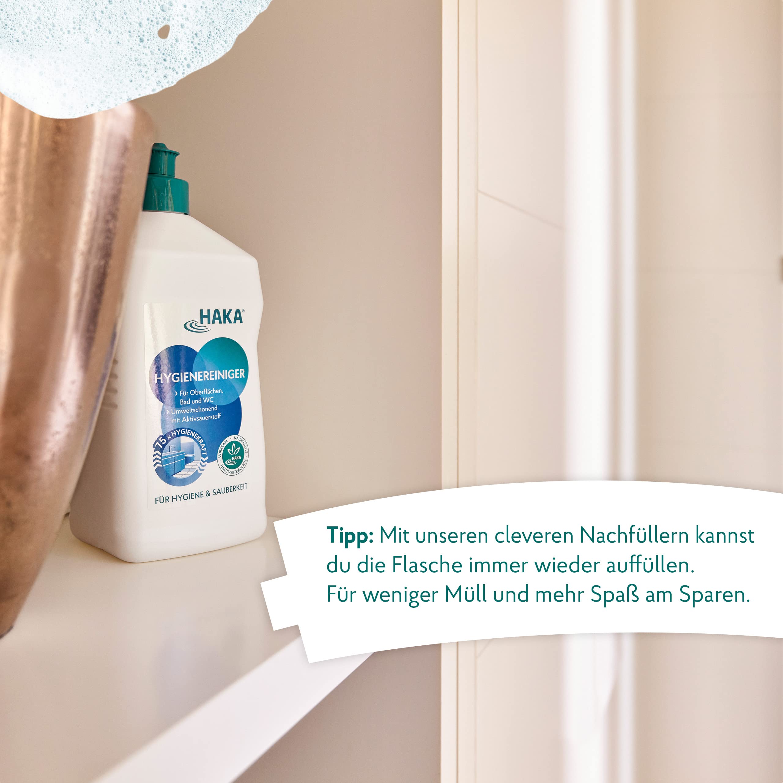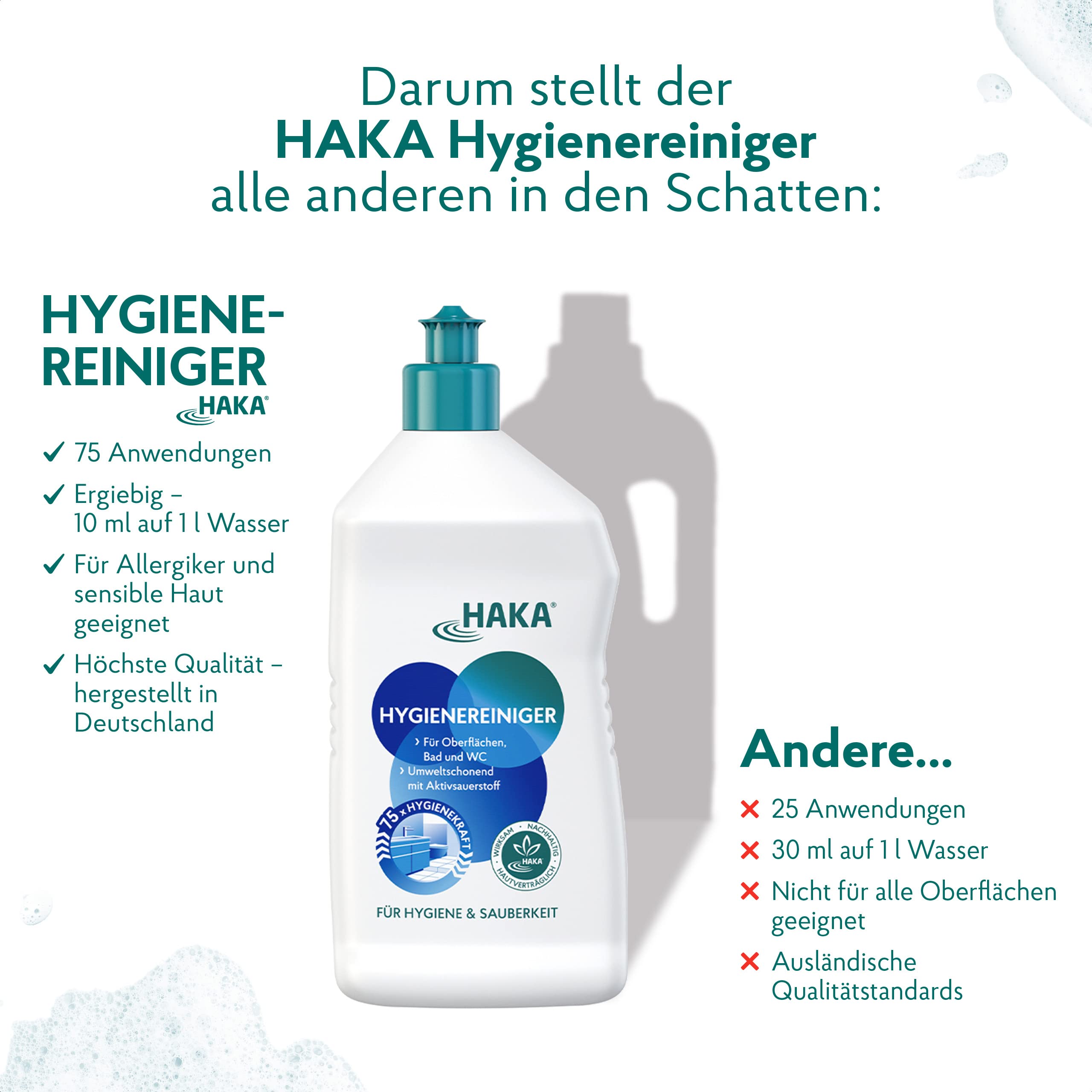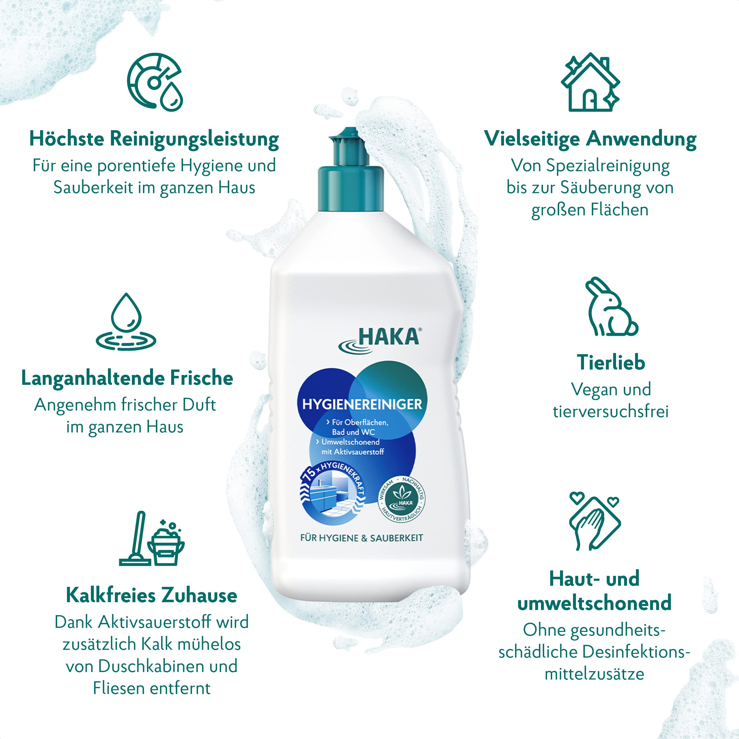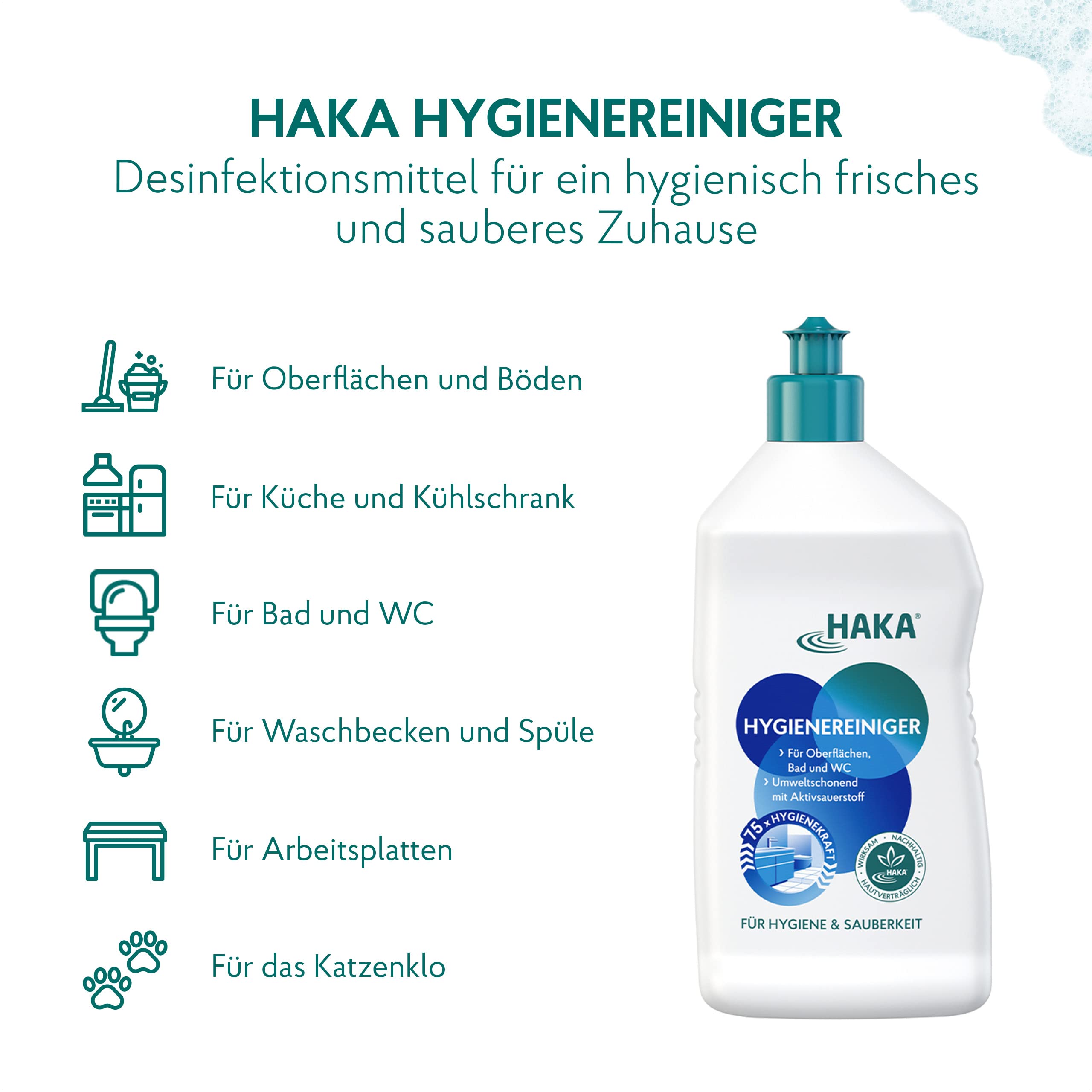 HAKA Hygienereiniger: Für ein sauberes und hygienisch frisches Zuhause.Für porentiefe Hygiene und Sauberkeit in Bad und WC. Die umweltverträgliche und wohngesunde Rezeptur basiert auf Aktivsauerstoff - ohne Chlor oder schlecht abbaubare Desinfektionsmittelzusätze.Ideal, um grosse Flächen in Bad, Küche, Kühlschrank und Böden hygienisch sauber zu reinigen.Lieferumfang 1 x HAKA Hygienereiniger 750 ml