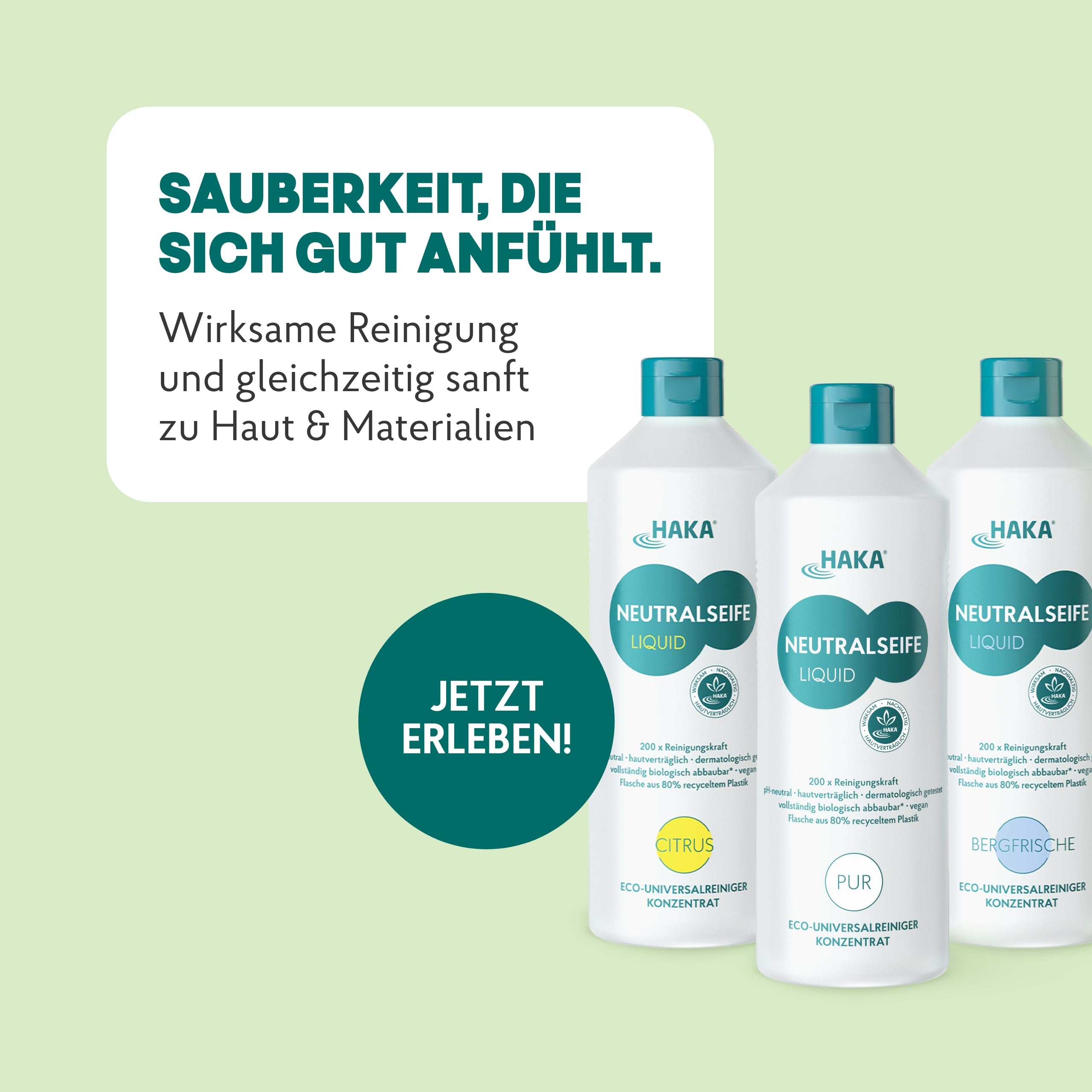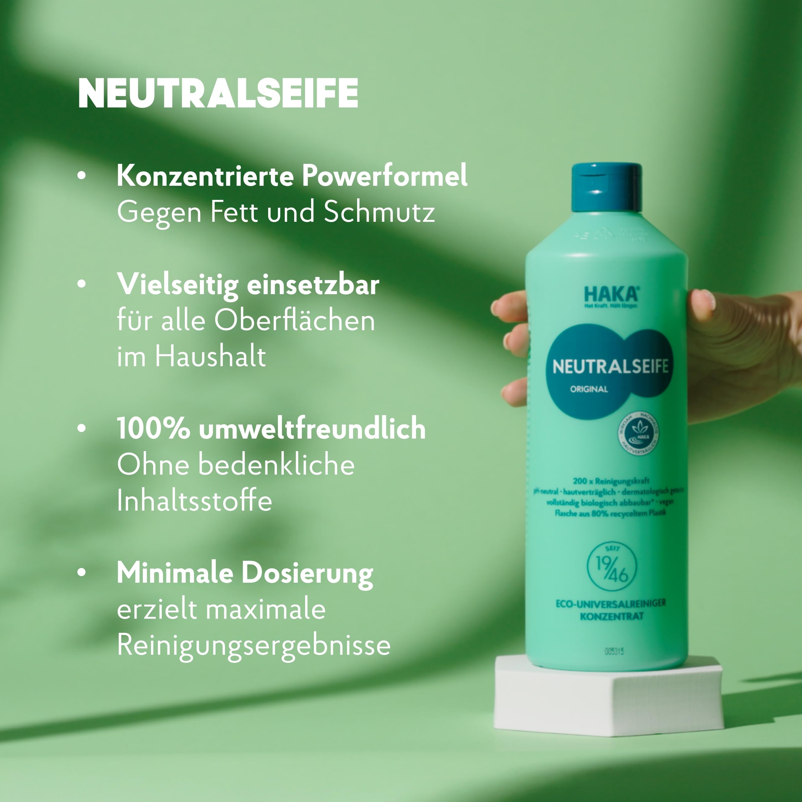 HAKA Neutralseife Original 475gSchon seit Generationen braucht es nur einen Tropfen HAKA NEUTRALSEIFE für all deine Putzvorhaben.Sie reinigt wirksam alles, was dir lieb ist: Oberflächen, Fenster & Böden, Küche & Bad, Kinderzimmer & Spielzeug, Auto & Camping, aber auch das Fell deines Haustiers. Eben ein echtes Multitalent - für drinnen & draussen. Ein kleiner Tropfen reicht, um die kraftvollen Eigenschaften der pastös-cremigen NEUTRALSEIFE mit klassisch leichtem Duft zu aktivieren. Und diese nachhaltige Wirkung kann sich sehen lassen: Hochergiebig, 100% biologisch abbaubar und ohne bedenkliche Inhaltsstoffe.Dank ihrer pH-neutralen Rezeptur ist sie erstaunlich sanft und kann selbst mit empfindlicher Haut oder als Allergiker*in bedenkenlos verwendet werden - dermatologisch ,,sehr gut' getestet. Vegan, ohne Mikroplastik, ohne bedenkliche Inhaltsstoffe, ohne allergieauslösende Schaumverstärker.AnwendungEinfach einen Teelöffel NEUTRALSEIFE in 5 Liter warmen Wasser auflösen und reinigen, was du willst.• Küche & Geschirr• Fenster & Böden z.B. Laminat, PVC, Fliesen•Bad & WC z.B. Waschbecken, Dusche und Armaturen• Kinderzimmer & Spielzeug• Auto & Camping• Wäschevorbehandlung, Fleckentferner• Teppich- und Polsterreiniger u.v.m.• Alles, was du willstLieferumfang: 1x HAKA Neutralseife Original, 1 kg