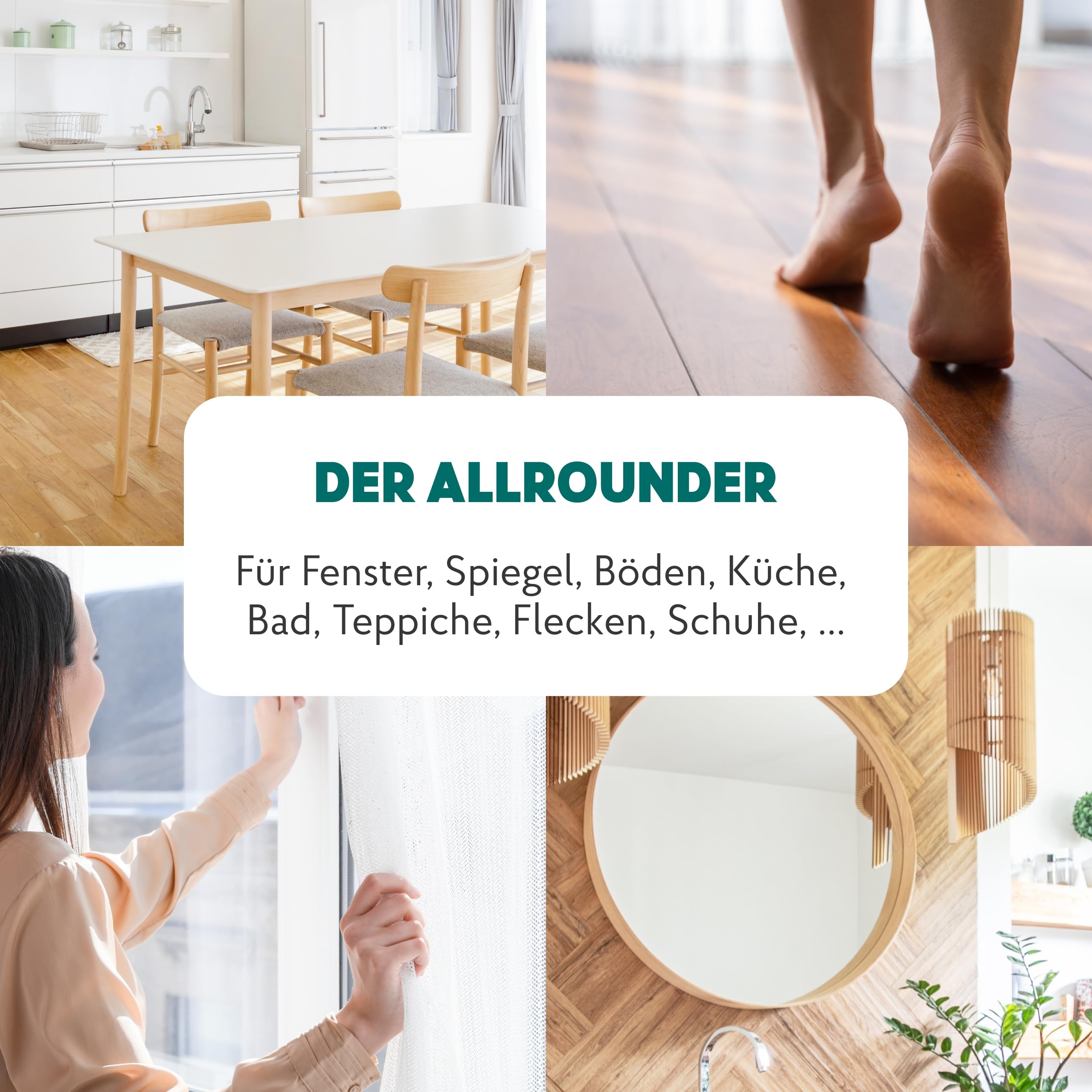 • UNIVERSALREINIGER FÜR 1.000 ANWENDUNGEN: Für Oberflächen, Fenster, Böden, Küche, Bad, Kinderzimmer, Spielzeug, Auto, Autositze, Fahrrad, Schuhe, Grill, Camping, Spülen, Flecken in Textilien, Fell deines Haustieres und vieles mehr.