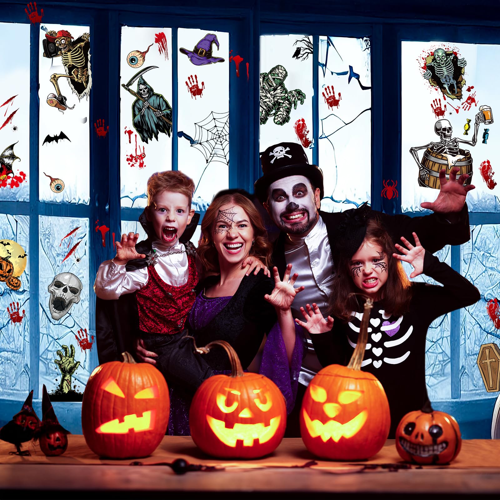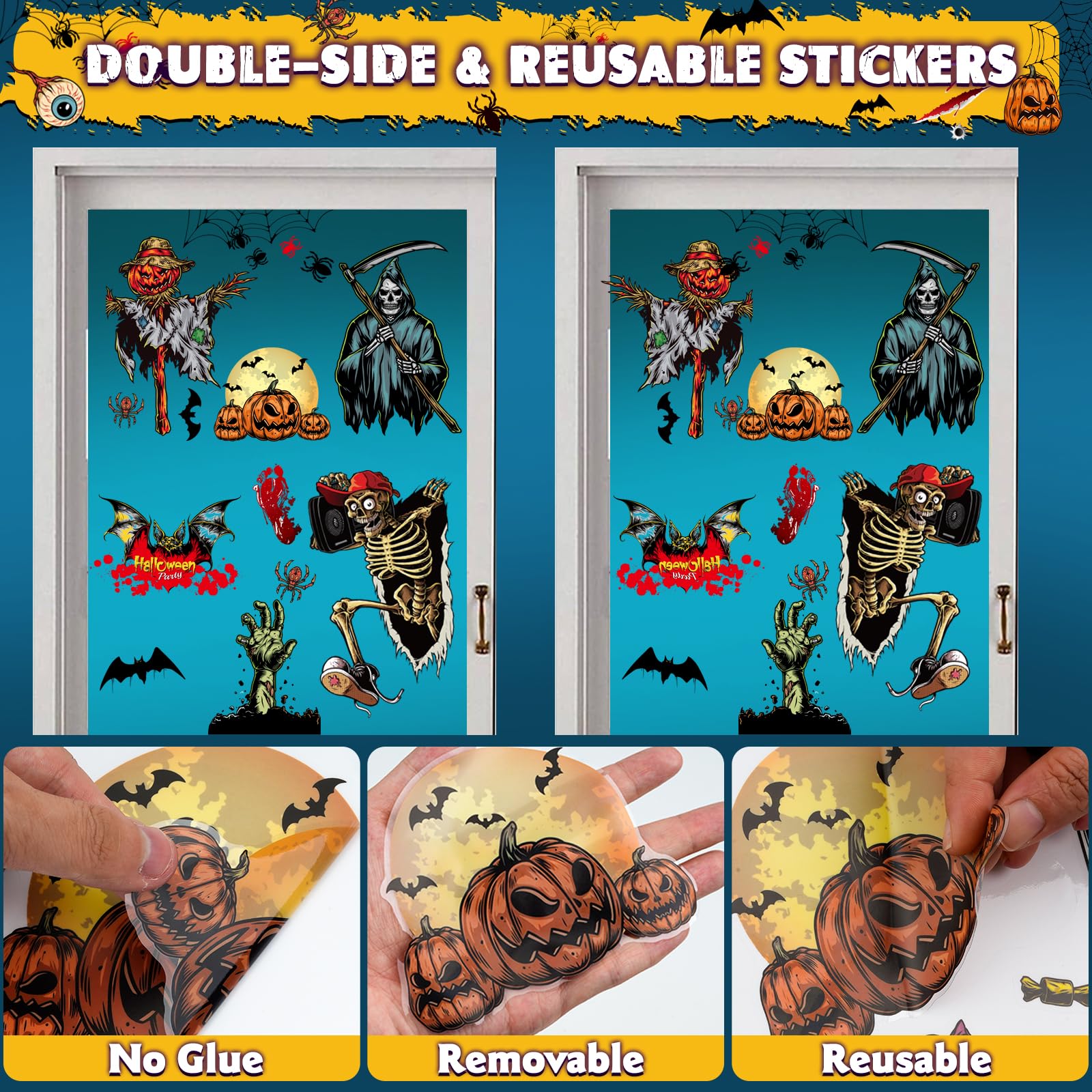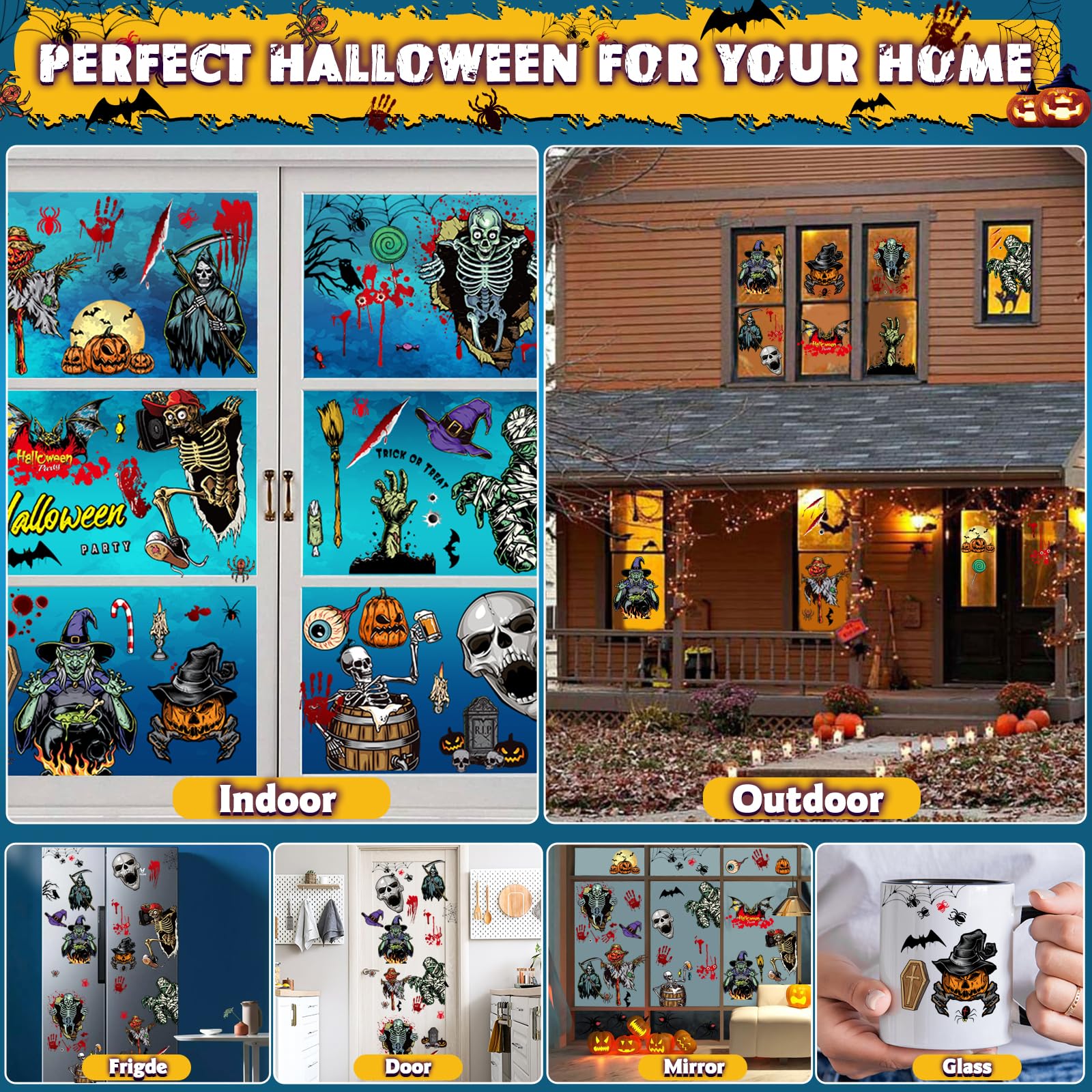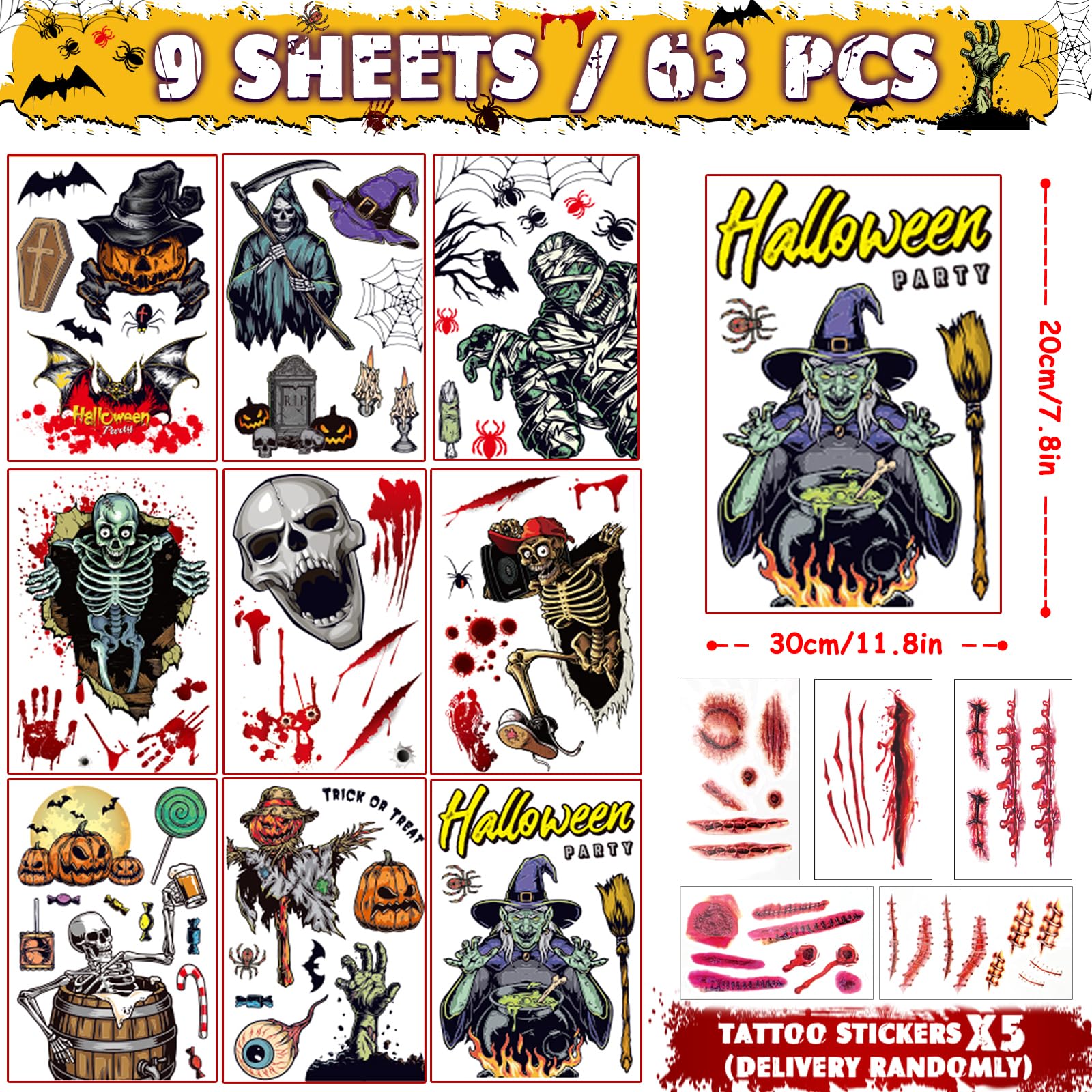Halloween Deko Fensteraufkleber 9 Blätter 63pcs Halloween Fensterbilder Sticker mit Narben Tattoo, Kürbis Schädel Hexe Fledermaus Aufkleber Selbstklebende Abnehmbare Fensterdeko für Party Dekoration