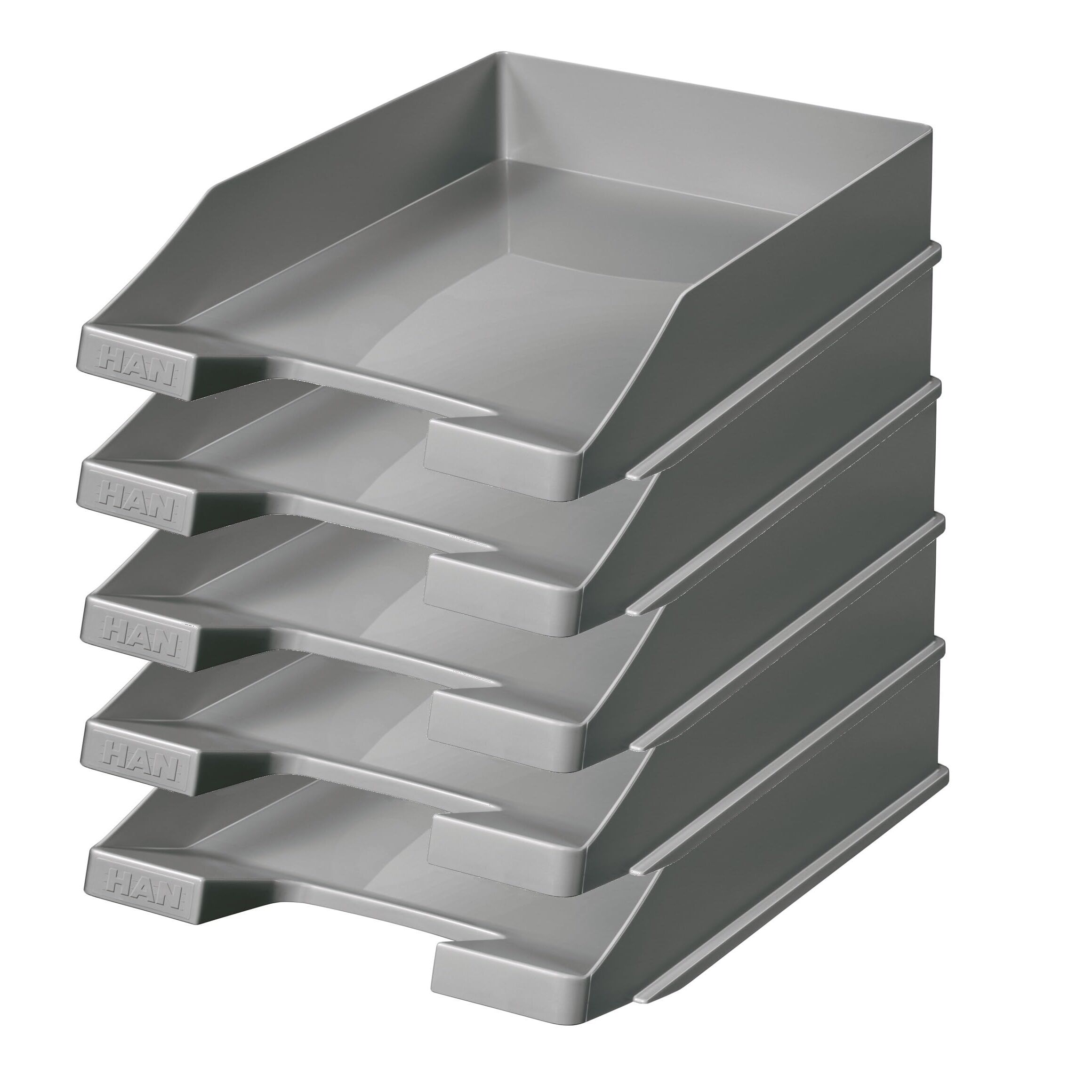 Die HAN Briefablage KLASSIK befreit nicht nur vom Papierchaos und sorgt für Ordnung auf dem Schreibtisch, sondern ist mit dem klassischen Design auch ein echter Hingucker im modernen Büro. Es lassen sich Unterlagen bis zum Format DIN A4/C4 bequem und übersichtlich verstauen. Die leicht angeschrägte Vorderfront verhindert das Herausrutschen der UnterlagenPlatzsparendes Ablagesystem: Die Ablagekörbe sind senkrecht oder versetzt stapelbar und bilden so das ideale Ordnungssystem für Schreibtisch oder Regal. Kompatibel mit allen gängigen Briefablagen.Der breite Griffausschnitt der Briefablage sorgt für leichte Orientierung und einen optimalen Zugriff auf die Unterlagen. Professionell beschriftbar mit den optionalen Beschriftungsclips (Art.-Nr. 1021)