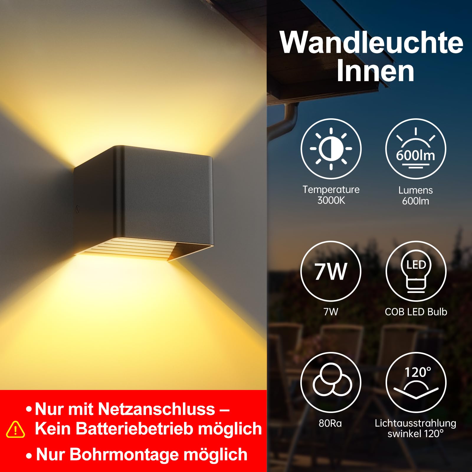 LED Wandleuchte Innen - Schwarz Wandlampe innen 7W Up and Down leuchten innen Moderne LED Aluminium Wandleuchten Für Wohnzimmer, Schlafzimmer, Flur, Balkon, Treppenhaus - Warmweiss 3000K