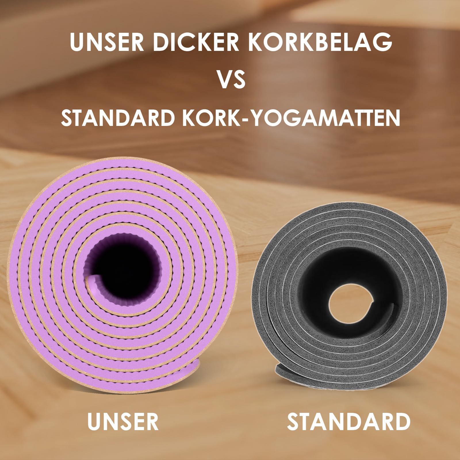 • 【Natürliche Kork-Yogamatte】 Die Kombination aus Highland-Holz und umweltfreundlichem TPE-Material,die sehr robust sind. Besonders auf verschwitzten Händen oder am Körper kann man die Korkmatte besser greifen. Kork enthält Suberin, das ist wachsartige, griffige Substanz, die bei Nässe freigesetzt wird.