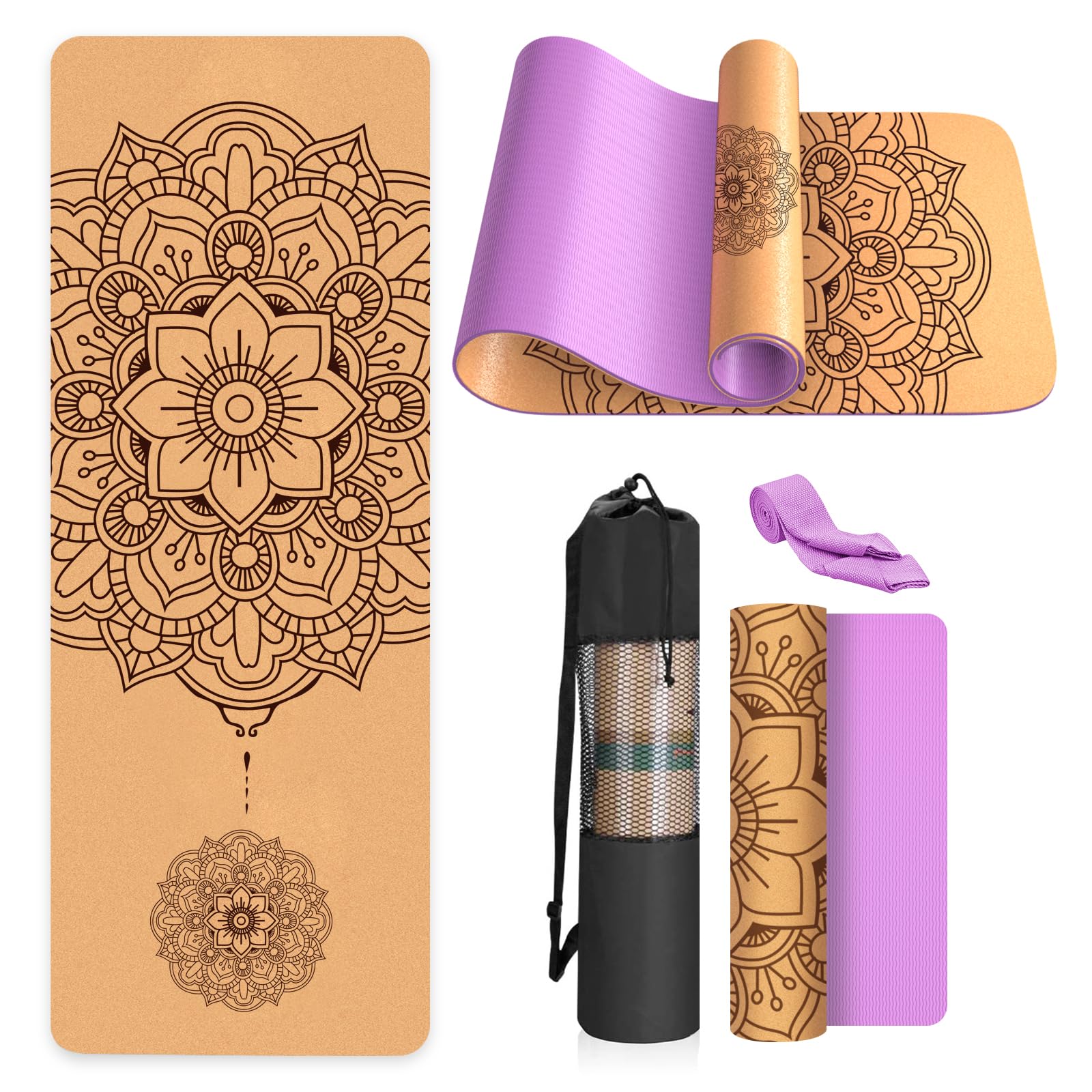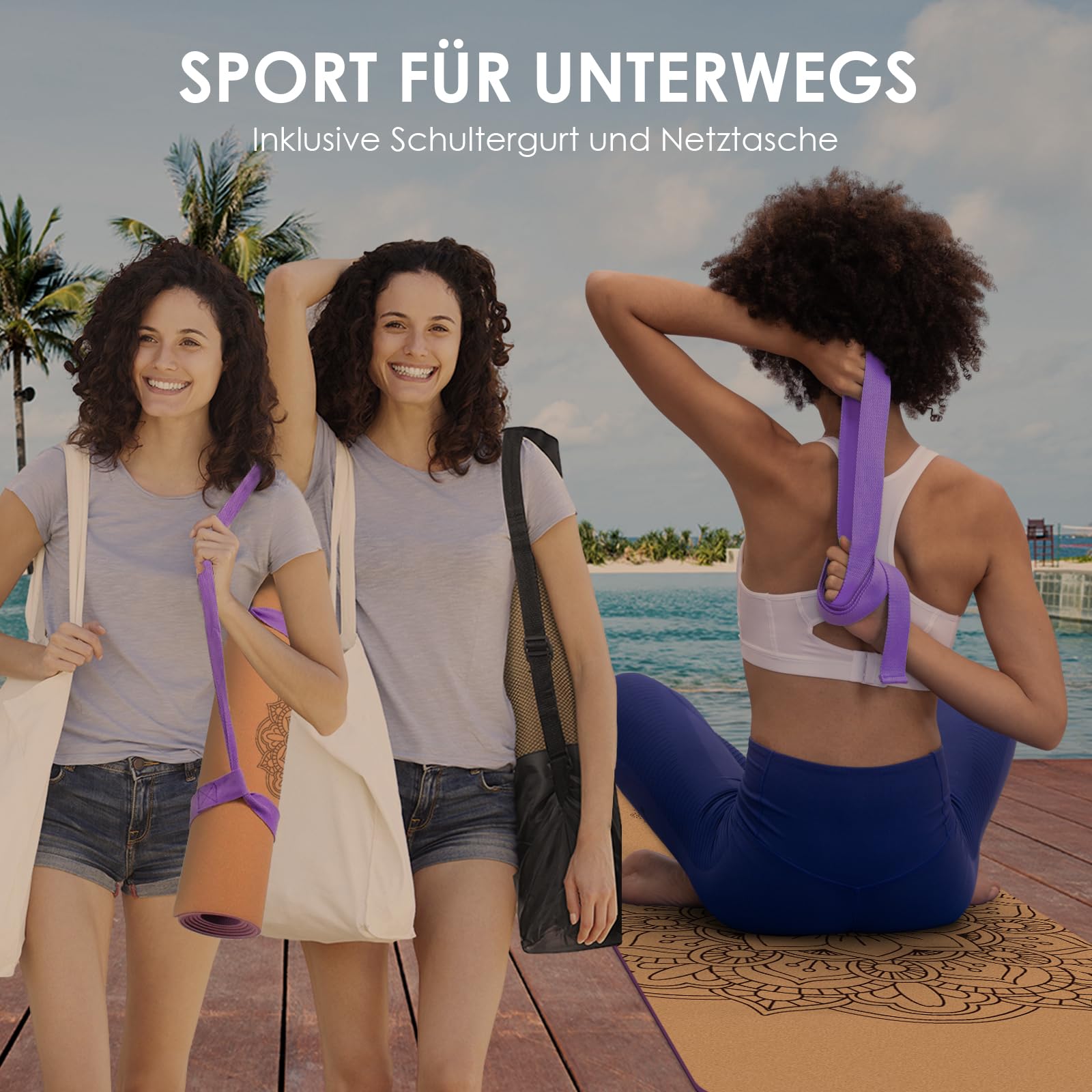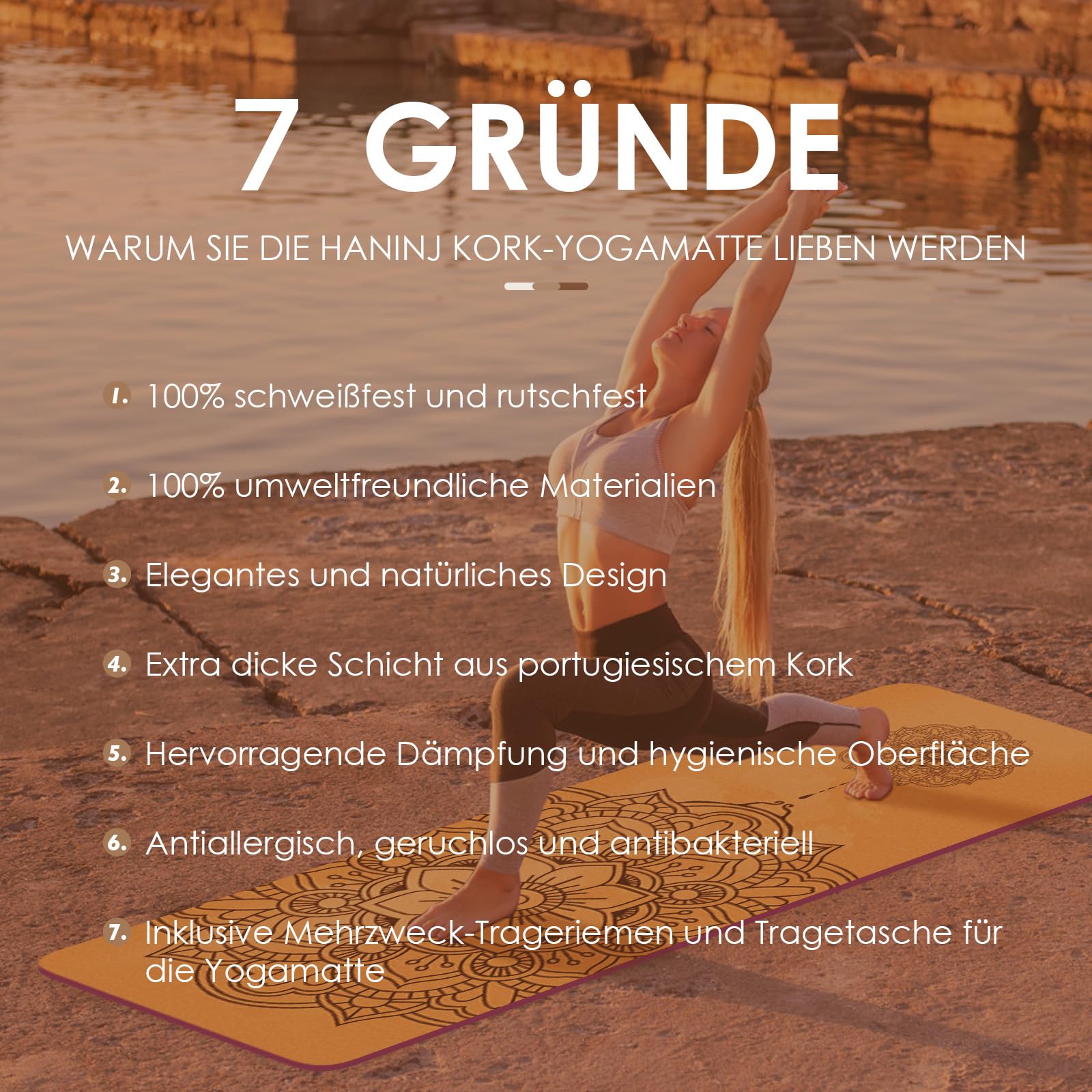 Haninj® Yogamatte-Kork, Rutschfest, Einzigartiges Design, Extradick Natürlicher Kork, TPE Fitness-Trainingsmatte mit Tragetasche und Gurt, für Zuhause, Pilates, Aerobic Fitnessstudio und Workout
