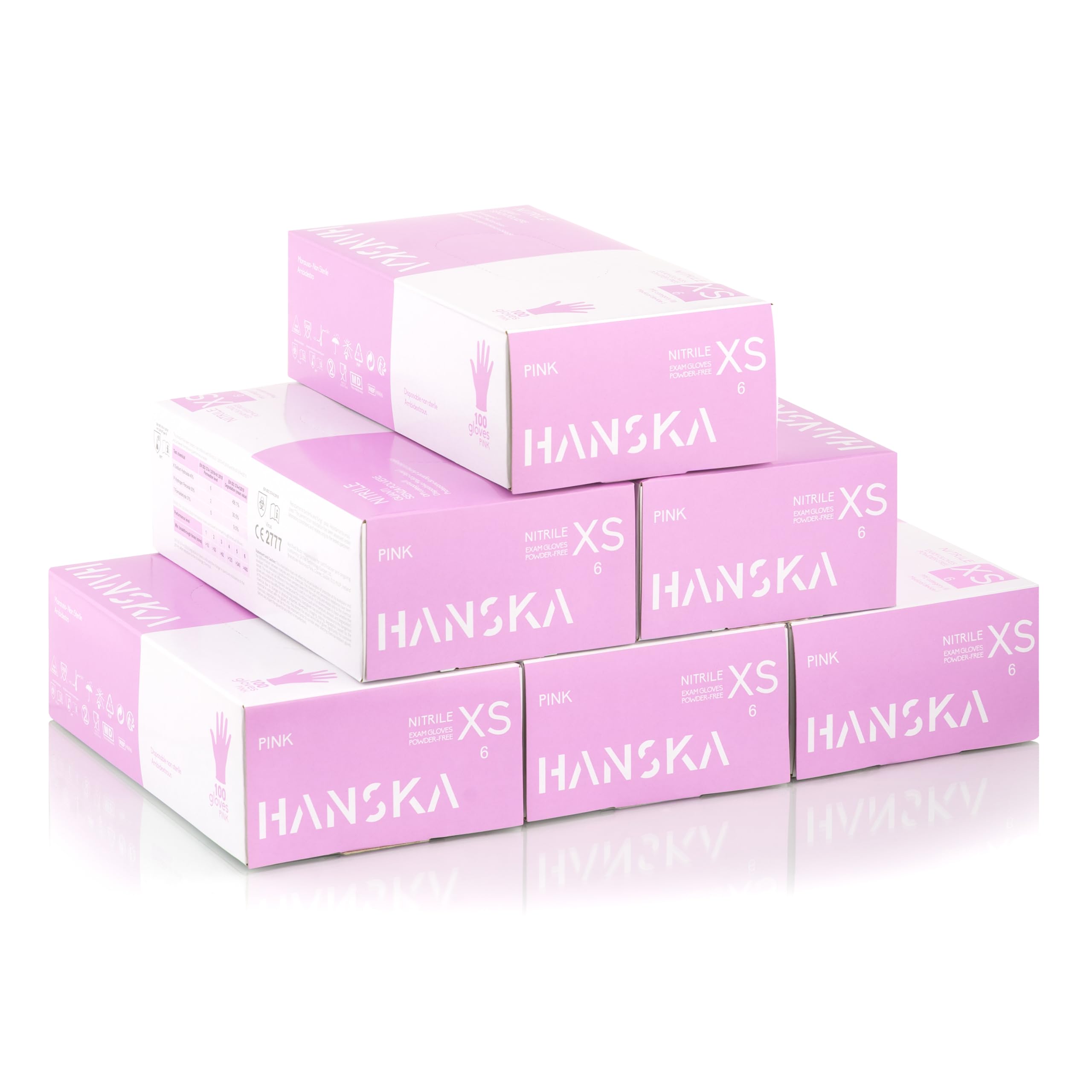 HANSKA 500 Einweg-Nitrilhandschuhe, rosa – puderfrei – Einweg – beidhändig tragbar – unsteril – Gummibasis – Geeignet für medizinische Bereiche und Lebensmittelverarbeitung (500, XS)