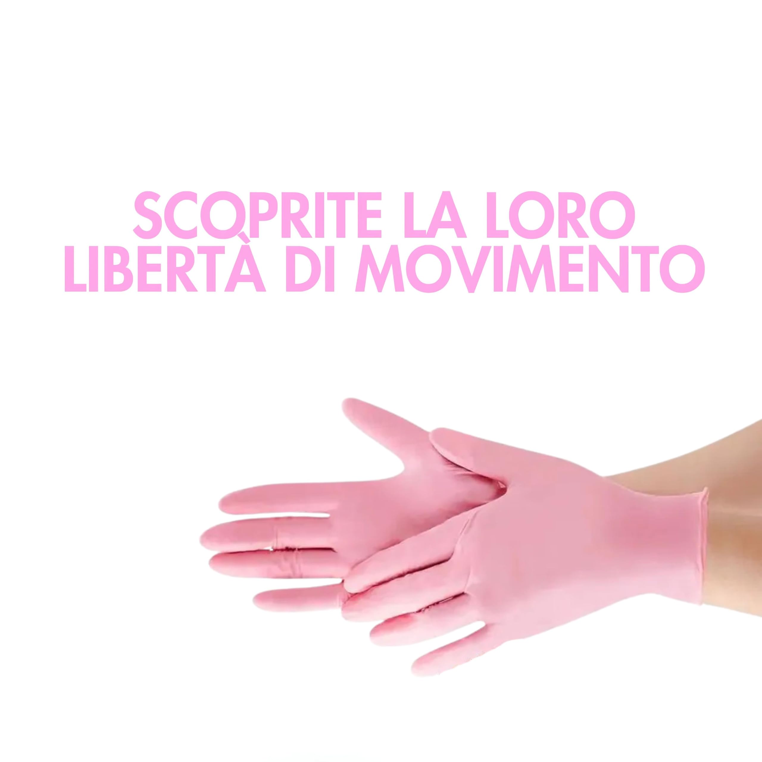 Unsterile Einmalhandschuhe aus Nitril (NBR). Latexfrei, einteilig, elastisch, puderfrei. Rosafarbene Einweghandschuhe aus Nitril, unsteril, beidhändig tragbar. Grössen XS/S/M/L.