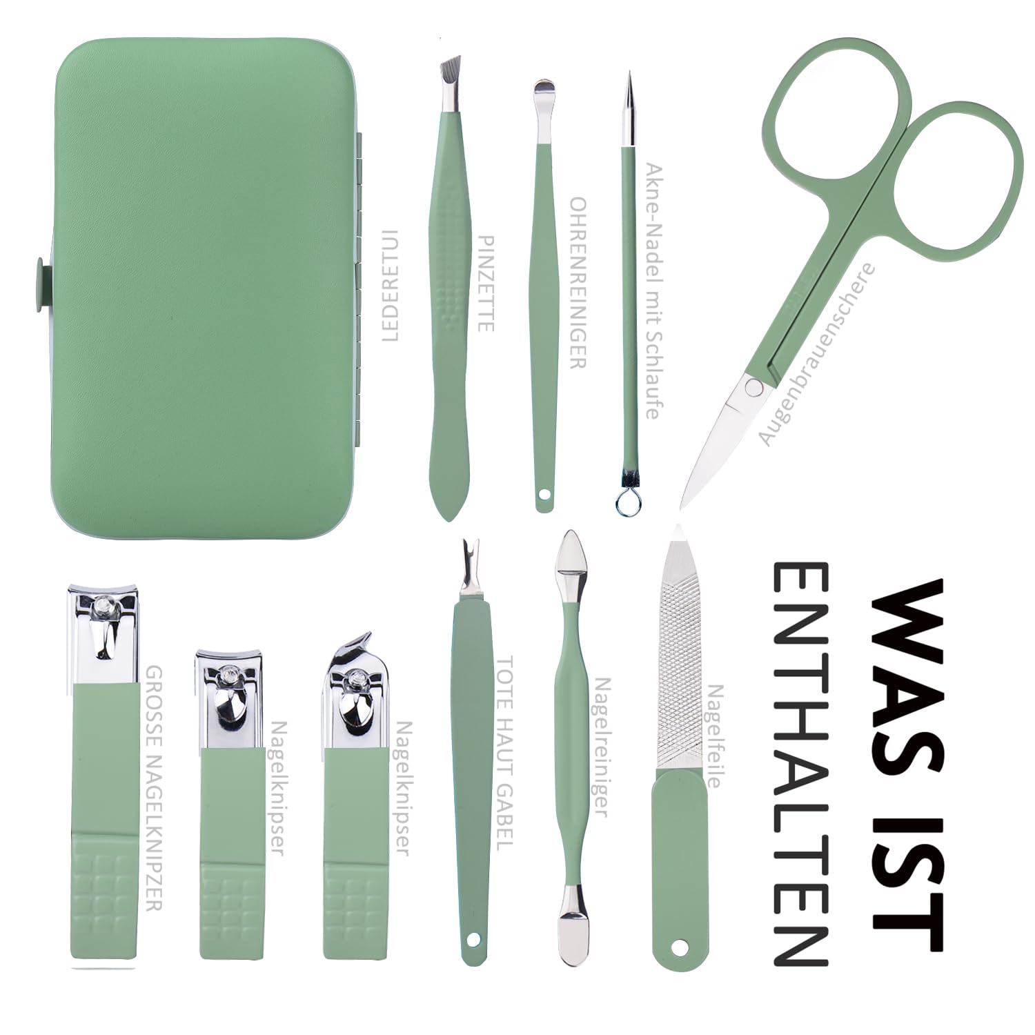 HANTEKAS Manikuere Set 10 in 1 Edelstahl – Reise Nagelpflege Set mit Lederetui Jadegruen