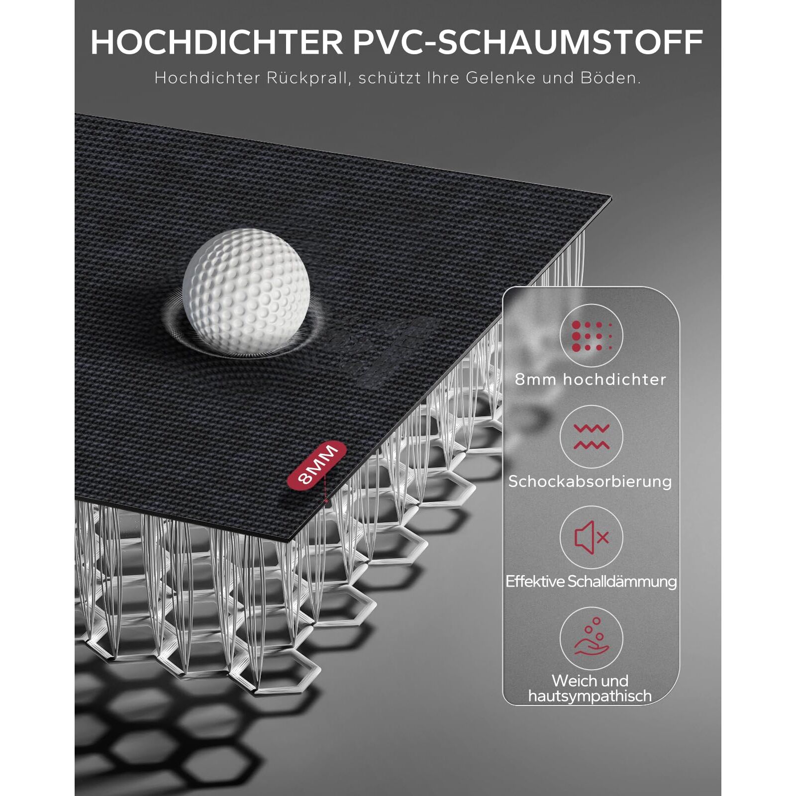 Die HAPBEAR-Sportmatte besteht aus hochdichtem PVC und ist breiter als eine normale Yogamatte. Mit einer Dicke von bis zu 8 mm ist sie dicker als die meisten Matten auf dem Markt, weich und hautfreundlich. Die Oberseite der Matte besteht aus einer gewellten Netzstruktur und die Unterseite aus einer Saugnapfstruktur, sodass sie rutschfest ist, Stösse dämpft, Geräusche reduziert, wasserdicht und leicht zu reinigen ist. Sie ist ausserdem sehr vielseitig einsetzbar: als Fitnessmatte, Teppich, Unterhaltungsmatte, aber auch als Gerätematte. Mit ihr müssen Sie nicht mehr ins Fitnessstudio gehen, um zu trainieren, sondern können das Fitnessstudio-Erlebnis in weniger als 60 Sekunden geniessen. Mit ihr ist Ihr Boden geschützt. Ausserdem ist sie ungiftig und umweltfreundlich. Sie können mit oder ohne Schuhe trainieren.