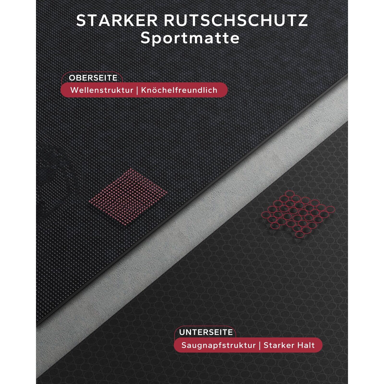 HAPBEAR Sportmatte ist aus hochdichtem PVC hergestellt, das breiter ist als eine normale Yogamatte. Dicke bis zu 8 mm, dicker als die meisten Matten auf dem Markt, weich und hautfreundlich. Die Oberseite der Matte ist eine gewellte Netzstruktur und die Unterseite ist eine Saugnapfstruktur, so dass sie die Vorteile von rutschfest, langsam Schock, Lärm zu reduzieren, wasserdicht, leicht zu reinigen und so weiter hat. Sie ist auch sehr vielseitig, sie ist eine Fitnessmatte, ein Teppich, eine Unterhaltungsmatte, aber auch eine Gerätematte. Mit ihr müssen Sie nicht mehr ins Fitnessstudio gehen, um zu trainieren, sondern können das Fitnessstudio in weniger als 60 Sekunden geniessen. Durch den Besitz dieser Matte wird Ihr Boden geschützt und sie ist ungiftig und umweltfreundlich. Sie können mit oder ohne Schuhe trainieren.
