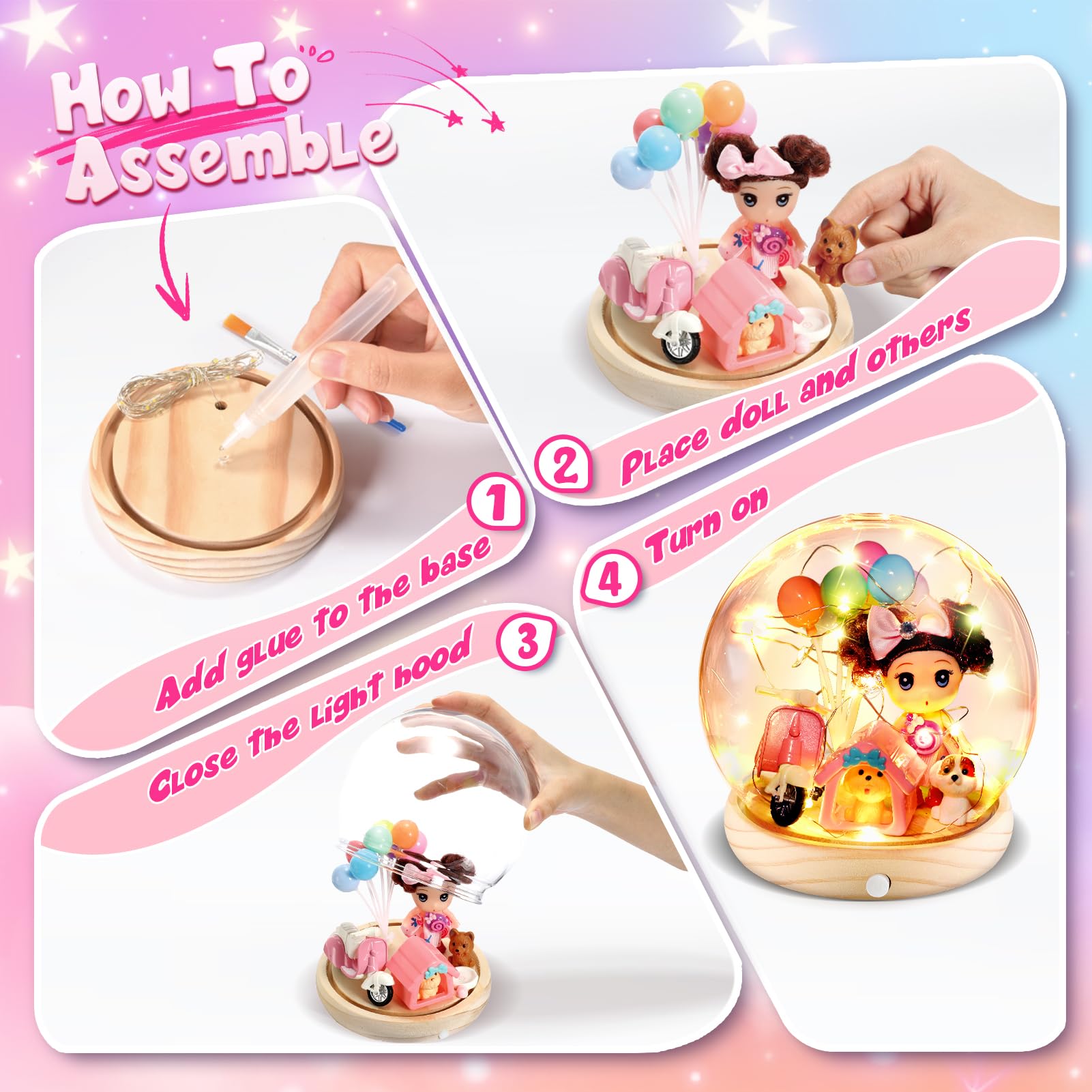 HappyGoLucky DIY Prinzessin Bastelset Kinder - Mädchen Spielzeug Geschenk ab 3-10 Jahre - DIY Nachtlicht Kinder - Sockel aus Holz - mit 15+ Zubehörteilen, Personalisierbares Schlafzimmerlicht