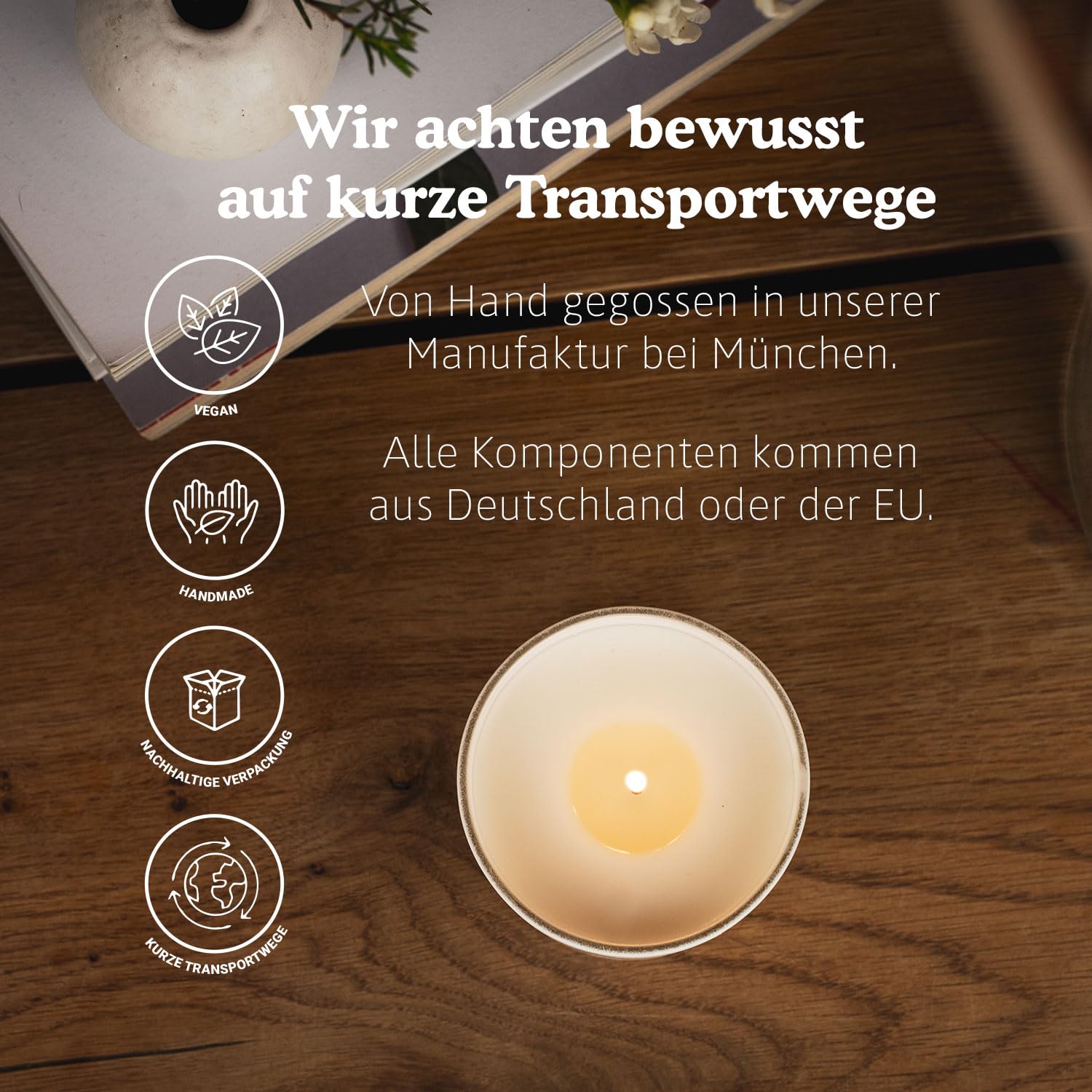 Wir legen grossen Wert auf Umweltfreundlichkeit, deshalb ist unsere Kerze aus GMO-freiem Sojawachs hergestellt. Ein bewusster Genuss für dich und die Umwelt.