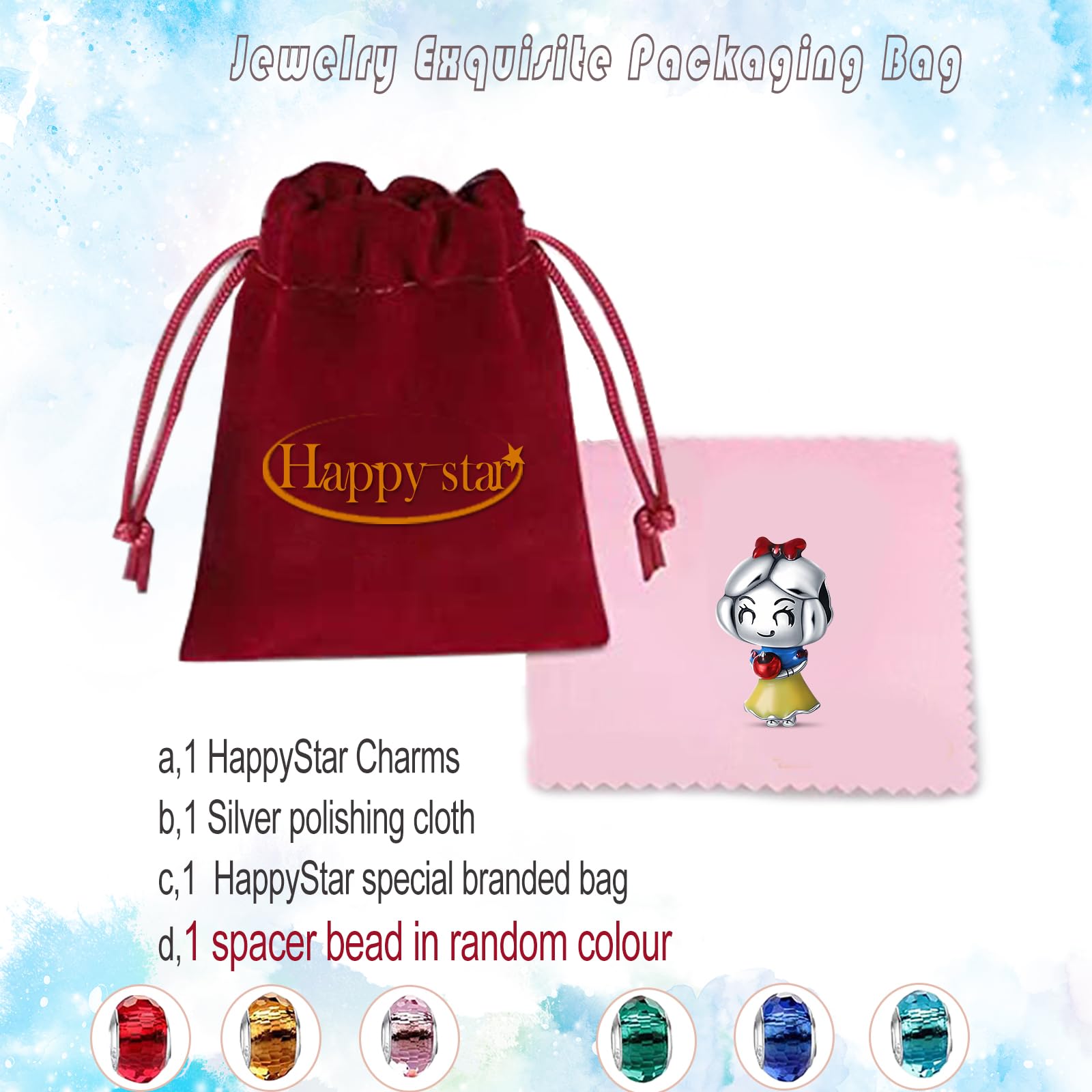 - Verpackung: 1 HappyStar-Anhänger,1 kostenlose Abstandsperlen, 1 Silbertuch und 1 HappyStar-Geschenktasche