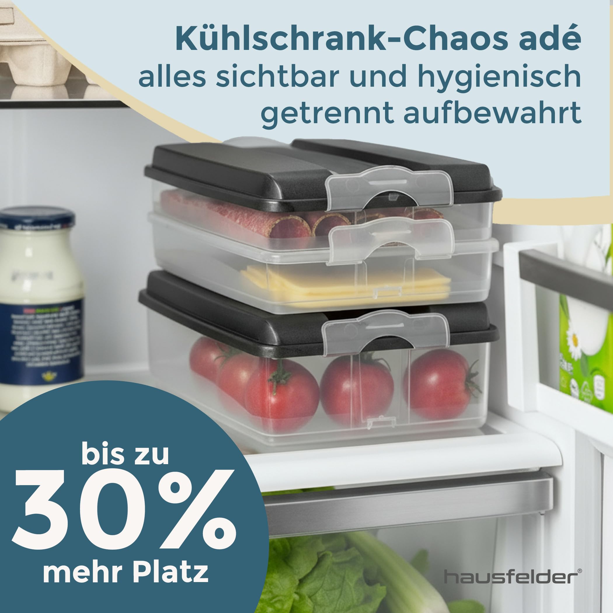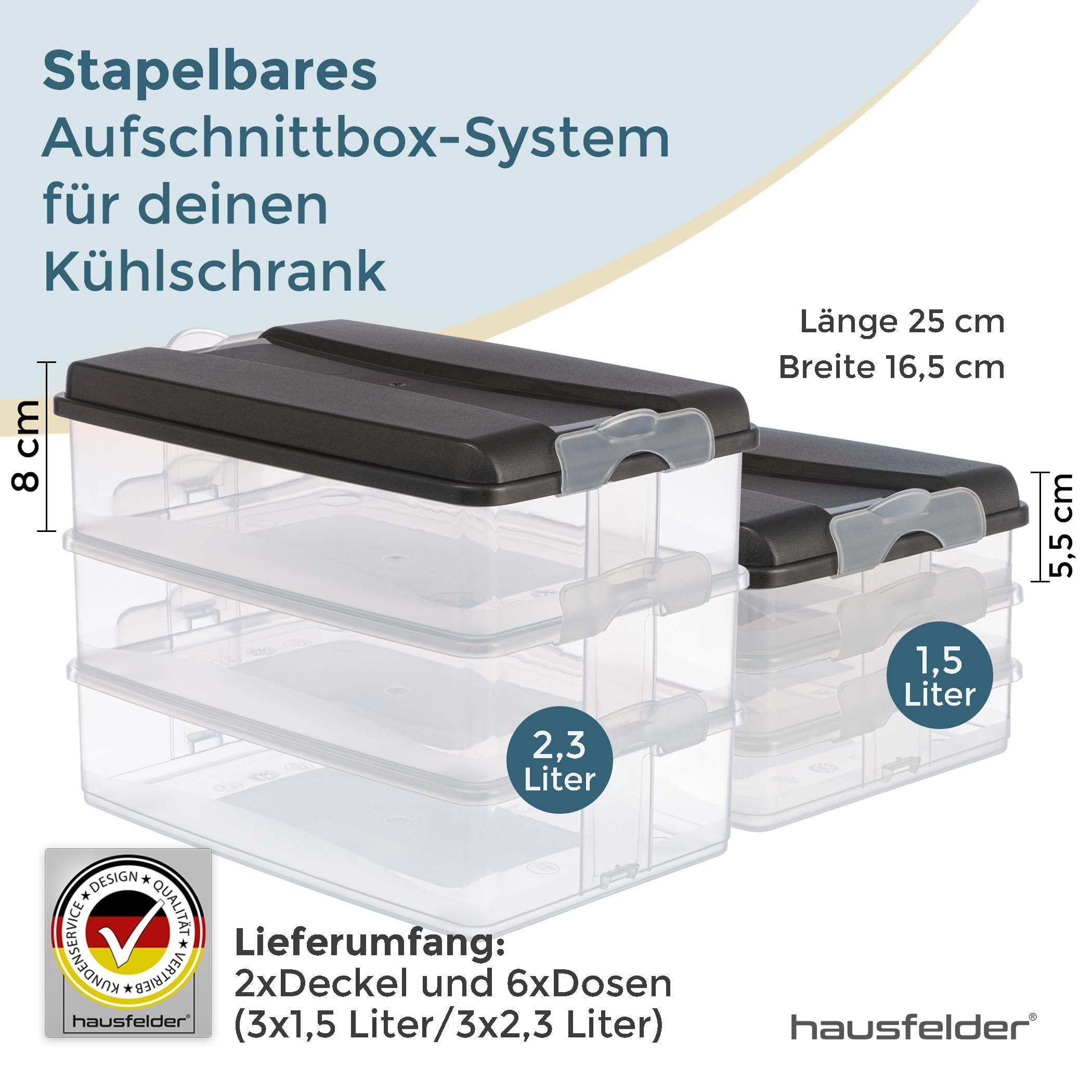 Hausfelder Aufschnittdosen für Kühlschrank, Aufschnittbox stapelbar, Kühlschrank Organizer mit Deckel (Anthrazit, 3x2,3L + 3x1,5L)