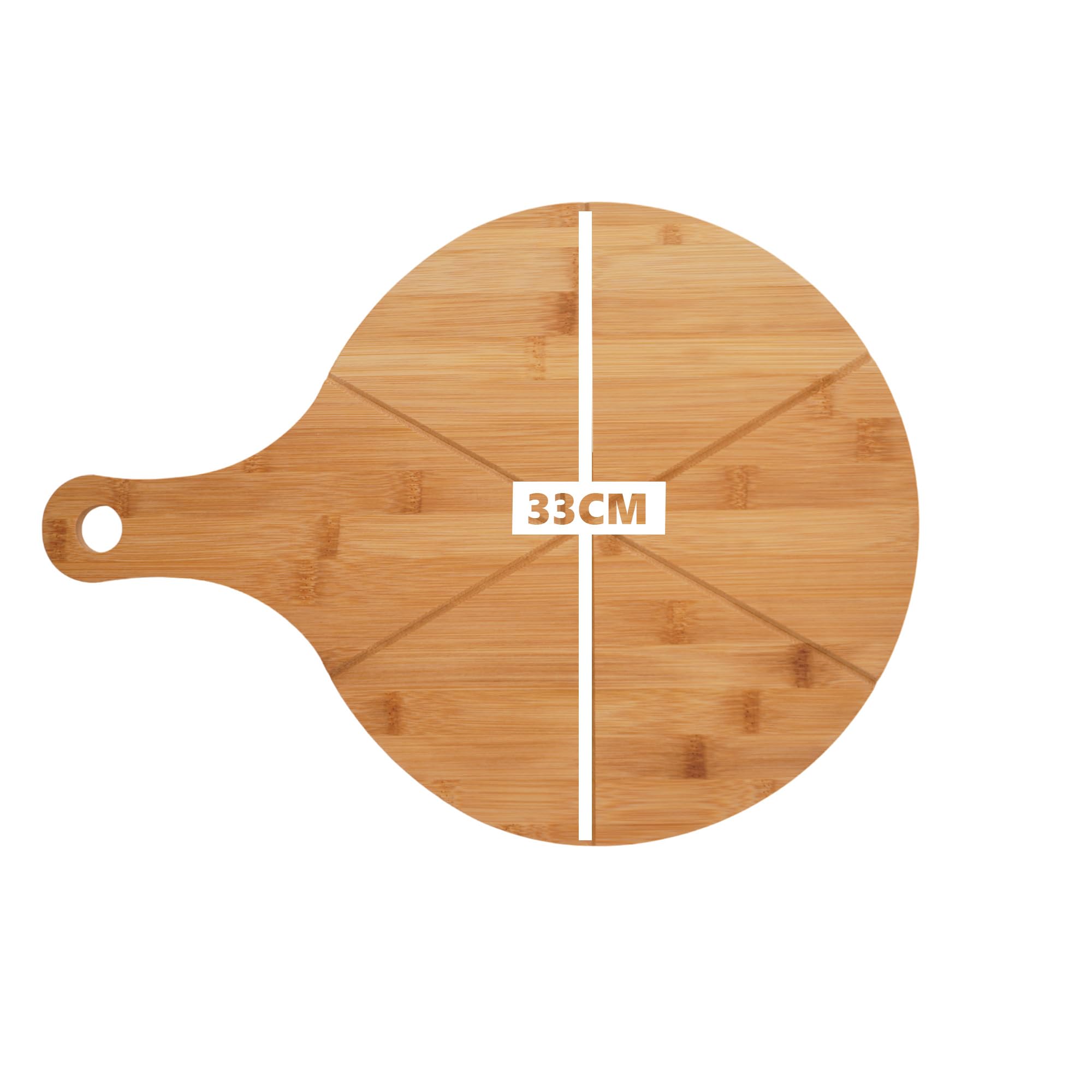 Pizzateller aus Bambus | Ø 33 cm | Rundes Schneide- und Servierbrett mit GriffUnser Pizzateller aus Bambus ist das ideale Accessoire für alle Liebhaber perfekt präsentierter Pizzen. Mit einem grosszügigen Durchmesser von 33 cm bietet der Teller ausreichend Platz für köstliche Kreationen. Der integrierte Griff verleiht dem Teller nicht nur eine elegante Note, sondern erleichtert auch das komfortable Servieren Ihrer Lieblingsgerichte.Die Gesamtabmessungen des Pizzatellers mit Griff betragen 45x33 cm bei einer Dicke von 1,2 cm. Dieses massgeschneiderte Design sorgt für eine grosszügige Arbeitsfläche, um Ihre Pizza mühelos zu schneiden und stilvoll zu präsentieren.Hergestellt aus hochwertigem Bambus, überzeugt das Schneide- und Servierbrett nicht nur durch seine natürliche Ästhetik, sondern auch durch seine Langlebigkeit. Die feine Maserung des Bambus verleiht jedem Brett eine individuelle Note und macht es zu einem Blickfang in Ihrer Küche.Entdecken Sie die perfekte Verbindung von Funktionalität und Stil mit unserem Pizzateller aus Bambus. Geniessen Sie gesellige Mahlzeiten und präsentieren Sie Ihre kulinarischen Kreationen mit diesem eleganten und praktischen Schneide- und Servierbrett