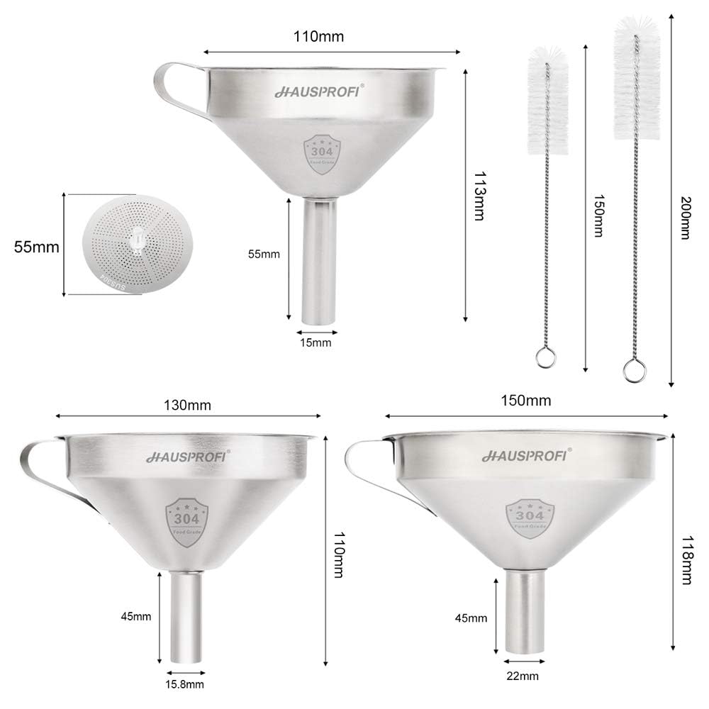 HAUSPROFI Premium Edelstahl Trichter Set (3 Grössen) mit 2 Feinsieben - Profi-Küchentrichter aus 304 Edelstahl für Flüssigkeiten, Öle, Pulver - Spülmaschinenfest, 11/13/15 cm