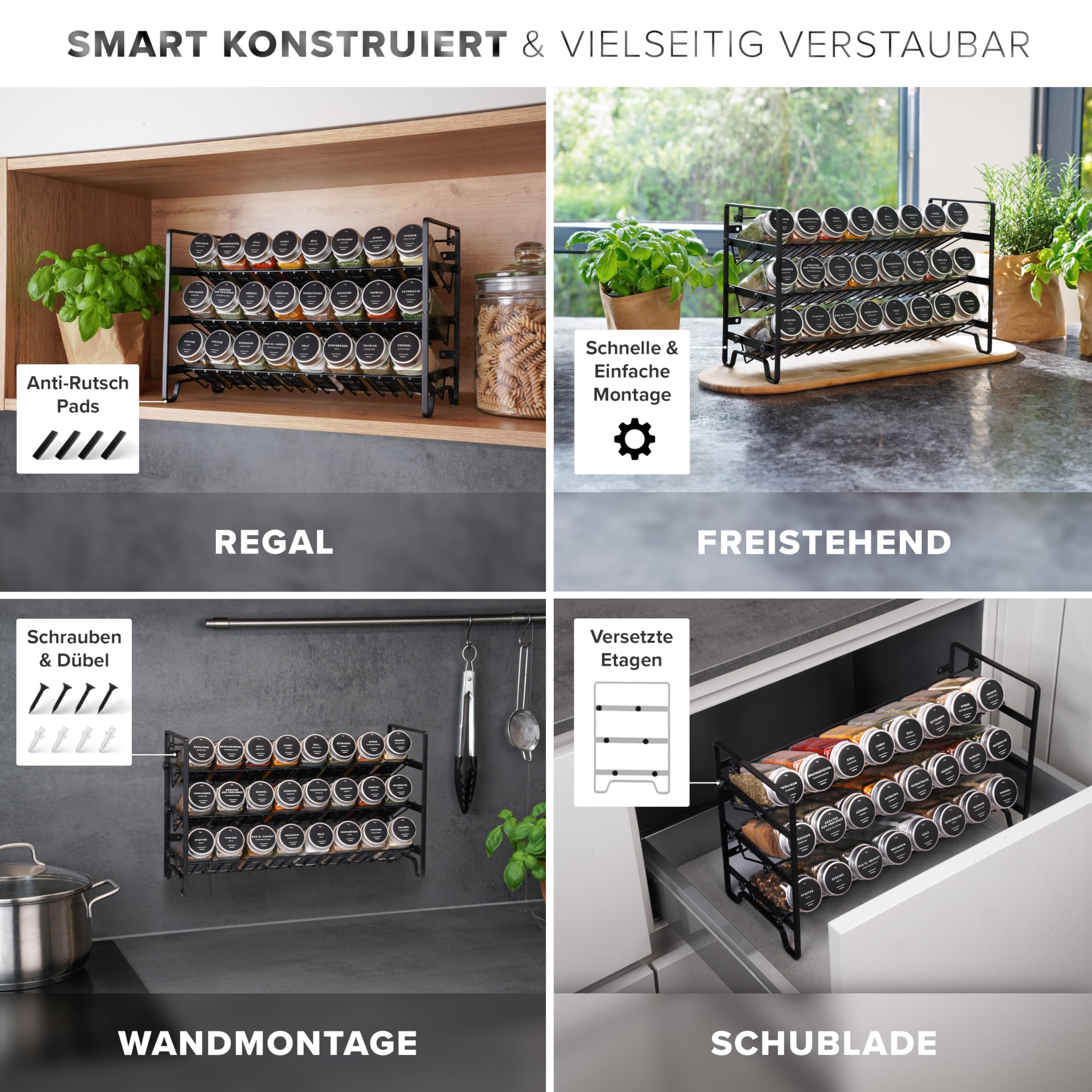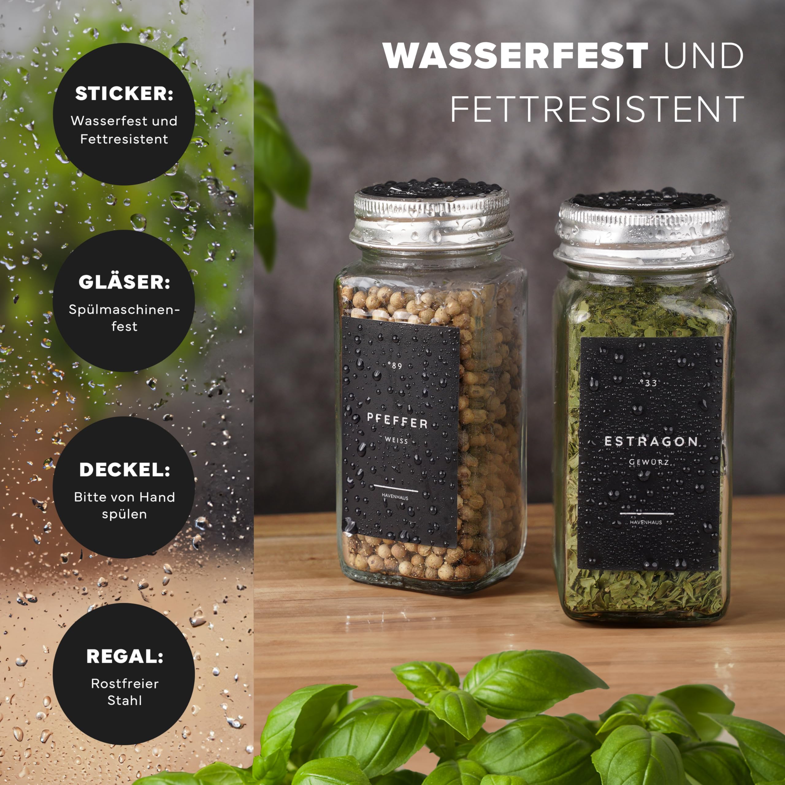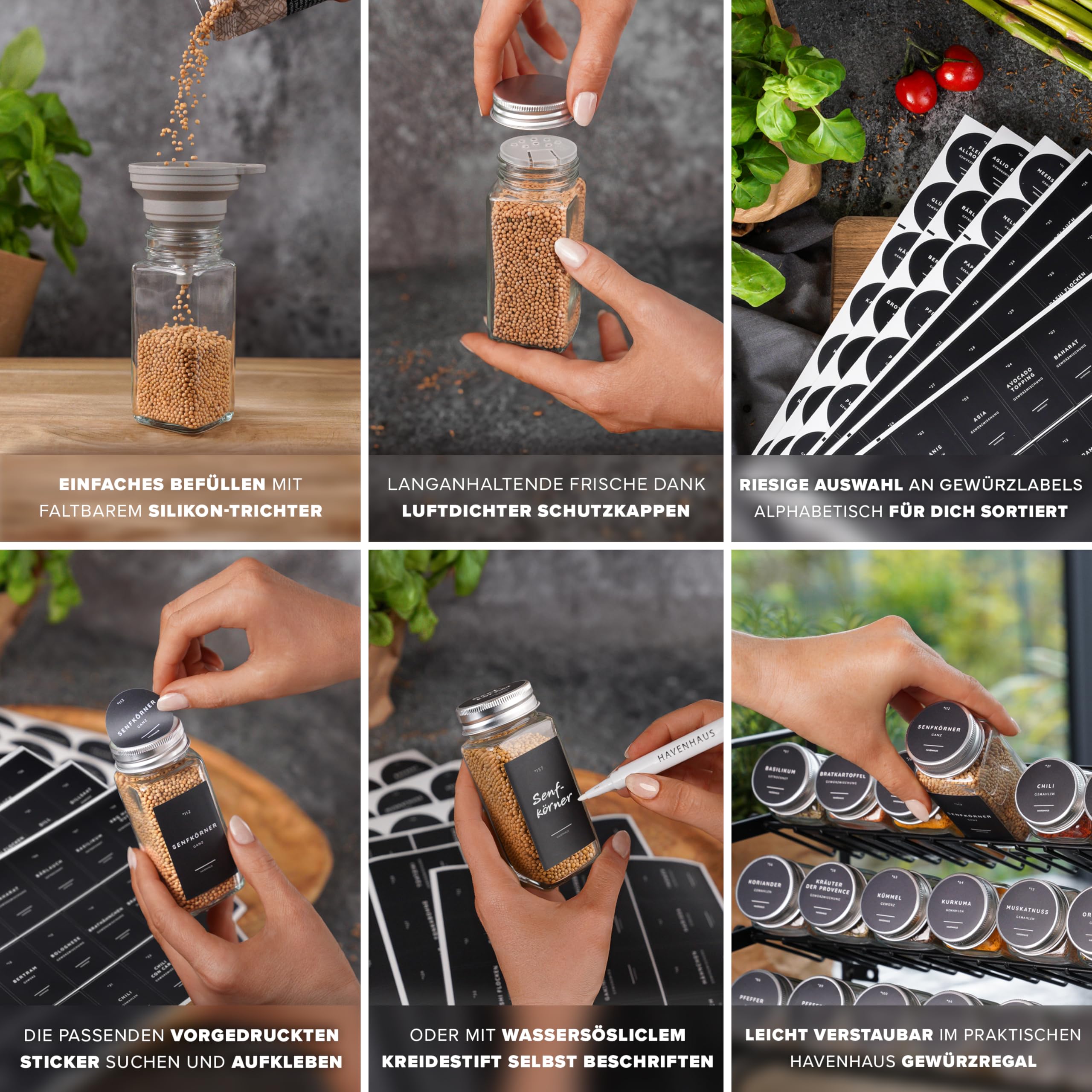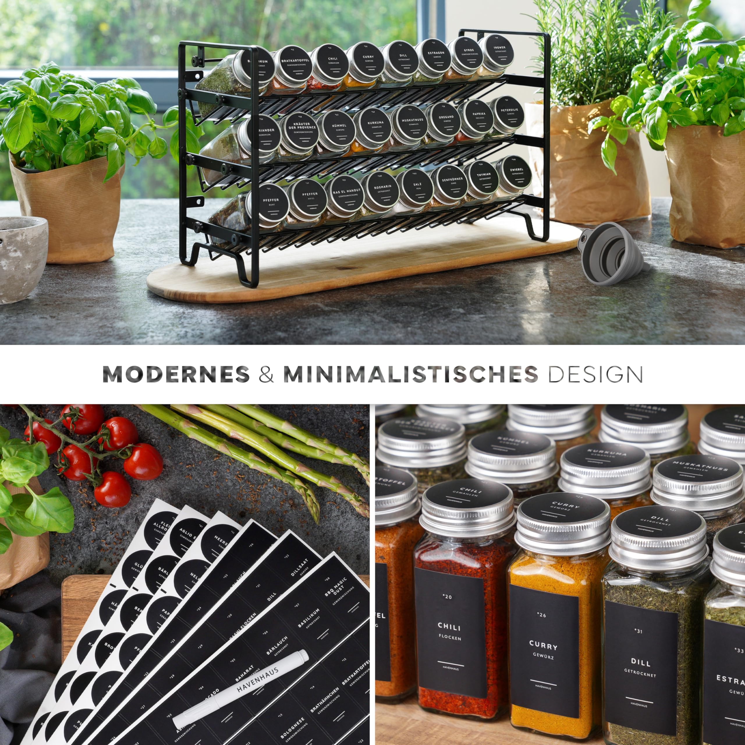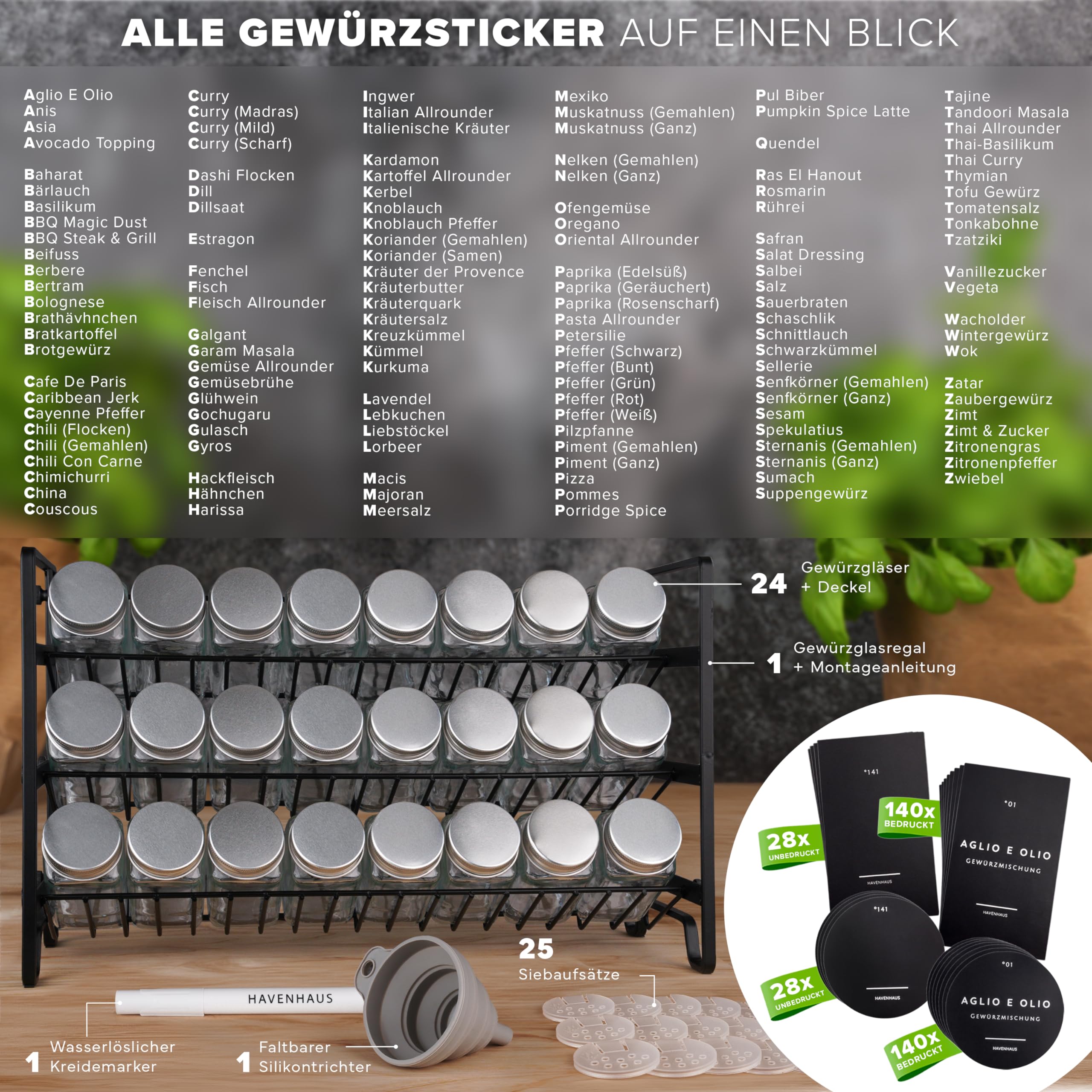 Havenhaus Gewürz regal Set | Gewürzregal stehend inkl. 24 Gewürzgläser+336 Gewürzetiketten deutsch & Accessoires | Wand oder stehend | Gewürz Organizer | Gewürzregal mit Gläsern