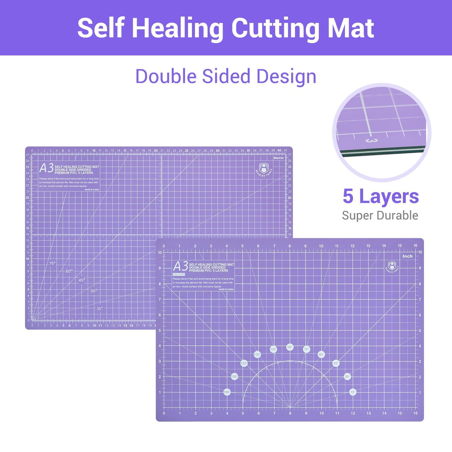 Rollschneider Set - 45mm Rollschneider Stoffschneider Set inkl. A3 Schneidematte, Ersatzklingen, Patchwork-Lineal, Stoffklammern, ideal zum Basteln, Nähen, Patchworken (Lila)