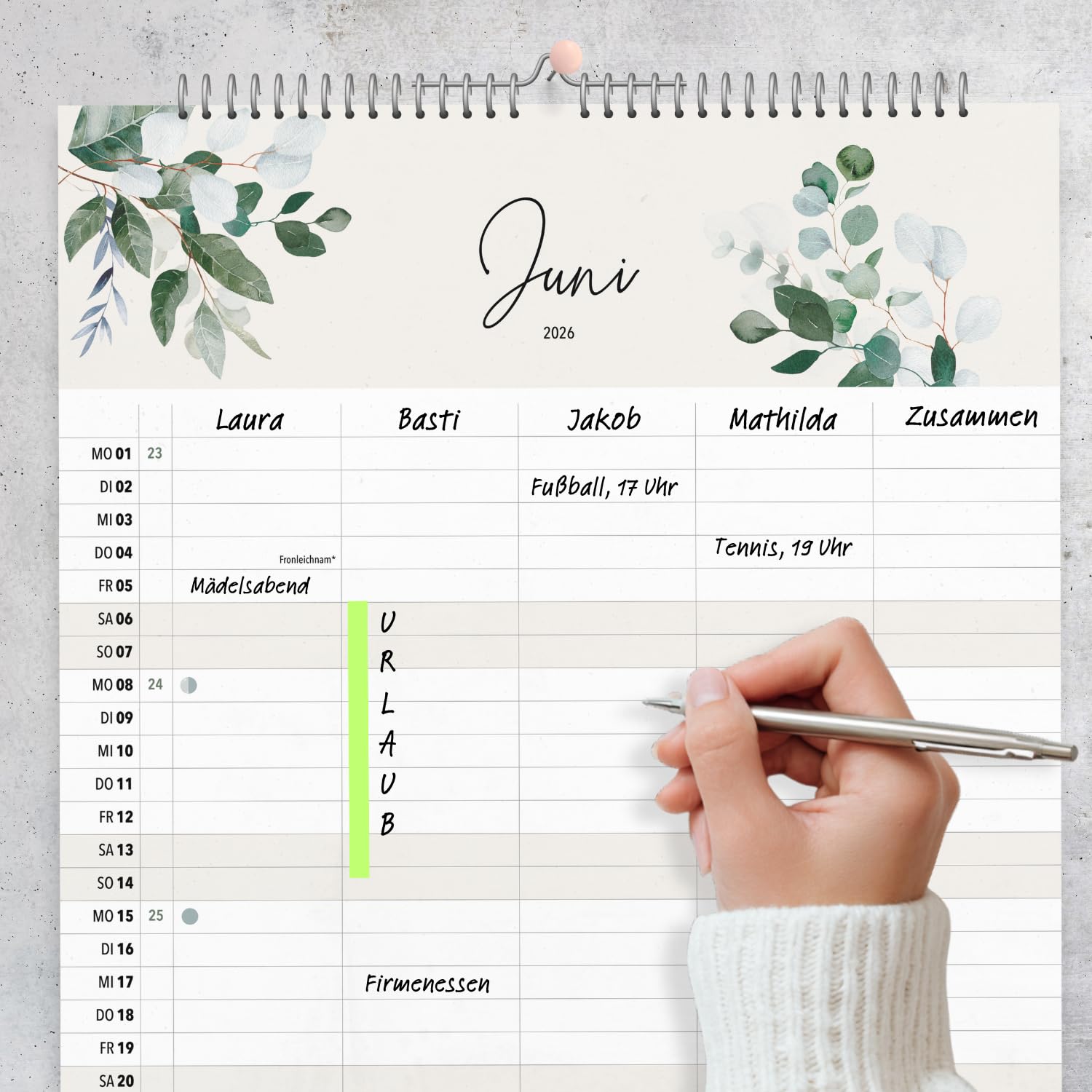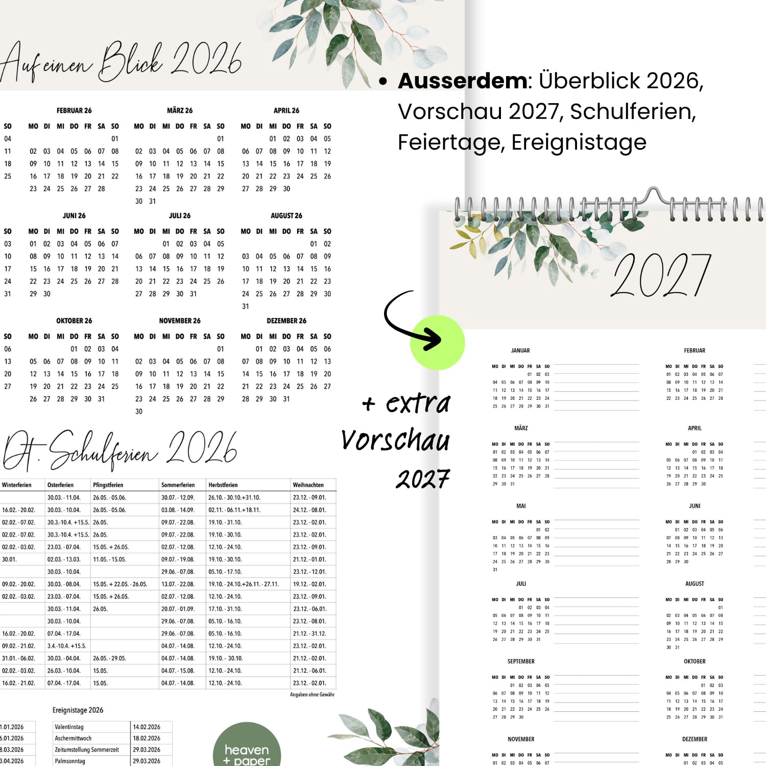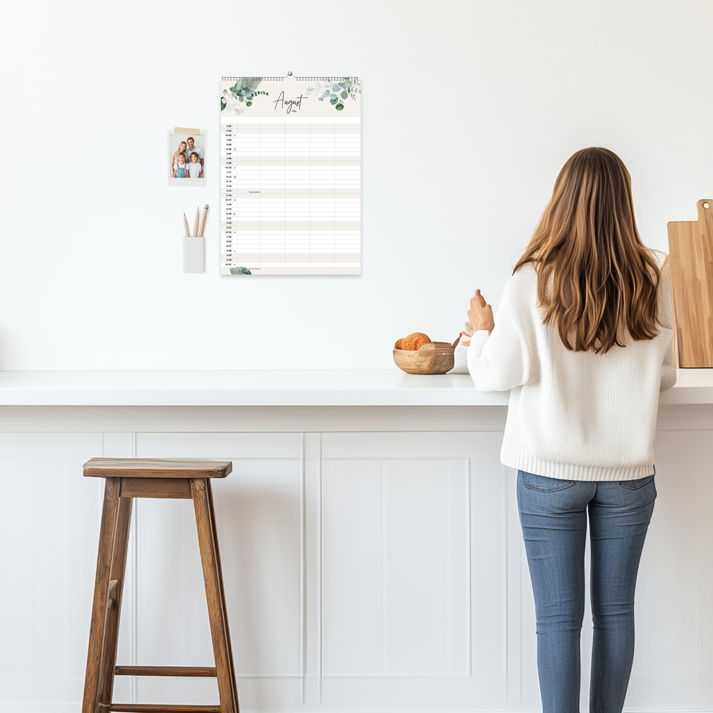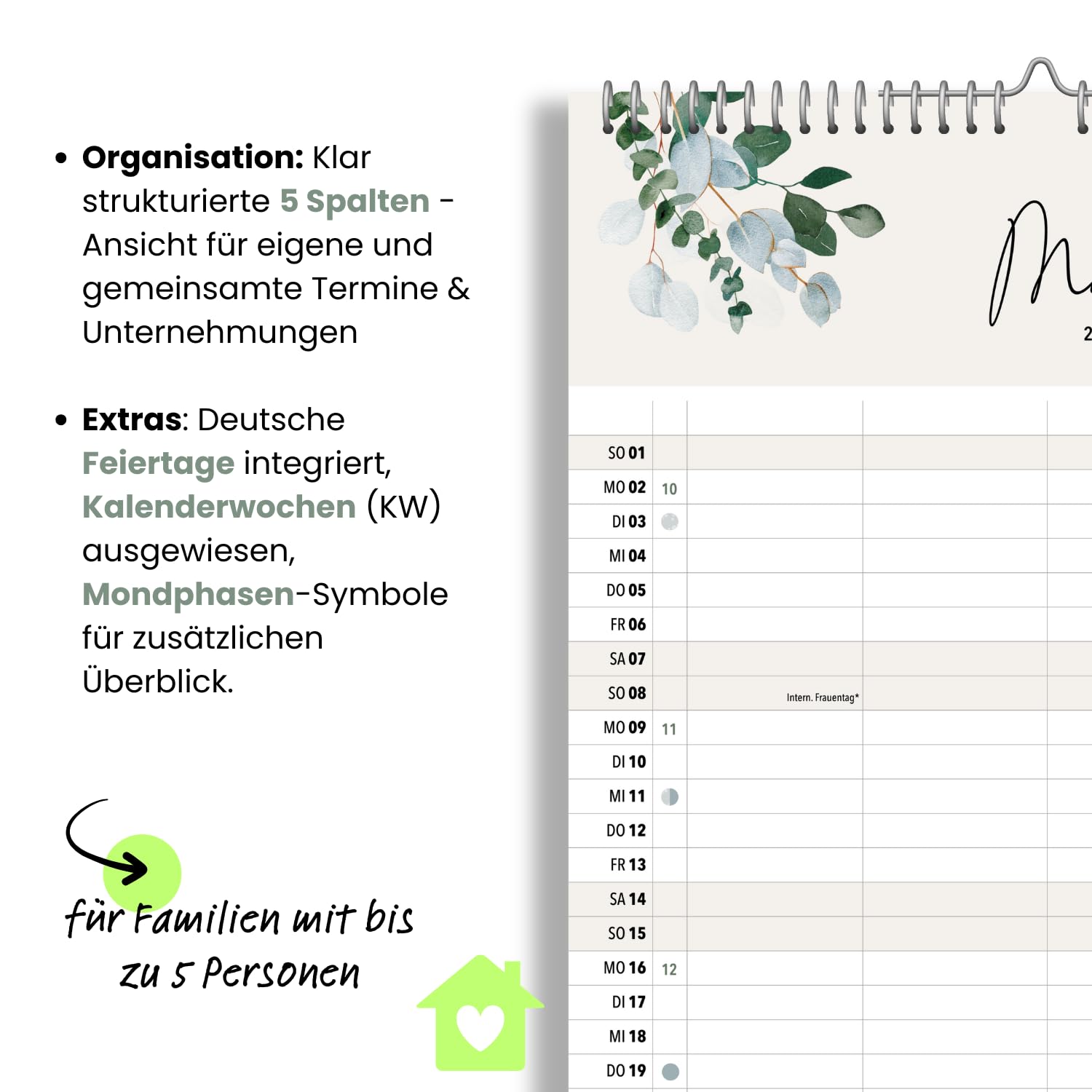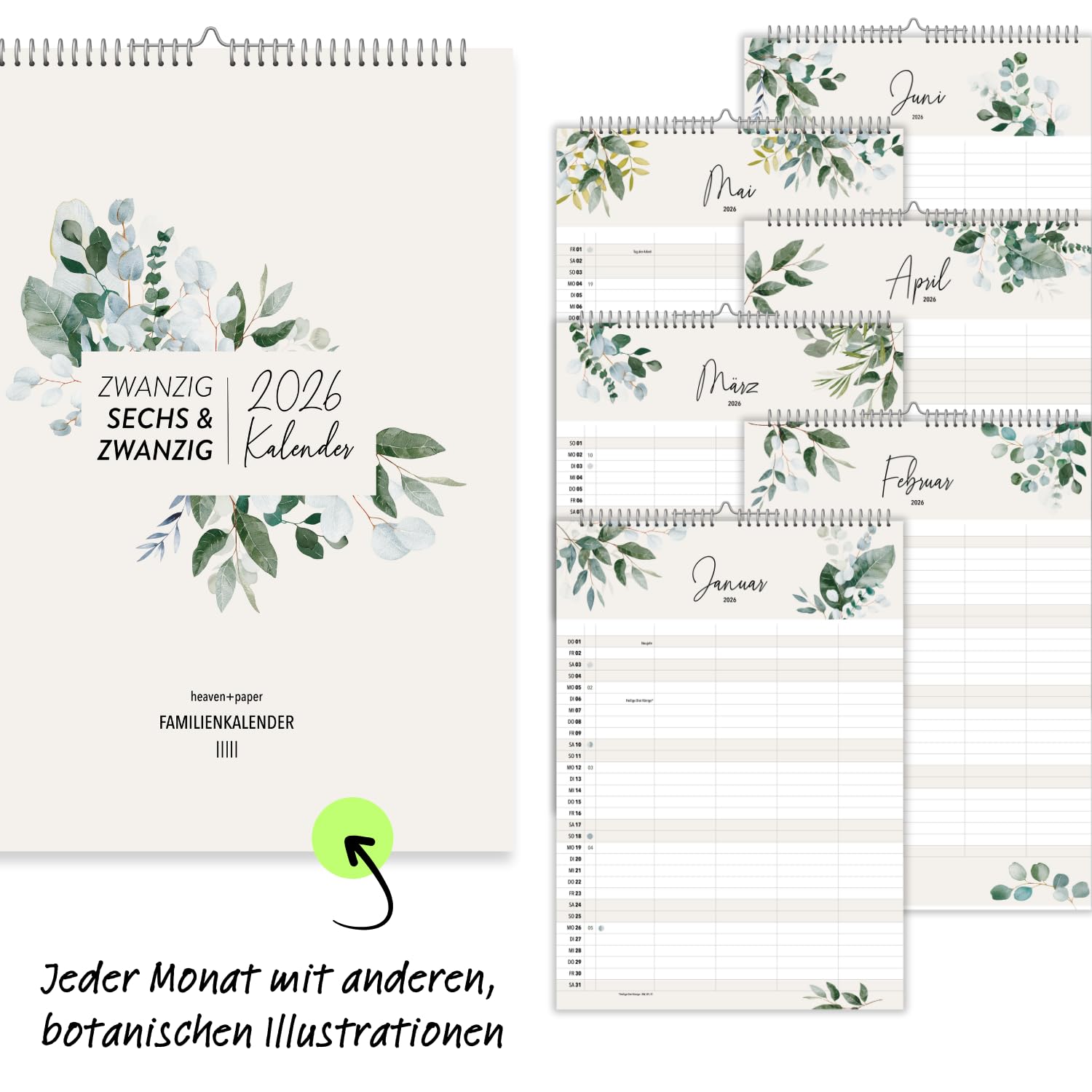 Der heaven+paper Familienplaner 2026 ist der ideale Begleiter für alle, die ihre Termine stilvoll und effizient organisieren möchten. Mit seinem künstlerischen Design, das durch elegante Aquarell-Illustrationen besticht, wird dieser Terminkalender nicht nur zu einem praktischen Hilfsmittel, sondern auch zu einem dekorativen Element in Ihrem Zuhause. Der Planer im grosszügigen A3-Format bietet auf 12 Seiten ausreichend Platz, um das Jahr 2026 im Blick zu behalten. Die fünf Spalten des Kalenders sind speziell darauf ausgelegt, jedem Familienmitglied seinen eigenen Raum für persönliche Termine zu bieten. Eine zusätzliche Spalte ermöglicht die Planung gemeinsamer Aktivitäten, sodass nichts mehr übersehen wird. Dies macht den Familienplaner zu einem unverzichtbaren Tool für den Alltag in einem lebhaften Familienhaushalt. Neben der ansprechenden Gestaltung punktet der Kalender mit praktischen Features: Er enthält alle relevanten Informationen zu Mondphasen, Schulferien und Feiertagen, die auf einen Blick verfügbar sind. Dies erleichtert die Planung von Urlaubszeiten und besonderen Anlässen. Eine Vorschau auf das Jahr 2027 hilft Ihnen zudem, langfristig zu planen und bereits jetzt einen Überblick über zukünftige Ereignisse zu gewinnen. Qualität und Nachhaltigkeit stehen bei heaven+paper an erster Stelle. Der Familienplaner wird in Deutschland auf hochwertigem 170 g Premiumpapier produziert. Diese robuste Papierqualität sorgt nicht nur für eine edle Haptik, sondern auch für eine lange Lebensdauer des Kalenders. Mit dem Kauf dieses in Deutschland gefertigten Produktes unterstützen Sie zudem nachhaltige Produktionsweisen. Der heaven+paper Familienplaner 2026 vereint Funktionalität mit ästhetischem Design und bietet Ihnen die Möglichkeit, Ihre Familie organisiert und stilvoll durch das Jahr zu führen.