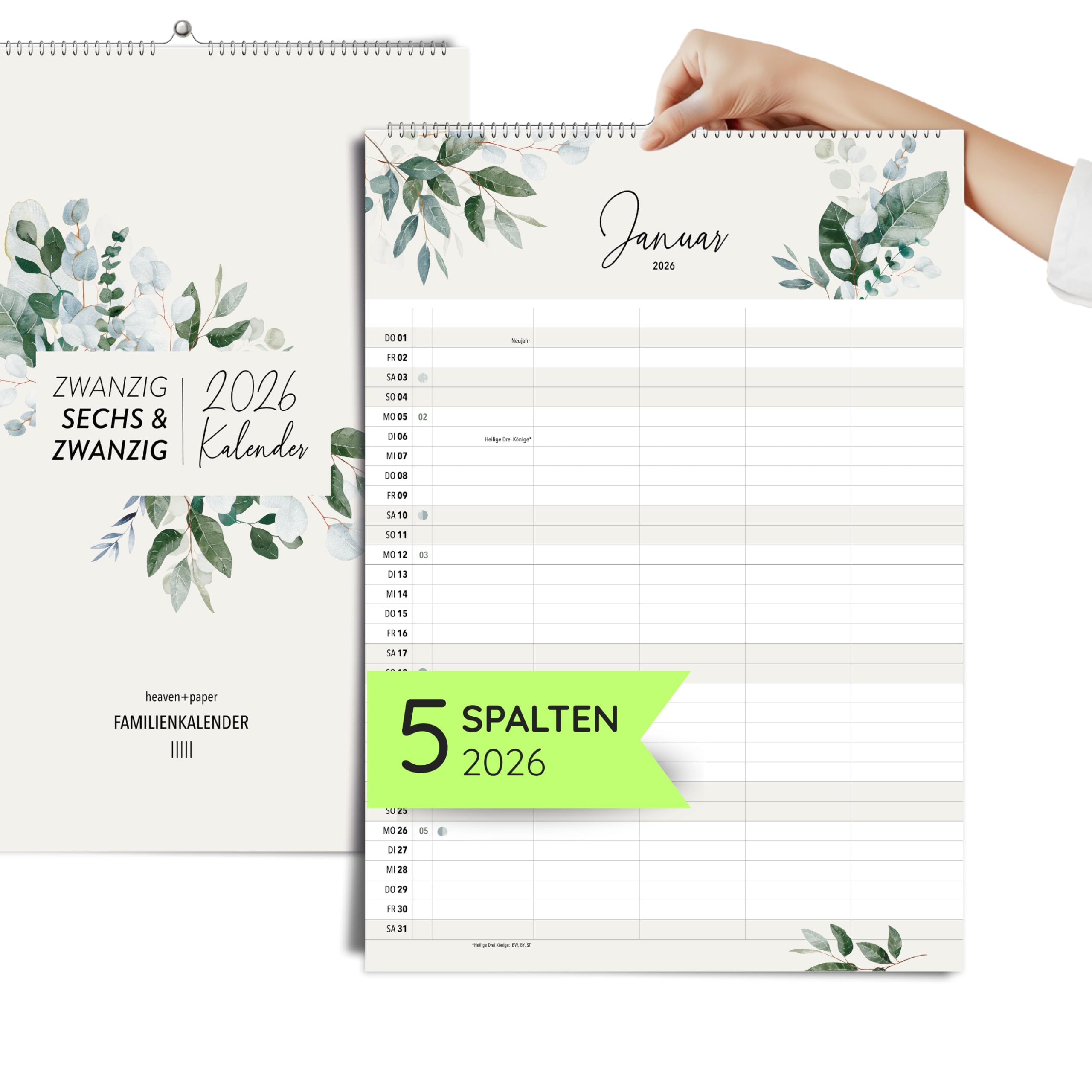 heaven+paper® Familienplaner 2026 | Wandkalender 2026 A3 | Planer 2026 mit 5 Spalten | Made in Germany | Kalender 2026 Familienplaner mit 12 Seiten | Jahresplaner 2026 mit Feiertagen und Schulferien