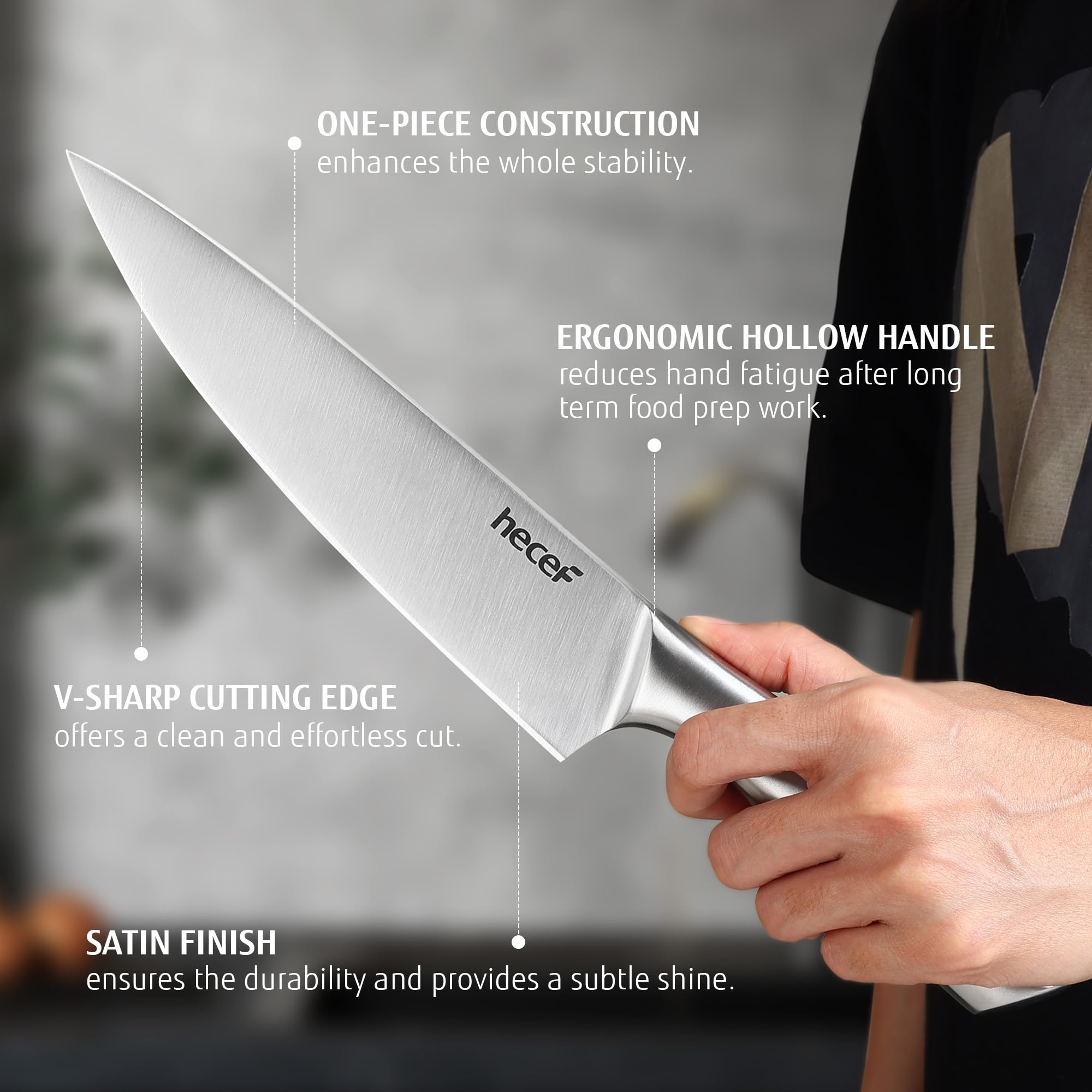 hecef Messerset 3 tlg, Scharfe Küchenmesser mit Edelstahlklinge und hohlem Griff, Kochmesser Set mit Klingenschutz, 20cm Chefmesser, 12.7cm Allzweckmesser und 8.9cm Gemüsemesser, Silber