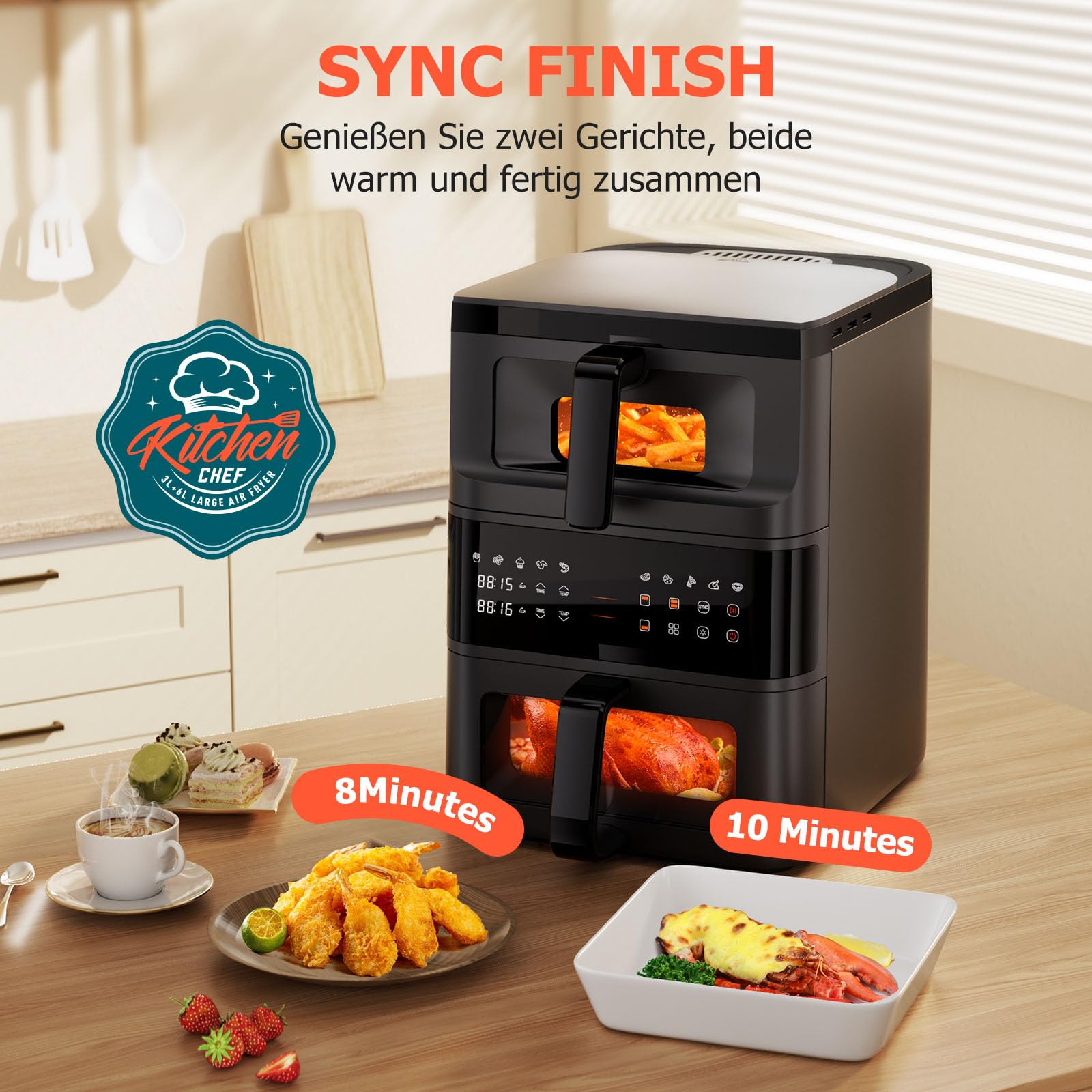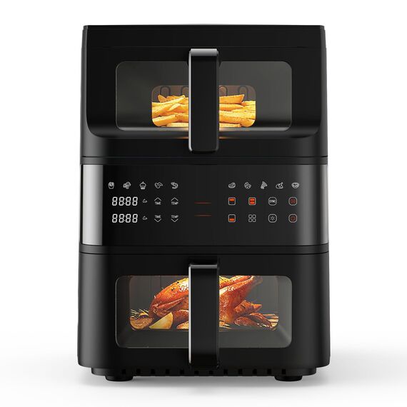 Heissluftfritteuse Doppelstapel mit Sichtfenster, Double Stack Kammern 10L Airfryer,10-in-1 Voreingestellten Programmen, Touchscreen, Intelligente und Timer, Energiesparend, Friteuse ohne Öl, Schwarz