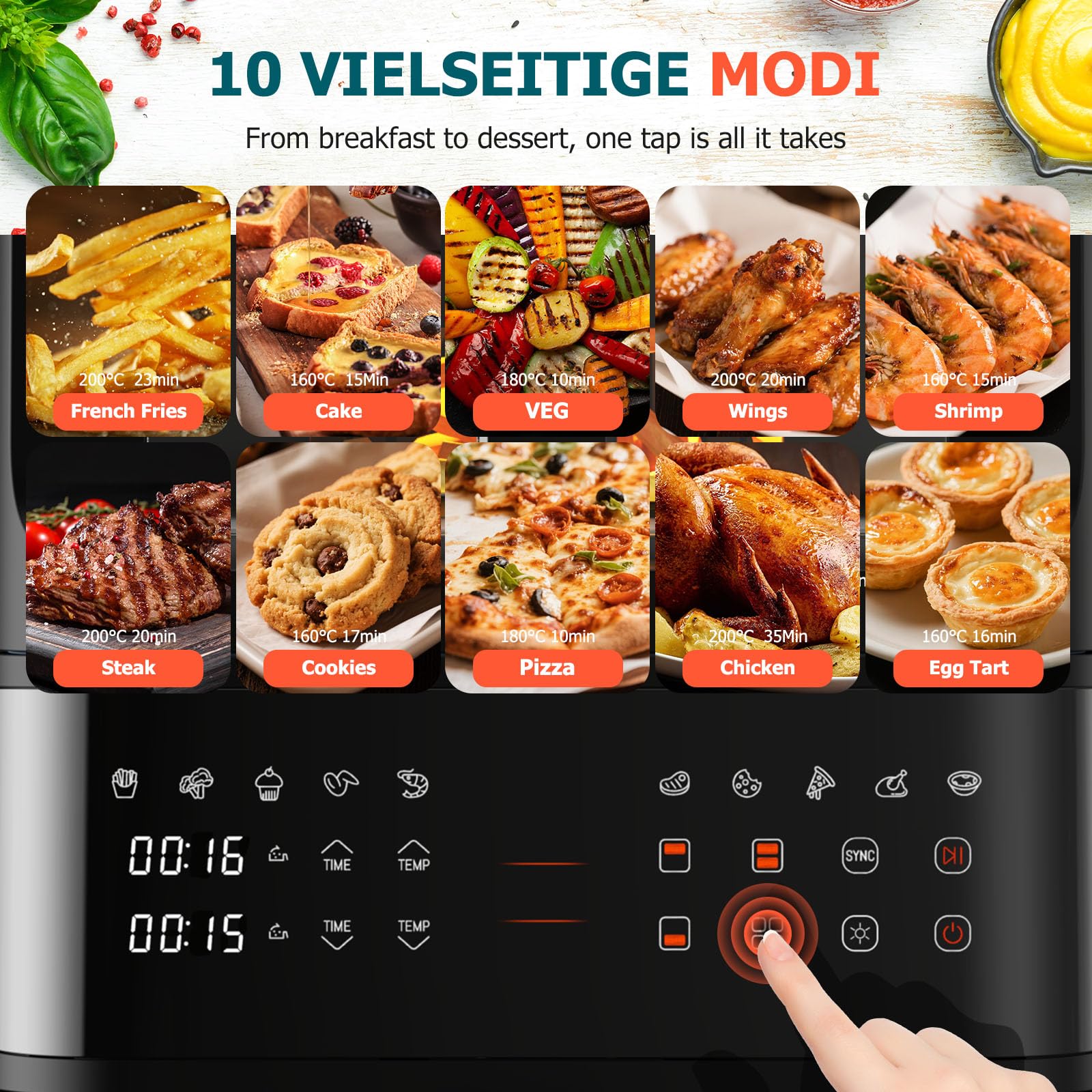 Geniessen Sie das Kochen mit unserer fortschrittlichsten Heissluftfritteuse mit zwei Zonen oben und unten. Dank intuitiver Smart-Touch-Bedienung und grossem transparentem Fenster steuern Sie den Garvorgang jedes Gerichts ganz einfach und sorgen so für ein perfektes Ergebnis. Diese 10-Liter-Heissluftfritteuse (3,5 l + 6,5 l) verfügt über zwei unabhängige Frittierkörbe, die gleichzeitig bei unterschiedlichen Temperaturen und Garzeiten garen – von knusprigen Pommes Frites bis hin zu zarten, saftigen Chicken Wings ist alles möglich. Dank innovativer Memory-Funktion und 10 Voreinstellungen für gesünderes Kochen können Sie mit dieser Fritteuse köstliche Gerichte mit bis zu 80 % weniger Öl zubereiten. Damit ist sie die ideale Wahl für gesundheitsbewusste Familien und Feiern.