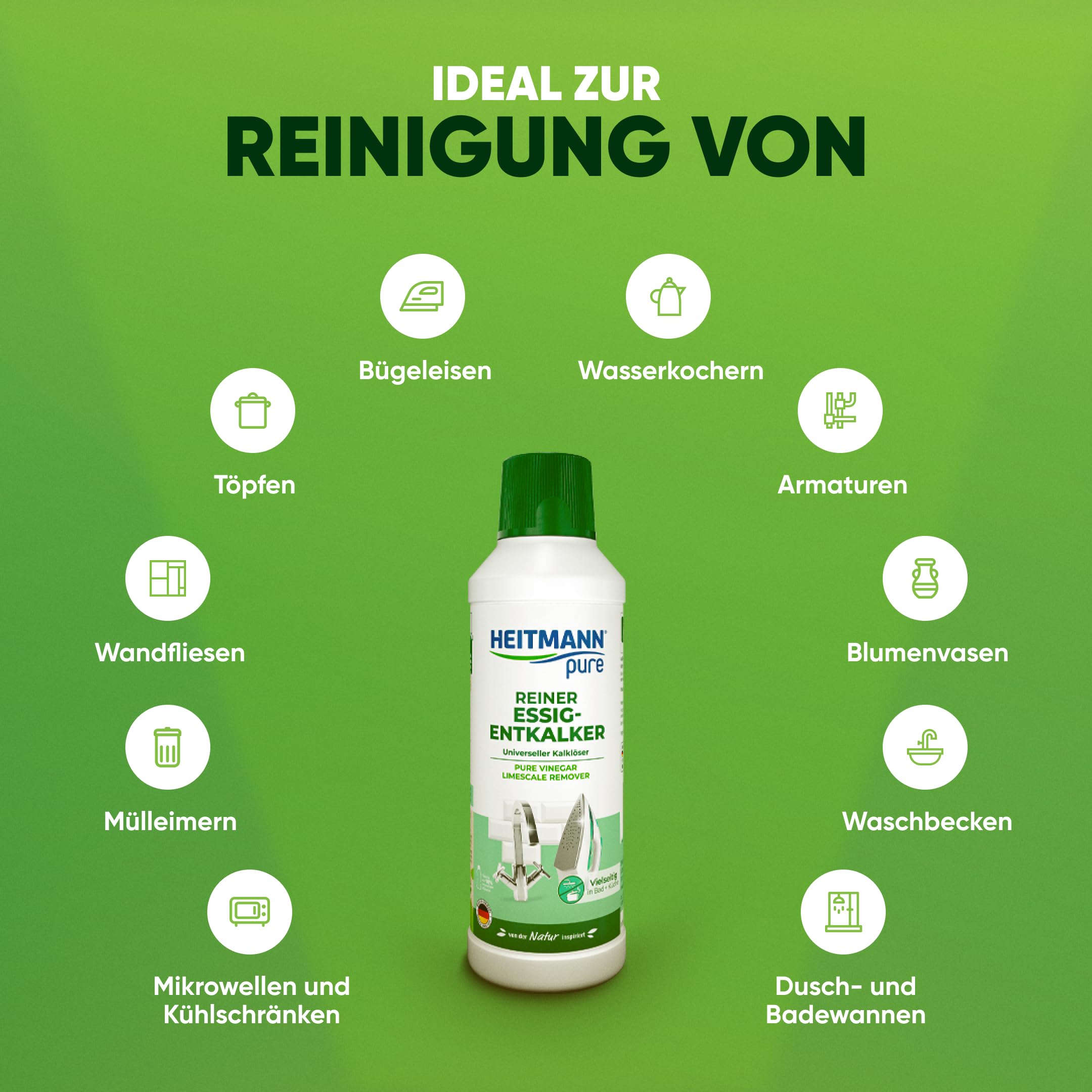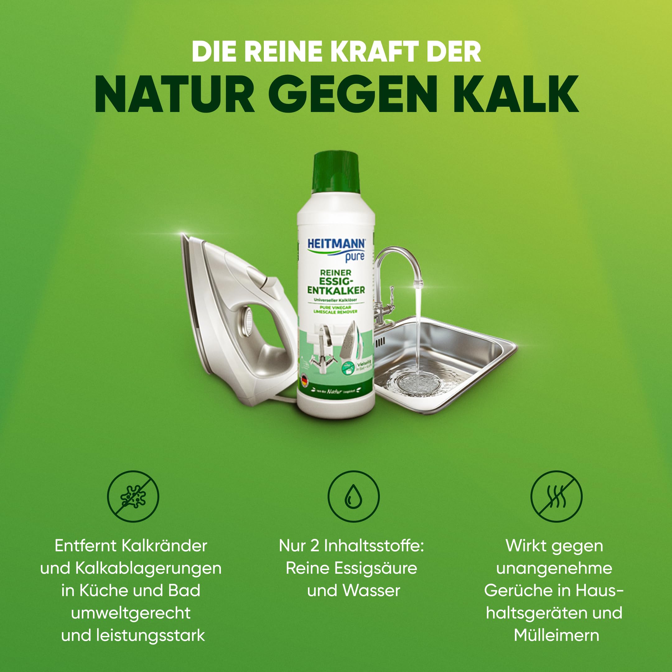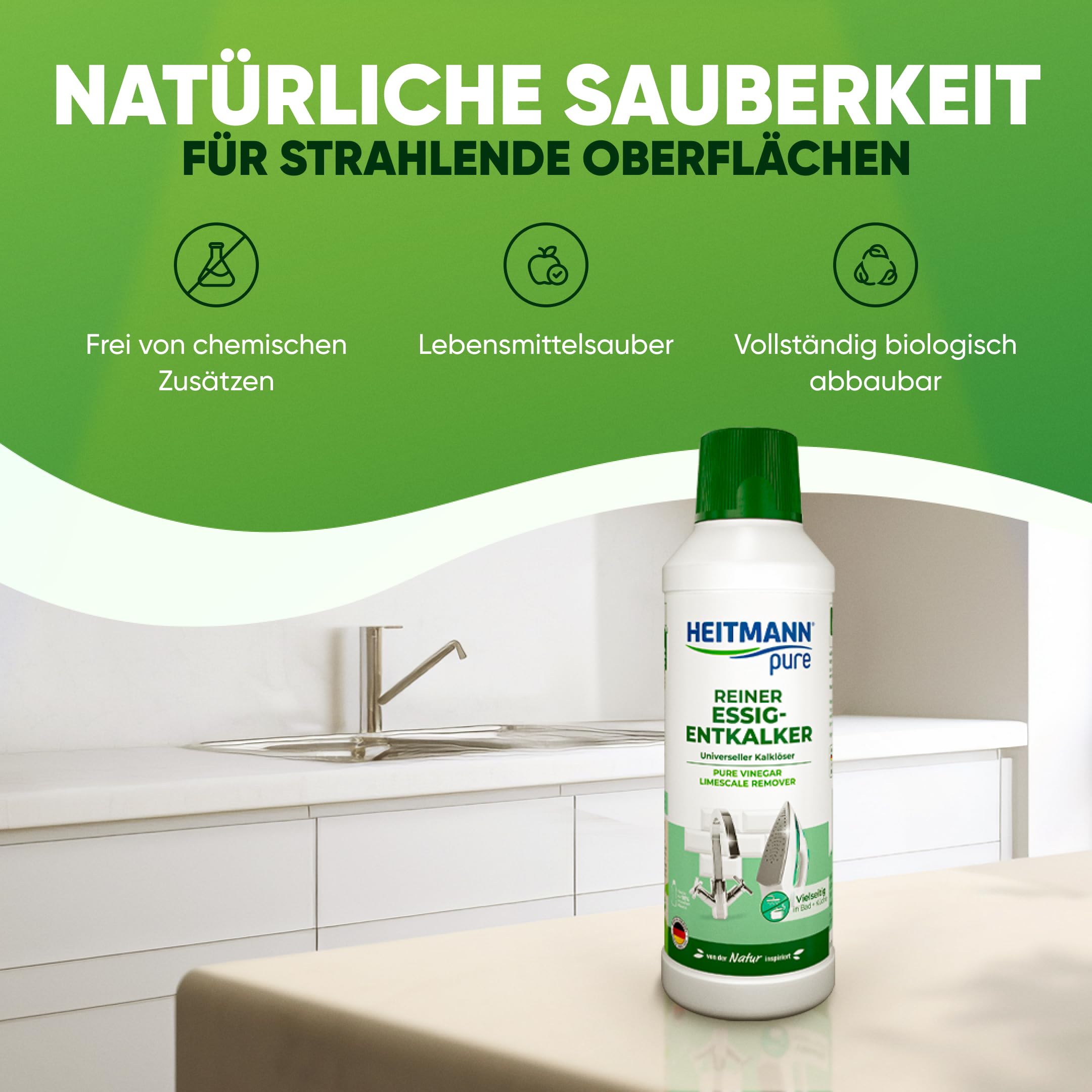 • NATÜRLICHE REINIGUNG: Der HEITMANN pure Essig-Entkalker besteht aus Essigsäure und Wasser. Er ist naturidentisch und frei von chemischen Zusätzen