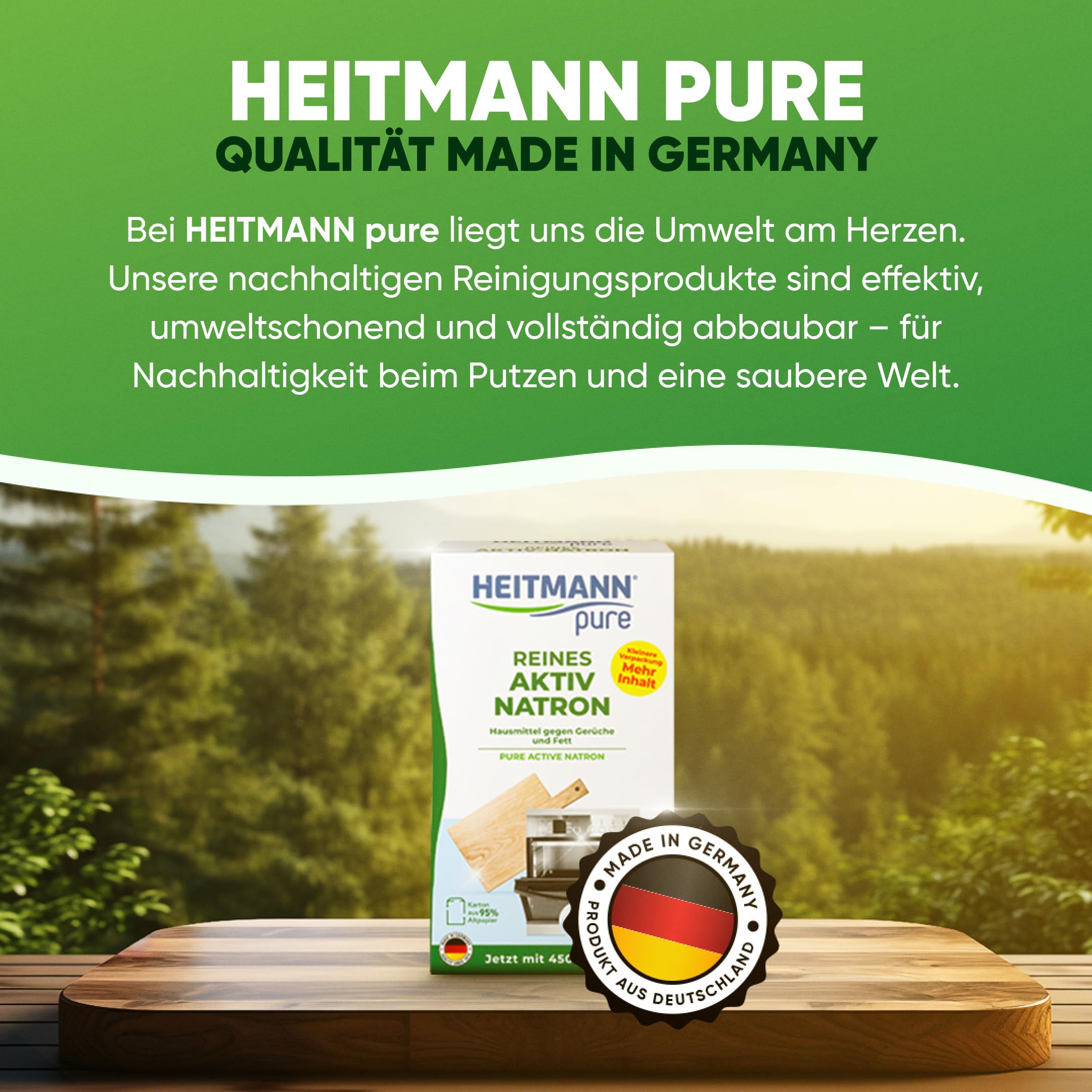 Unser HEITMANN pure Reines Aktiv-Natron ist die umweltfreundliche Lösung für Reinigung und Geruchsbeseitigung in deinem Zuhause. Dieses hochwertige Misch-Kristallisat aus natürlichen Inhaltsstoffen wie Soda und Natron überzeugt durch seine nachhaltige Reinigungswirkung. Es entfernt zuverlässig Fett, Verfärbungen und hartnäckige Gerüche – ganz ohne chemische Zusätze.Dank seiner milden Schleifwirkung eignet sich Aktiv-Natron perfekt für empfindliche Oberflächen wie Edelstahl oder Marmor und sorgt für strahlende Sauberkeit ohne Kratzer. Gleichzeitig neutralisiert es unangenehme Gerüche in Schuhen, Teppichen, Wäsche oder Wohnbereichen und hinterlässt ein frisches, reines Gefühl.Die Verpackung aus recycelbarem Altpapier unterstreicht den umweltfreundlichen Ansatz und macht Aktiv-Natron zur nachhaltigen Wahl für deinen Haushalt. Entdecke die natürliche Vielseitigkeit von Reinem Aktiv-Natron und schone dabei nicht nur deine Oberflächen, sondern auch die Umwelt!