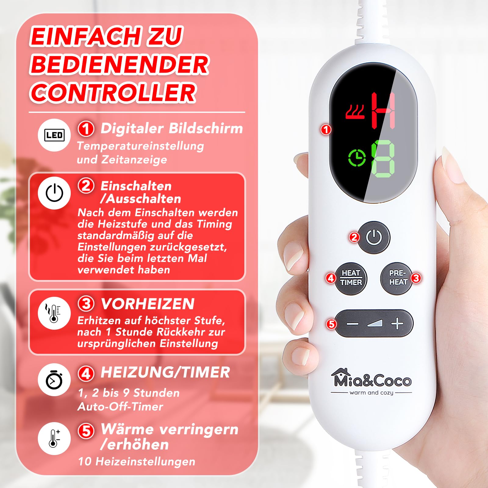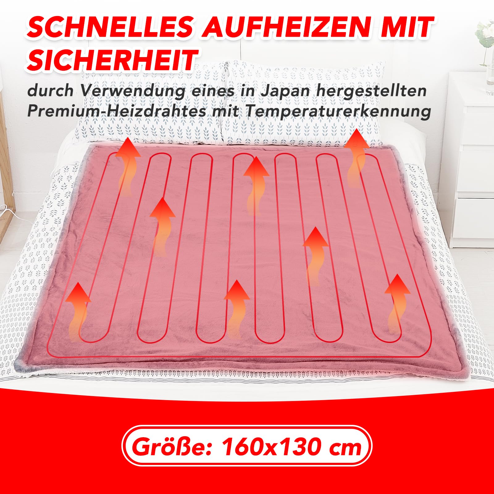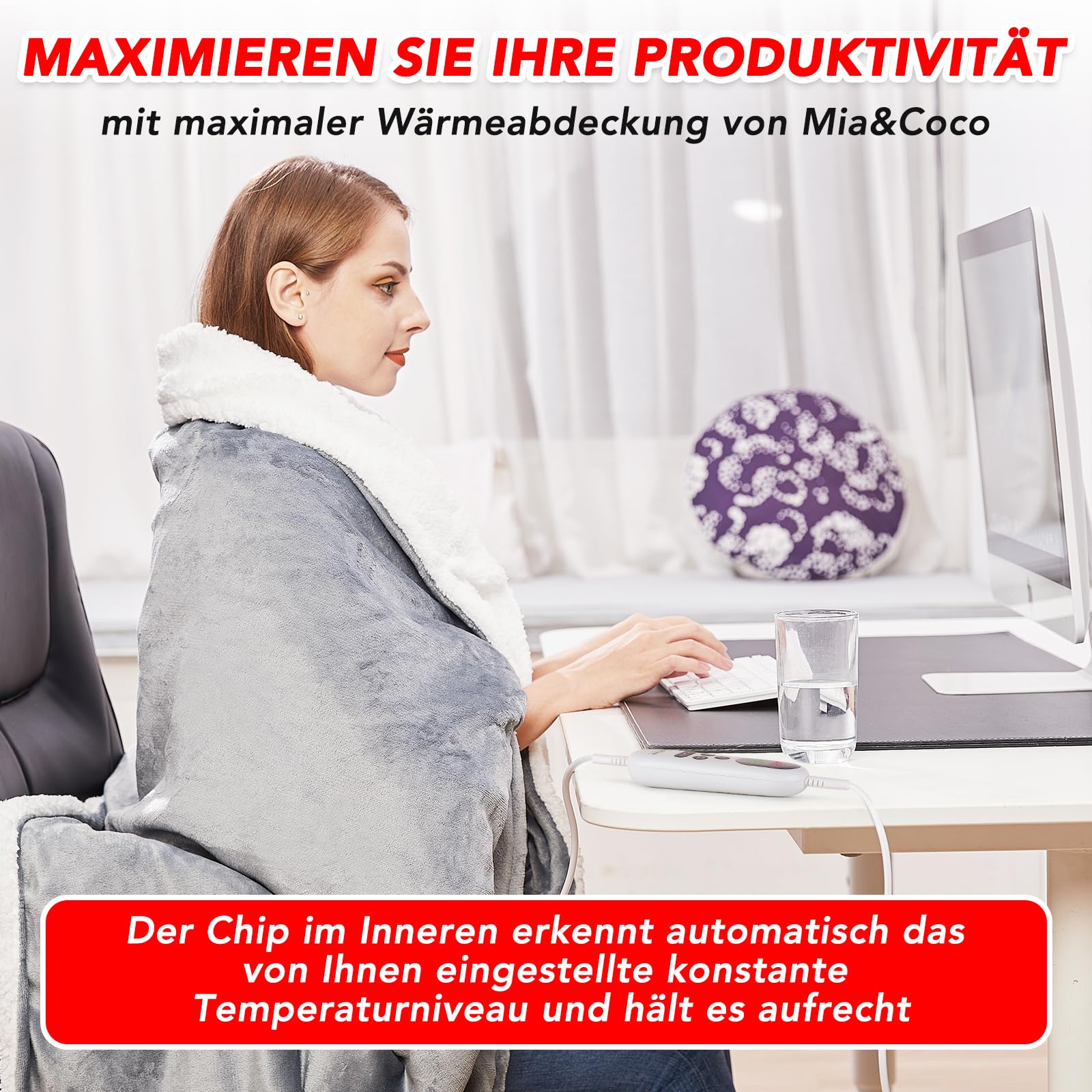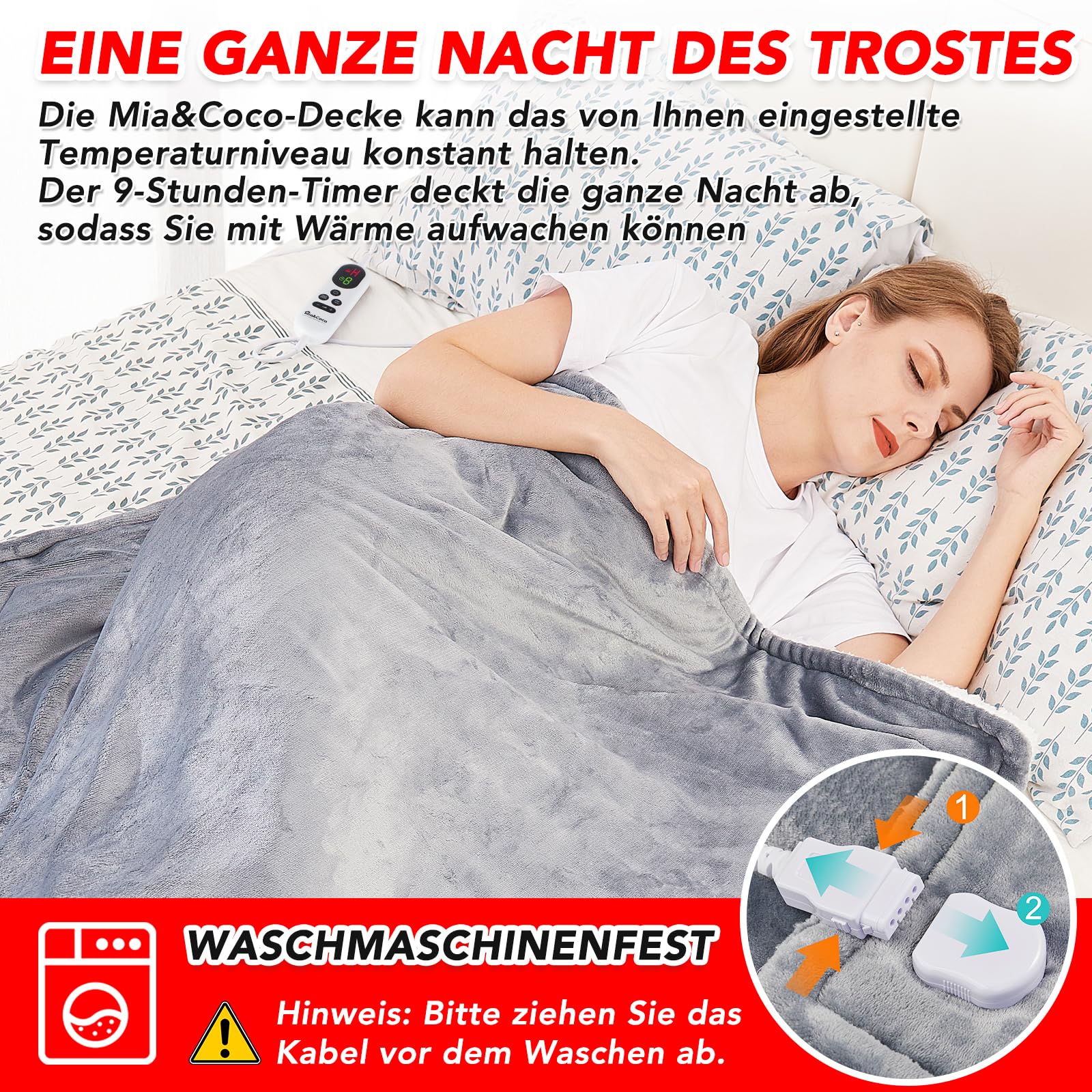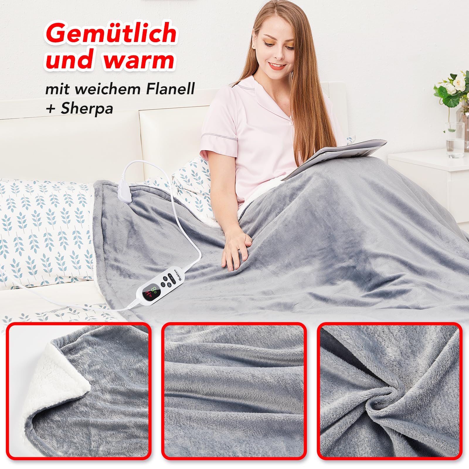Heizdecke mit Abschaltautomatik, 130x160cm, 10 Heizstufen Up-to-9 Stunden Auto-Off-Timer Überhitzungsschutz, Elektrische Wärmedecke Bett Decke ETL-Zertifiziert für Home & Office Flanell Waschbar, Grau