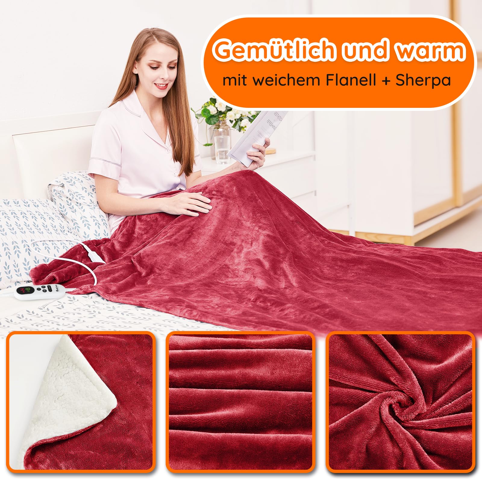 Heizdecke mit Abschaltautomatik, 130x180cm 10 Heizstufen 1~9 Stunden Auto-Off-Timer Überhitzungsschutz, Elektrische Wärmedecke Bett Wärme Decke ETL für Home & Office Schnelle Flanell Waschbar Rot