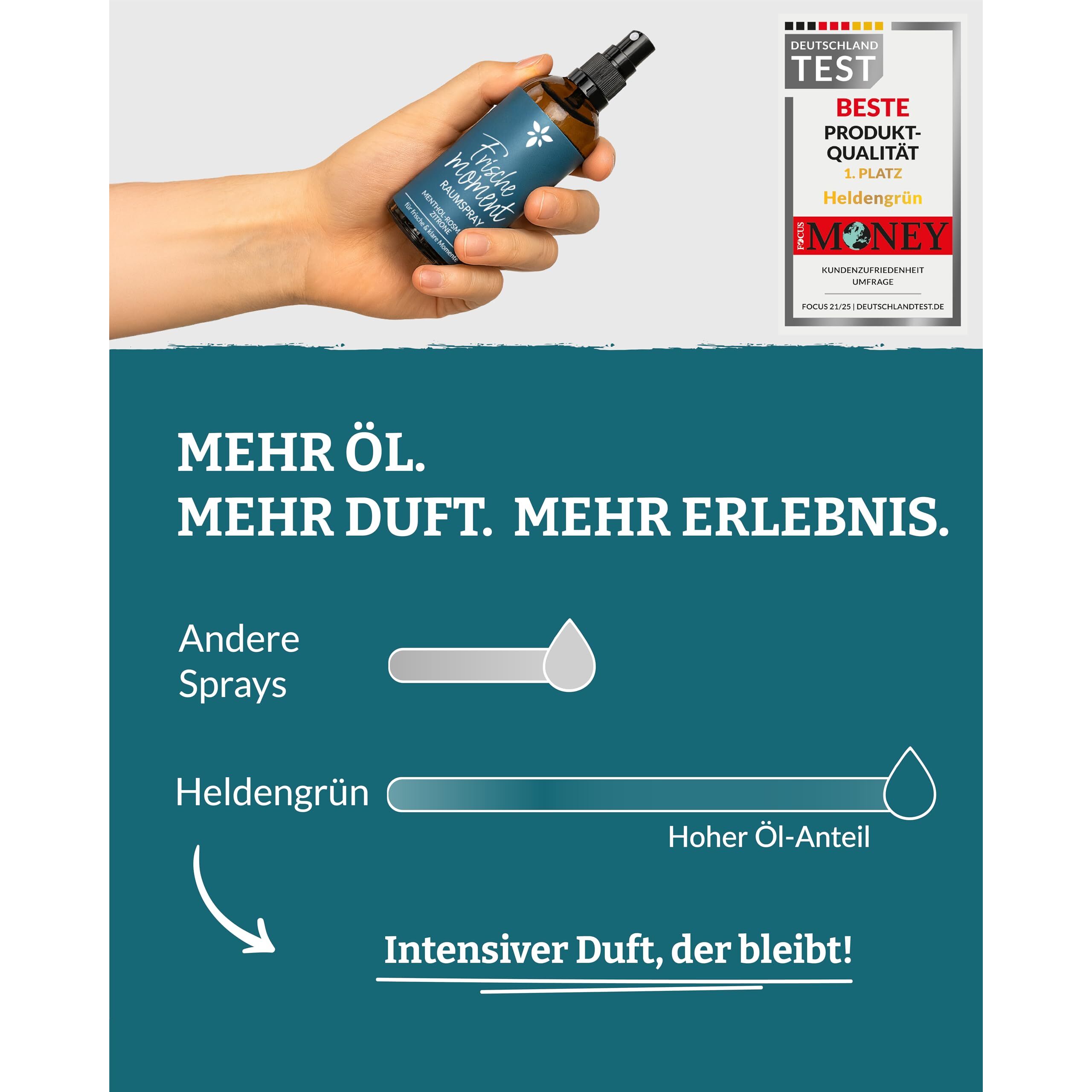 Heldengrün® Raumspray "Frischemoment" [ECHTE BIO-ÖLE] Dermatologisch getestet - Frische Luft Raumspray - Bio Raumduft mit Minze, Rosmarin & Zitrone - Textil Duftspray & Lufterfrischer