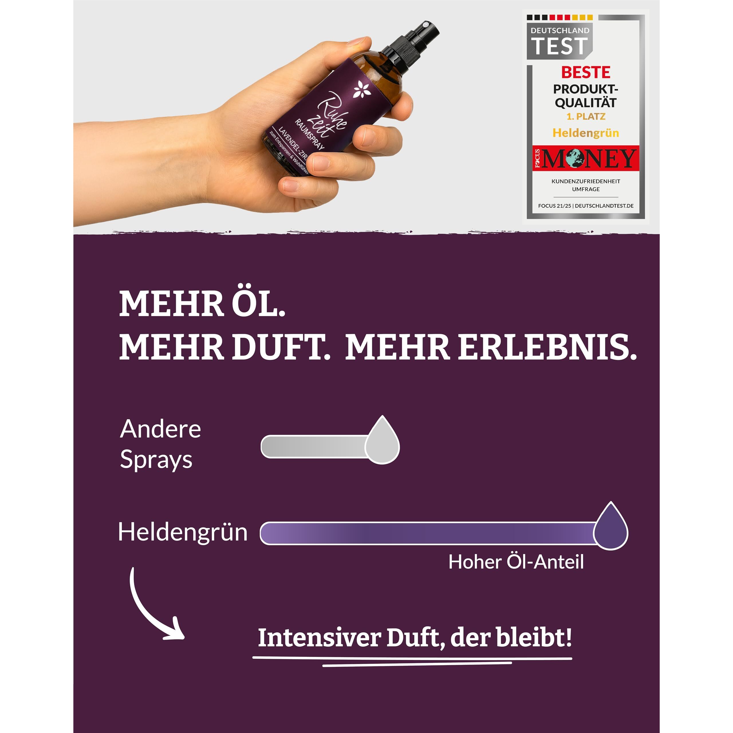 Heldengrün® Kissenspray zum Einschlafen "Ruhezeit" [ECHTE BIO-ÖLE] Dermatologisch getestet - Kopfkissenspray mit Bio-Lavendel & Zirbe - Schlafwohl Kissenpray