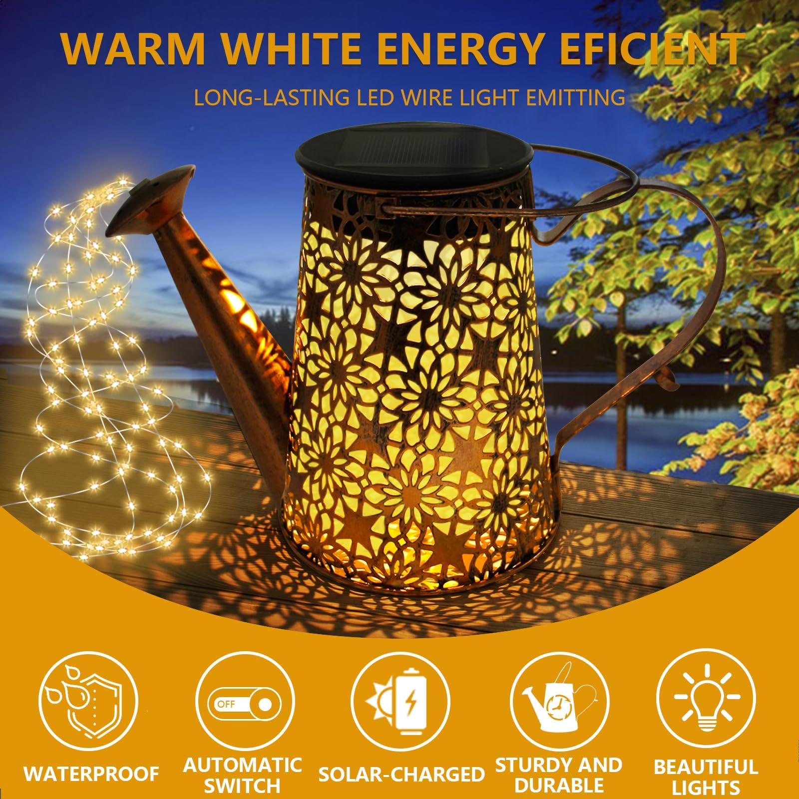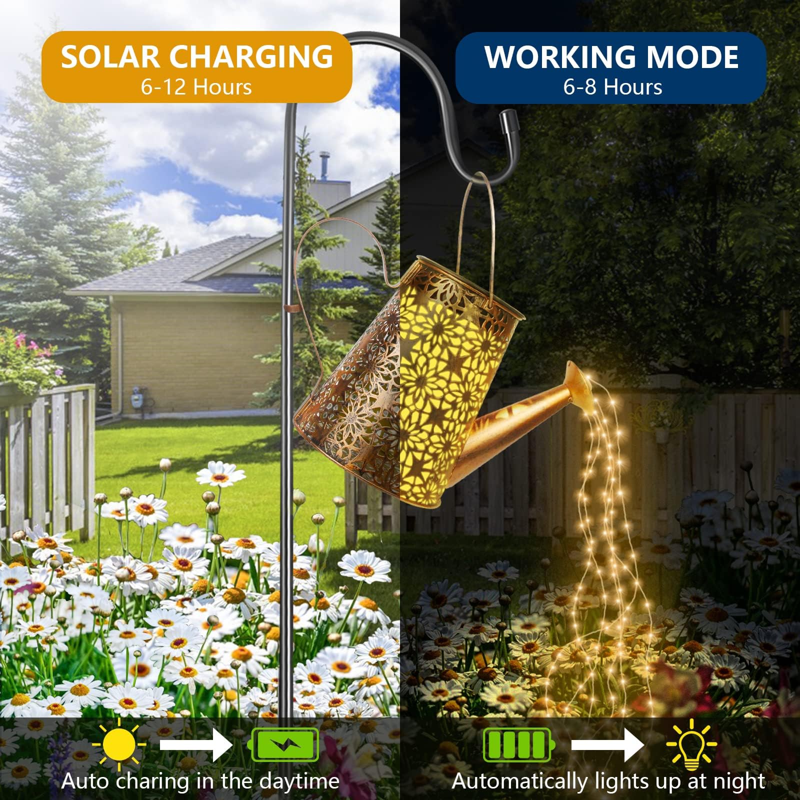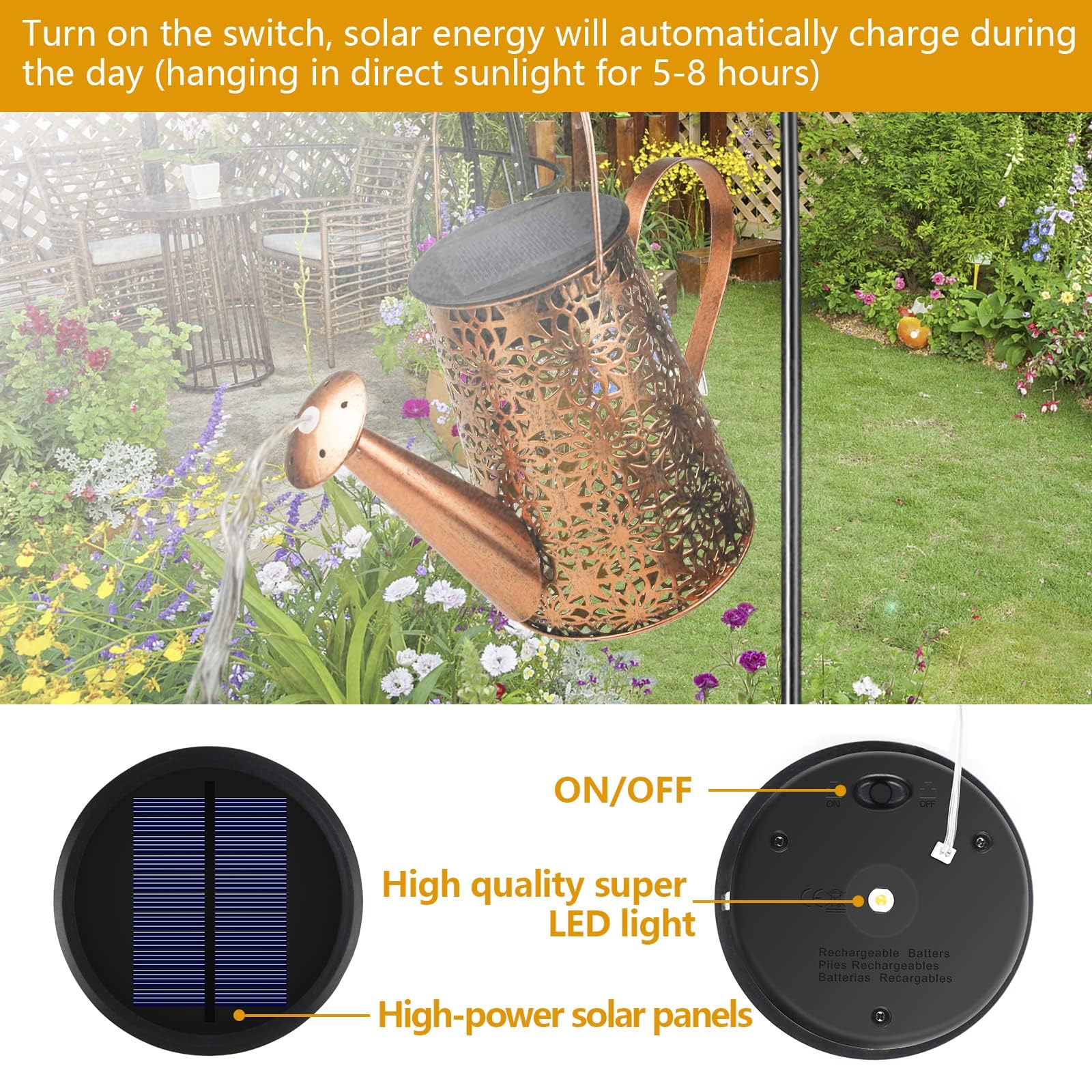 Parameter:Produktname: Solarlampen Giesskanne gartenBatterieinformationen: Ni-MH AA 600mAh 1.2V (austauschbar)Solarladepanel: Polykristallines Silizium-SolarpanelWasserdichte Bewertung: IP65Intelligenter lichtempfindlicher Modus: im offenen Zustand leuchtet die Dunkelheit automatisch aufBetriebszeit: 6-8 Stunden Ladezeit, 8-12 Stunden Betriebszeit (an bewölkten, regnerischen und verschneiten Tagen ist eine längere Ladezeit erforderlich)Beschreibung:-Die kreativen HELESIN Solarlampen für Aussendeko, schön und romantisch, ideal für die Beleuchtung Ihres Rasens, Gartens oder Gehwegs.-Einfach zu installieren, keine Drähte oder Steckdosen erforderlich!-Eine wunderbare Dekoration für Hochzeiten, Partys, Feiern, Weihnachten und mehr.Andere Dinge:1. bitte ziehen Sie die Schutzfolie vor dem ersten Gebrauch von der Platte ab.2. mindestens 8 Stunden direktes Sonnenlicht wird empfohlen, da die Helligkeit und Dauer der Beleuchtung von der Stärke der gespeicherten Sonnenenergie abhängt.3. die Batterie der Solarlampen für aussen deko ist eine herausnehmbare Batterie. Je länger die Batterie benutzt wird, desto mehr Strom verbraucht sie. Daher können Sie die Batterie selbst auswechseln, wenn ihre Lebensdauer zur Neige geht.Packliste:1 * solarlampen giesskanne garten1 * Hirtenhaken