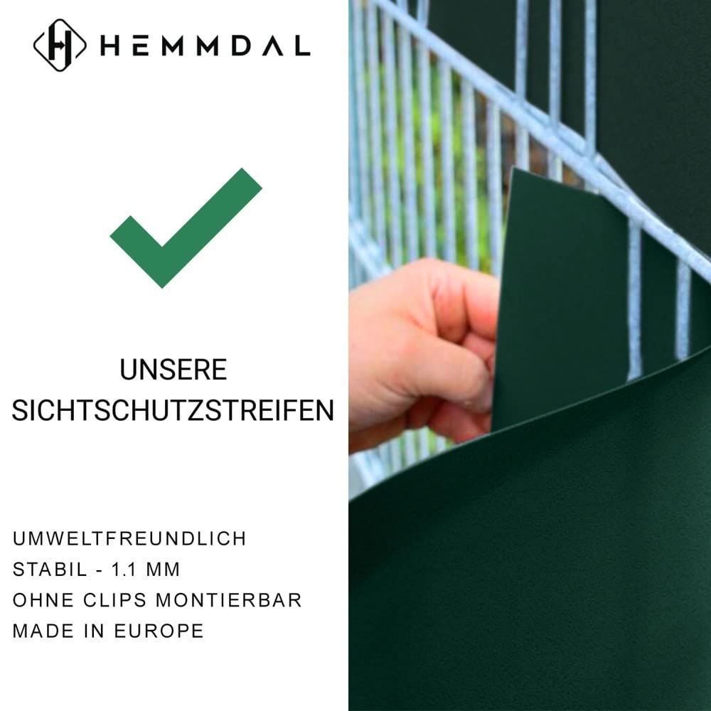 HEMMDAL Sichtschutzstreifen grün, 0,19 x 35 m, 1,1 mm stark, wasserfest & schmutzabweisendDie HEMMDAL Sichtschutzstreifen in grün bieten einen optimalen Sichtschutz für alle gängigen Doppelstabmattenzäune und -gitterzäune. Der Sichtschutz lässt sich ohne die Verwendung von Werkzeug oder Klemmen ganz einfach in den Zaun einflechten. Ob Garten, Werkstatt, Sportplatz oder Firmengelände - die Sichtschutzstreifen sind vielseitig einsetzbar und dienen ebenso als Sonnen- und Windschutz. Die 35 m lange Sichtschutzblende lässt sich einfach mit einer Schere oder einem Cuttermesser auf die gewünschte Länge zuschneiden. Dabei 2-3 cm mehr Länge einberechnen, da durch das Einflechten in den Zaun mehr Länge benötigt wird. Die Höhe der Sichtschutzstreifen beträgt 19 cm.Qualitative Sichtschutzstreifen - langlebig, flexibel und formstabilDie Zaunstreifen bestehen aus hochwertigen Polypropylen mit einer Stärke von 1,1 mm, das besonders schmutzabweisend, wasserfest und schimmelresistent ist und garantiert fünf Jahre UV-beständig. Das PP-Material ist äusserst fest und langlebig und macht die Zaunstreifen zu echter Premium Qualitätsware. Durch ein mattes Finish werden Reflexionen vermieden und eine hochwertige Optik erzielt. Zudem behalten die blickdichten Sichtblenden auch bei Hitze und Frost ihre guten Materialeigenschaften und sind somit das ganze Jahr über anwendbar.HEMMDAL: Qualität rein digital, interaktiv und ohne viel SchnickschnackMit diesem Antrieb geht HEMMDAL als Pionier voran und ermöglicht ein Shoppingerlebnis das Neugierde weckt, Spass macht und dennoch Vertrauen und Verlässlichkeit vermittelt. Die Produkte der Marke HEMMDAL überzeugen durch ihre Qualität, Zuverlässigkeit und Leistungsfähigkeit.