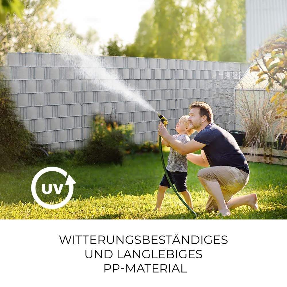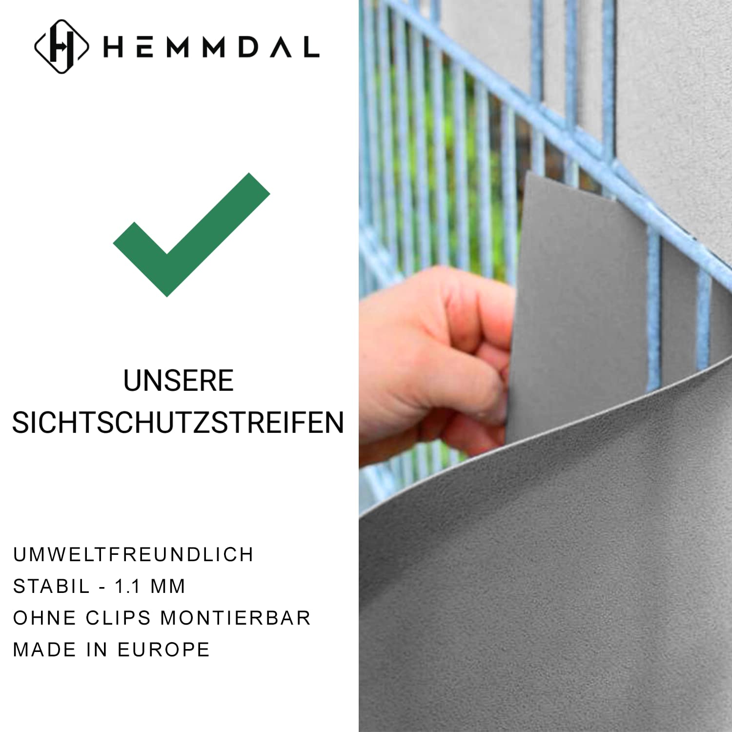 HEMMDAL Sichtschutzstreifen hellgrau, 0,19 x 35 m, 1,1 mm stark, wasserfest & schmutzabweisendDie HEMMDAL Sichtschutzstreifen in hellgrau bieten einen optimalen Sichtschutz für alle gängigen Doppelstabmattenzäune und -gitterzäune. Der Sichtschutz lässt sich ohne die Verwendung von Werkzeug oder Klemmen ganz einfach in den Zaun einflechten. Ob Garten, Werkstatt, Sportplatz oder Firmengelände - die Sichtschutzstreifen sind vielseitig einsetzbar und dienen ebenso als Sonnen- und Windschutz. Die 35 m lange Sichtschutzblende lässt sich einfach mit einer Schere oder einem Cuttermesser auf die gewünschte Länge zuschneiden. Dabei 2-3 cm mehr Länge einberechnen, da durch das Einflechten in den Zaun mehr Länge benötigt wird. Die Höhe der Sichtschutzstreifen beträgt 19 cm.Qualitative Sichtschutzstreifen - langlebig, flexibel und formstabilDie Zaunstreifen bestehen aus hochwertigen Polypropylen mit einer Stärke von 1,1 mm, das besonders schmutzabweisend, wasserfest und schimmelresistent ist und garantiert fünf Jahre UV-beständig. Das PP-Material ist äusserst fest und langlebig und macht die Zaunstreifen zu echter Premium Qualitätsware. Durch ein mattes Finish werden Reflexionen vermieden und eine hochwertige Optik erzielt. Zudem behalten die blickdichten Sichtblenden auch bei Hitze und Frost ihre guten Materialeigenschaften und sind somit das ganze Jahr über anwendbar.HEMMDAL: Qualität rein digital, interaktiv und ohne viel SchnickschnackMit diesem Antrieb geht HEMMDAL als Pionier voran und ermöglicht ein Shoppingerlebnis das Neugierde weckt, Spass macht und dennoch Vertrauen und Verlässlichkeit vermittelt. Die Produkte der Marke HEMMDAL überzeugen durch ihre Qualität, Zuverlässigkeit und Leistungsfähigkeit.