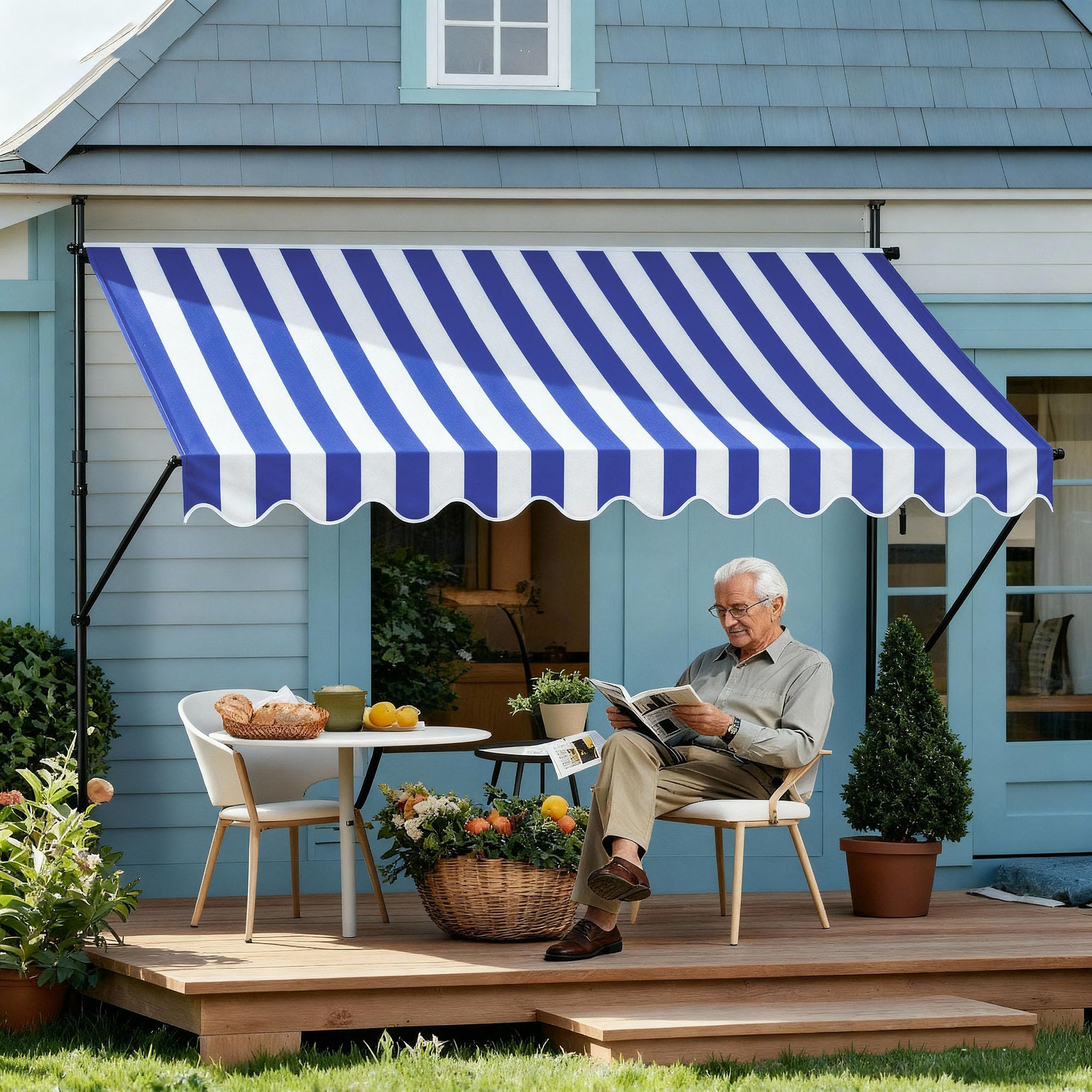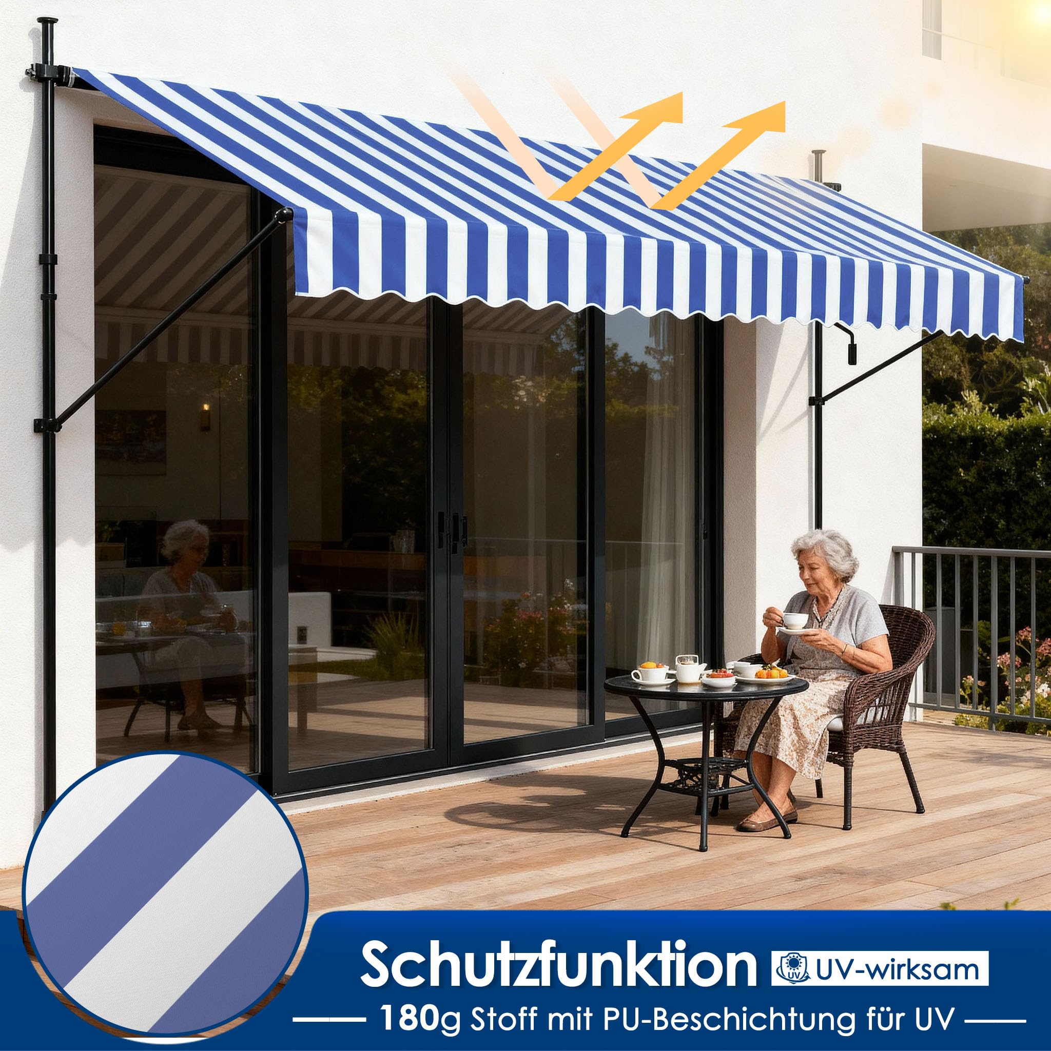 Beschreibung:Offene Gelenkarmmarkise schützt ideal gegen Sonneneinstrahlung.Die Markise ist der ideale Schattenspender für heisse Sommertage. Schnell montiert und variabel verstellbar bietet sie ausreichend Schatten.Aufgrund einer robusten stehlen konstruktion ist sie sehr stabil und langlebig.Höhenverstellbar: Passen Sie die Höhe der Markise individuell an Ihre Bedürfnisse an und geniessen Sie optimalen Sonnenschutz auf Ihrer Terrasse oder Ihrem Balkon.Kompakte und stabile Bauweise.Verbesserte Schmutz- und Staubabweisung durch PU Beschichtung.Wasserabweisend imprägniert.Einfache Klemmmontage: Unsere Klemmmarkise lässt sich ohne Bohren montieren und bietet so eine schnelle und unkomplizierte Lösung; ideal auch für Mietwohnungen geeignet