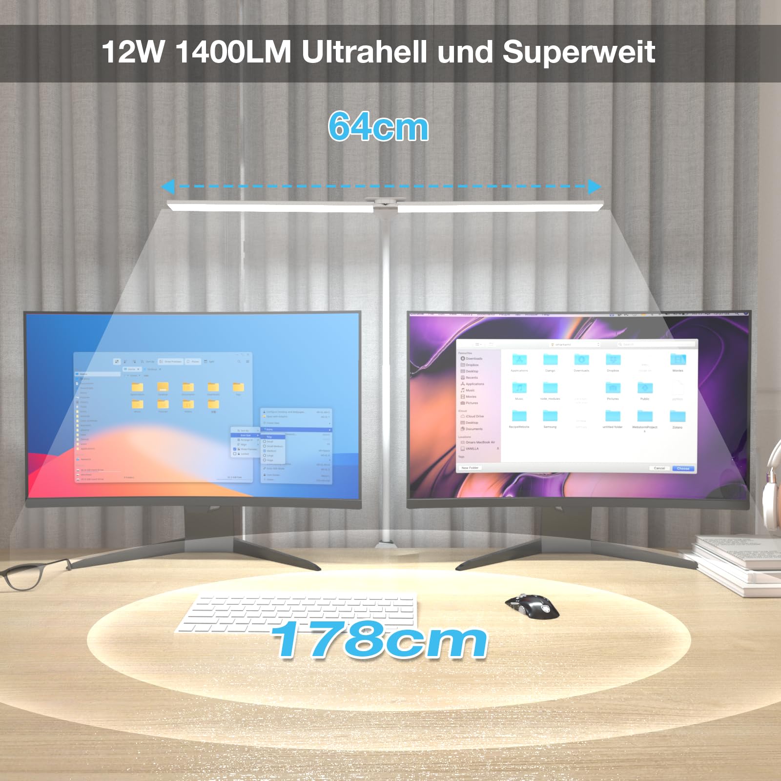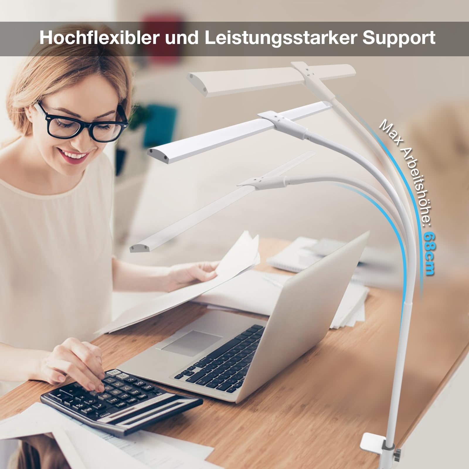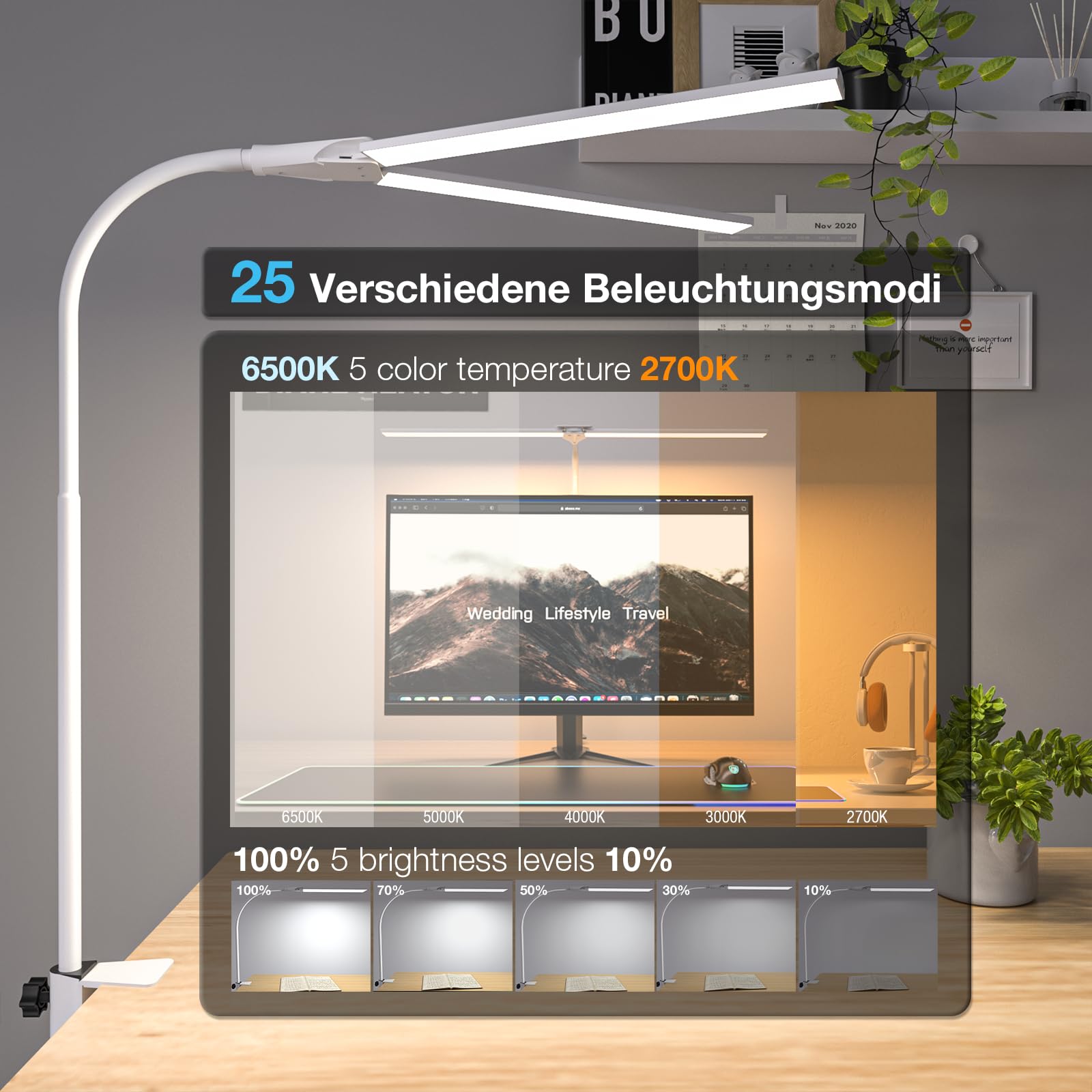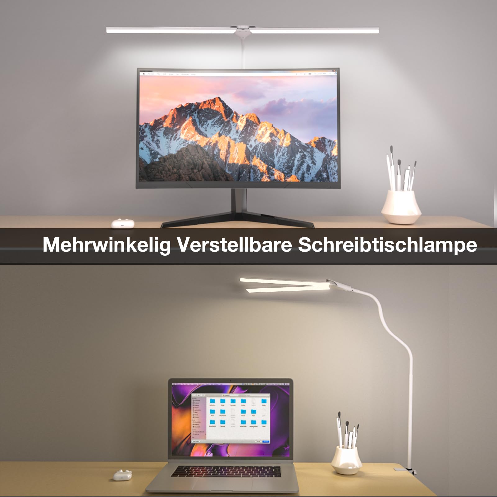 Hensam Schreibtischlampe LED für Büro, Tageslichtlampe für Monitor, 1400LM, Dimmbar, Klemmbar, Arbeitsplatzleuchte, Schwanenhals, Doppelkopf, 5 Farbmodi-Helligkeitsstufen, Weiss