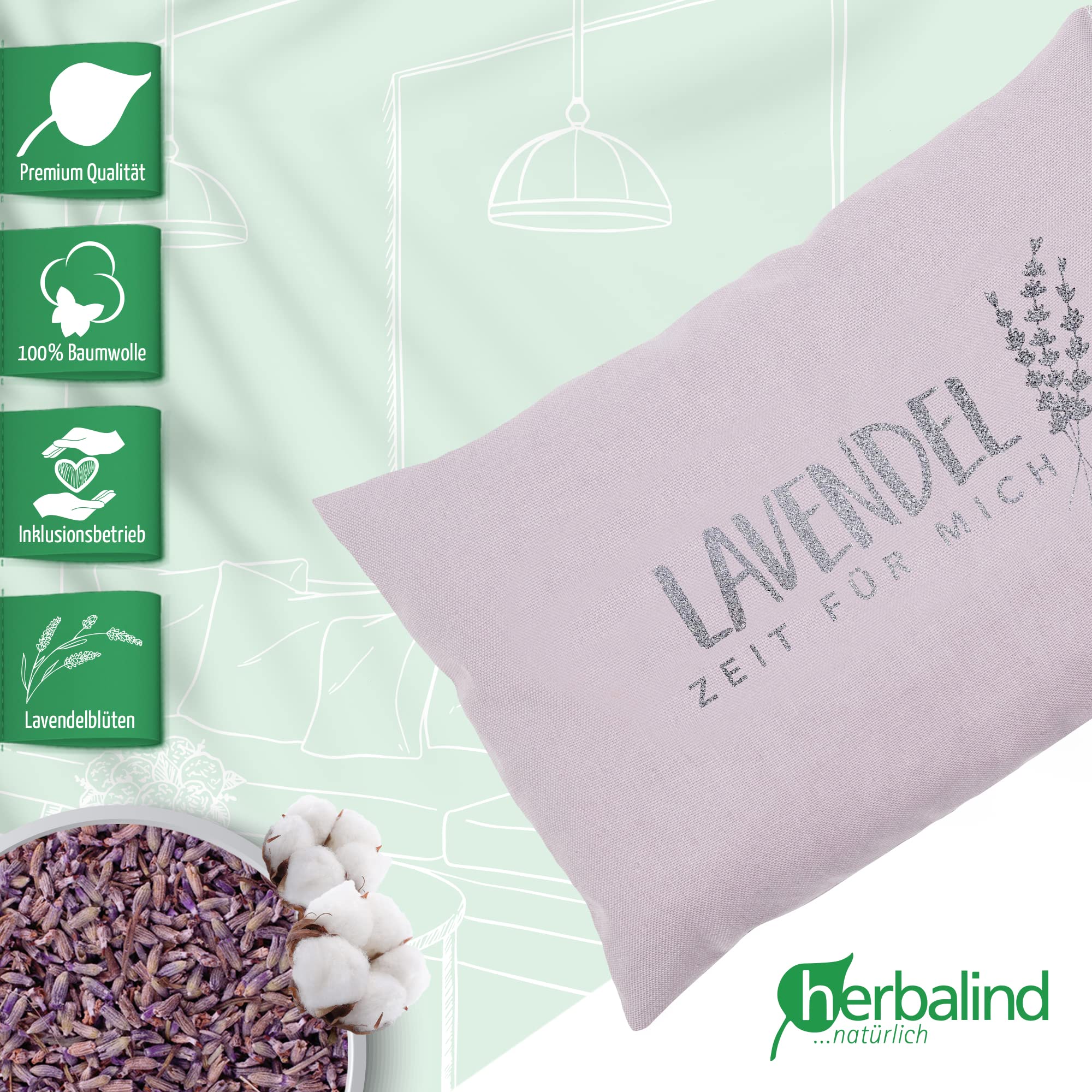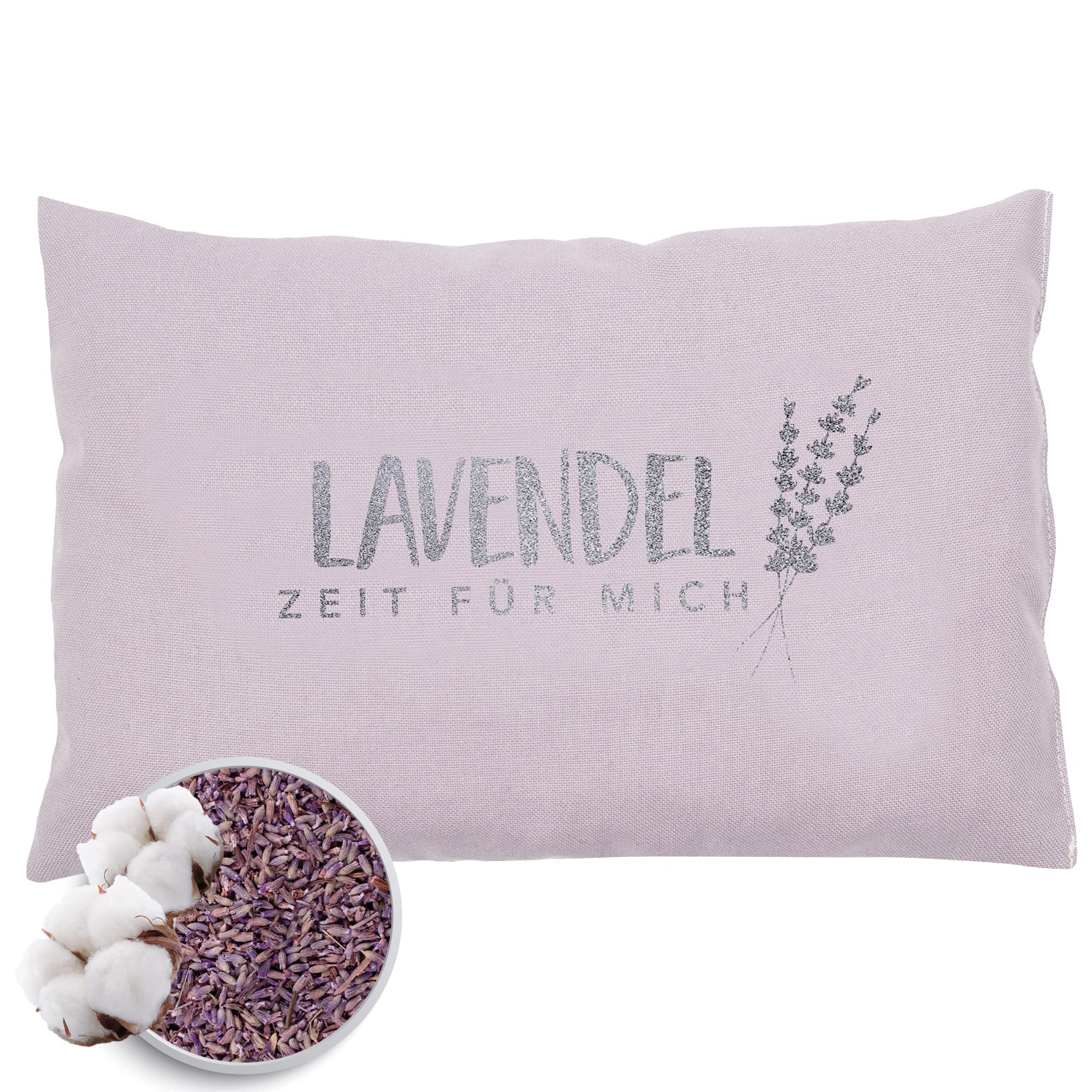 Herbalind Lavendelkissen Zeit für Mich 30x20 cm Schlafkissen mit Füllung - Duftkissen zum Schlafen, Oeko TEX 100% Baumwolle, Kräuterkissen mit Lavendel ohne Chemie - Dekokissen - Geschenk für Frauen