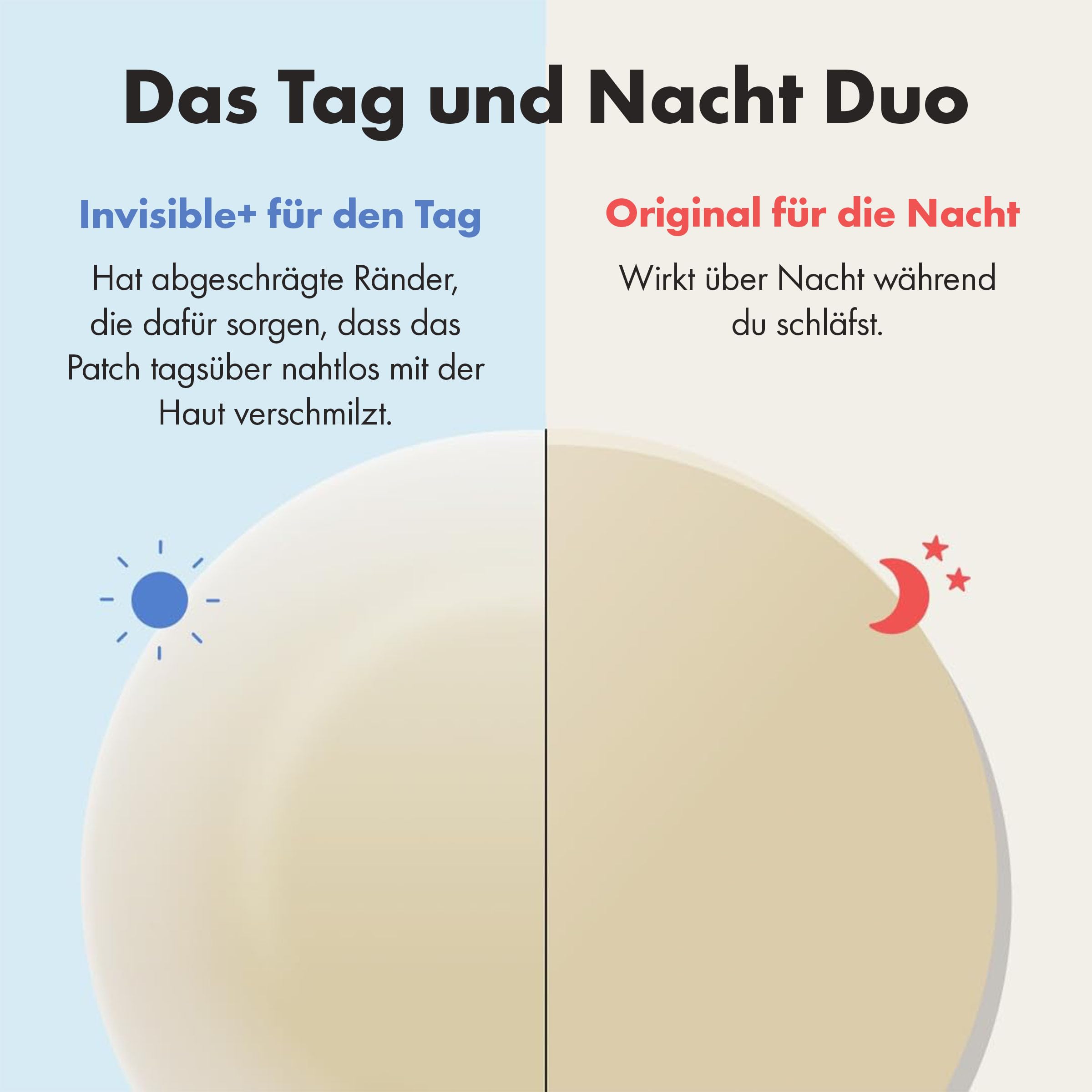 Die Tagespatches sind besonders duenn und nahezu unsichtbar, sodass sie sich problemlos in den Alltag integrieren lassen und auch unter Make-up getragen werden koennen. Die Nachtpatches sind etwas staerker und bieten waehrend des Schlafs eine intensivere Pflege, indem sie Unreinheiten schuetzen und gezielt behandeln.