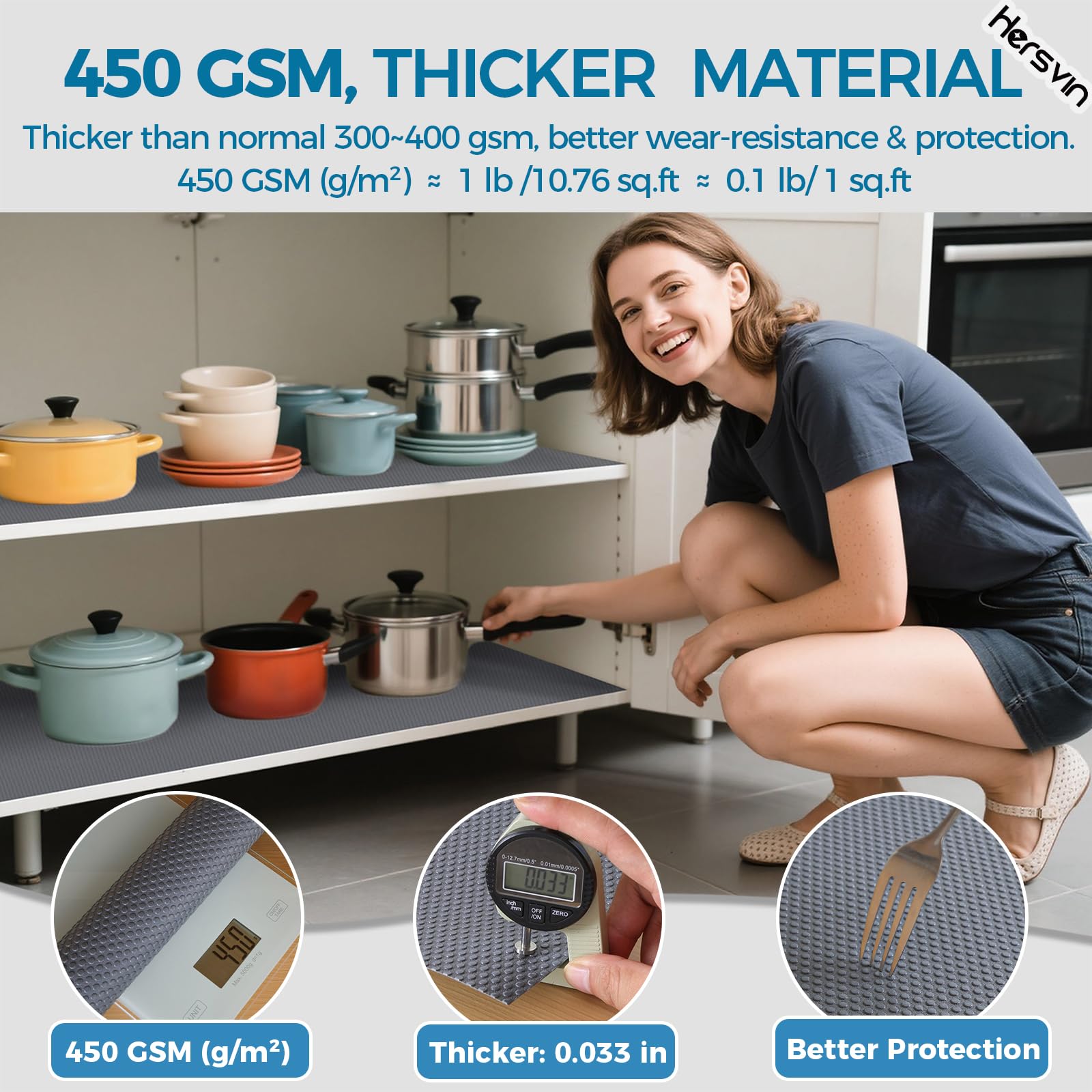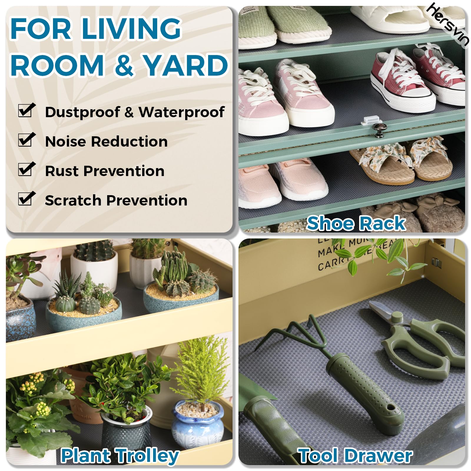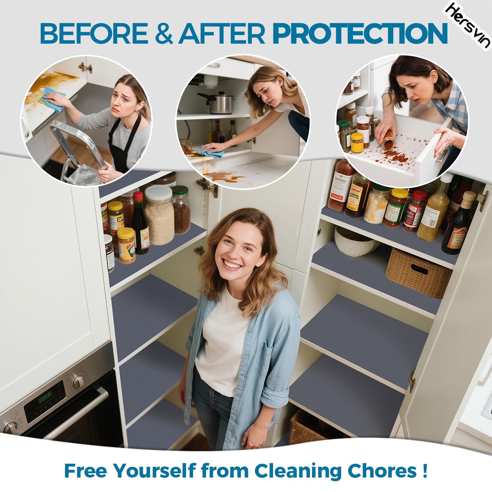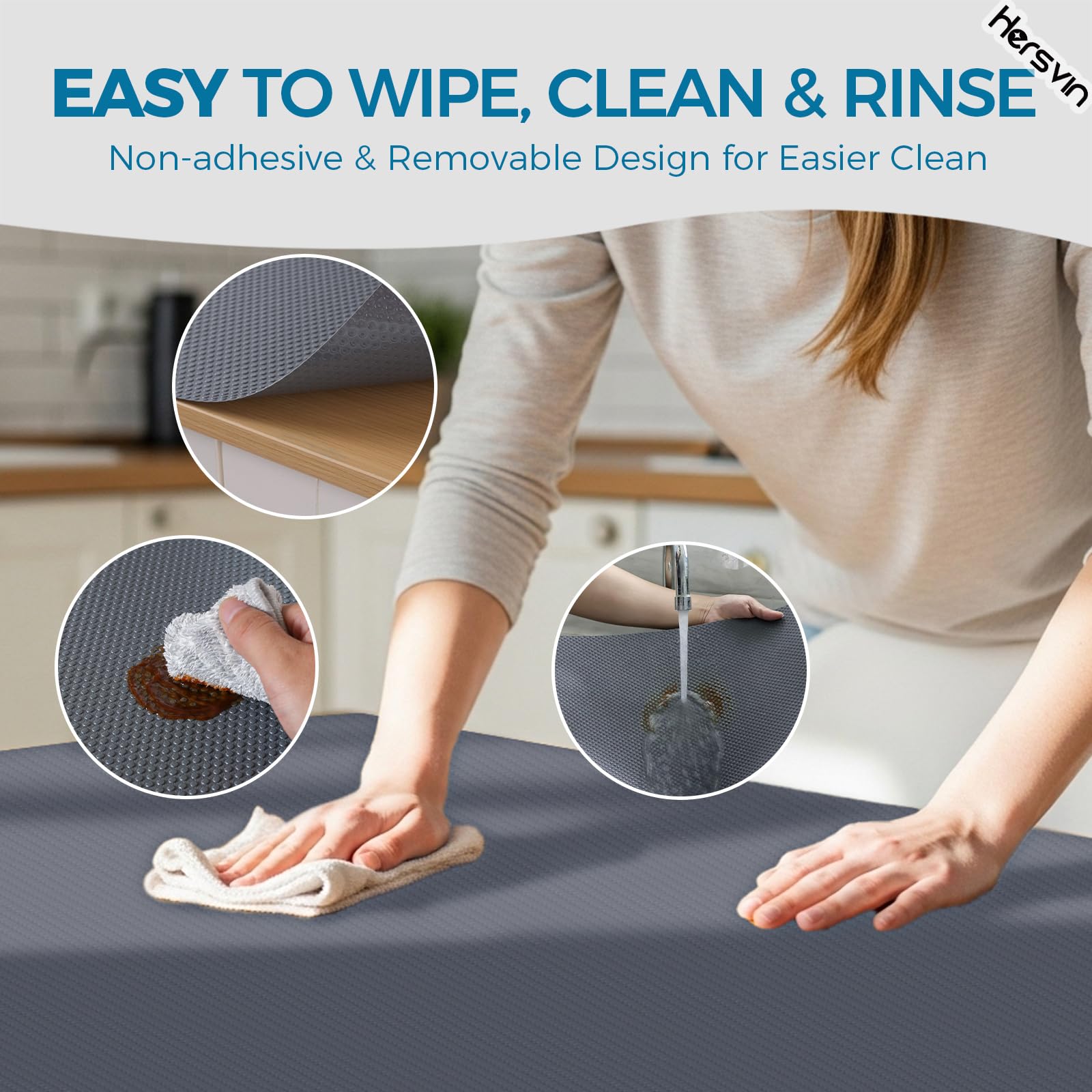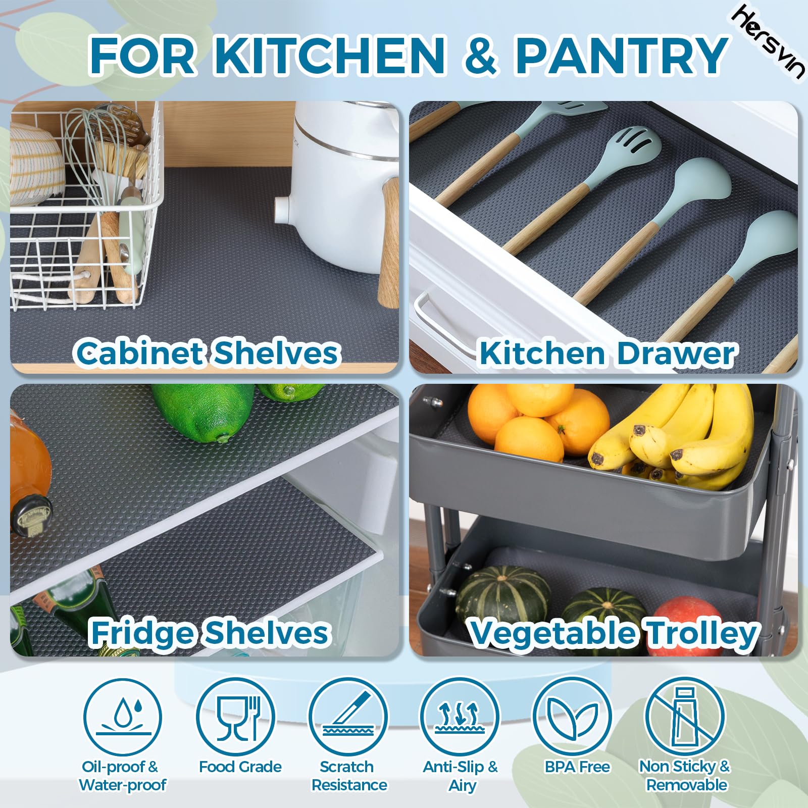 Verschwendest du immer noch deine Zeit mit deiner Hausarbeit? Bist du es leid, die Oberfläche deiner Schränke oder deiner Kühlschränke und Waschküche zu reinigen? Die EVA-Regaleinlagen von Hersvin können dein Problem lösen und dir wertvolle Zeit sparen. Sie halten deine Gegenstände und Regale sauber und geschützt. Sie sind ideal zum Schutz von Glas, Holz, Kunststoffoberflächen und anderen. Du kannst sie in deinen Schränken, Speisekammern, Kühlschränken, Waschküchen, Büros und Autos verwenden. Du musst die geschützten Oberflächen nie wieder abwischen. Wenn die Einlagen schmutzig werden, kannst du sie einfach waschen und dann wiederverwenden. Dank des passgenauen Schnittmusters lässt es sich leicht in Stücke schneiden und passt in jede Schublade und jedes Regal.