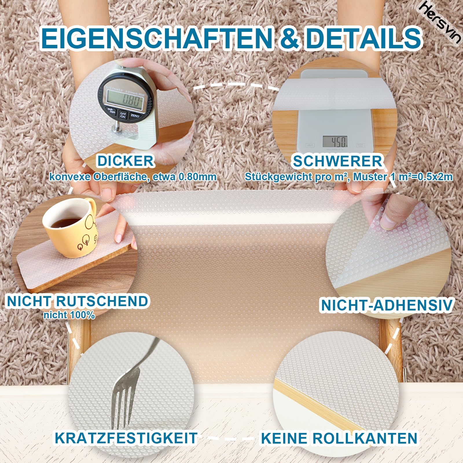 Verschwenden Sie noch Zeit mit Ihrer Hausarbeit? Sind Sie es leid, die Oberfläche Ihrer Schränke oder Kühlschränke und Waschräume zu reinigen? Hersvin EVA-Regalverkleidung kann Ihr Problem lösen und Ihre wertvolle Zeit sparen. Halten Sie Ihre Lagerartikel und Regale sauber und geschützt. Sie sind ideal zum Schutz von Glas, Holz, Kunststoffoberflächen und anderen. Sie können in Ihren Schränken, Speisekammern, Kühlschränken, Waschküchen, Büros und Autos verwendet werden. Sie müssen nie wieder geschützte Oberflächen abwischen. Wenn die Beutel verschmutzt sind, können Sie sie einfach waschen und wiederverwenden. Mit einem ausgeschnittenen Muster lässt es sich leicht in Stücke schneiden und passt in jede Grösse von Schublade und Regal.