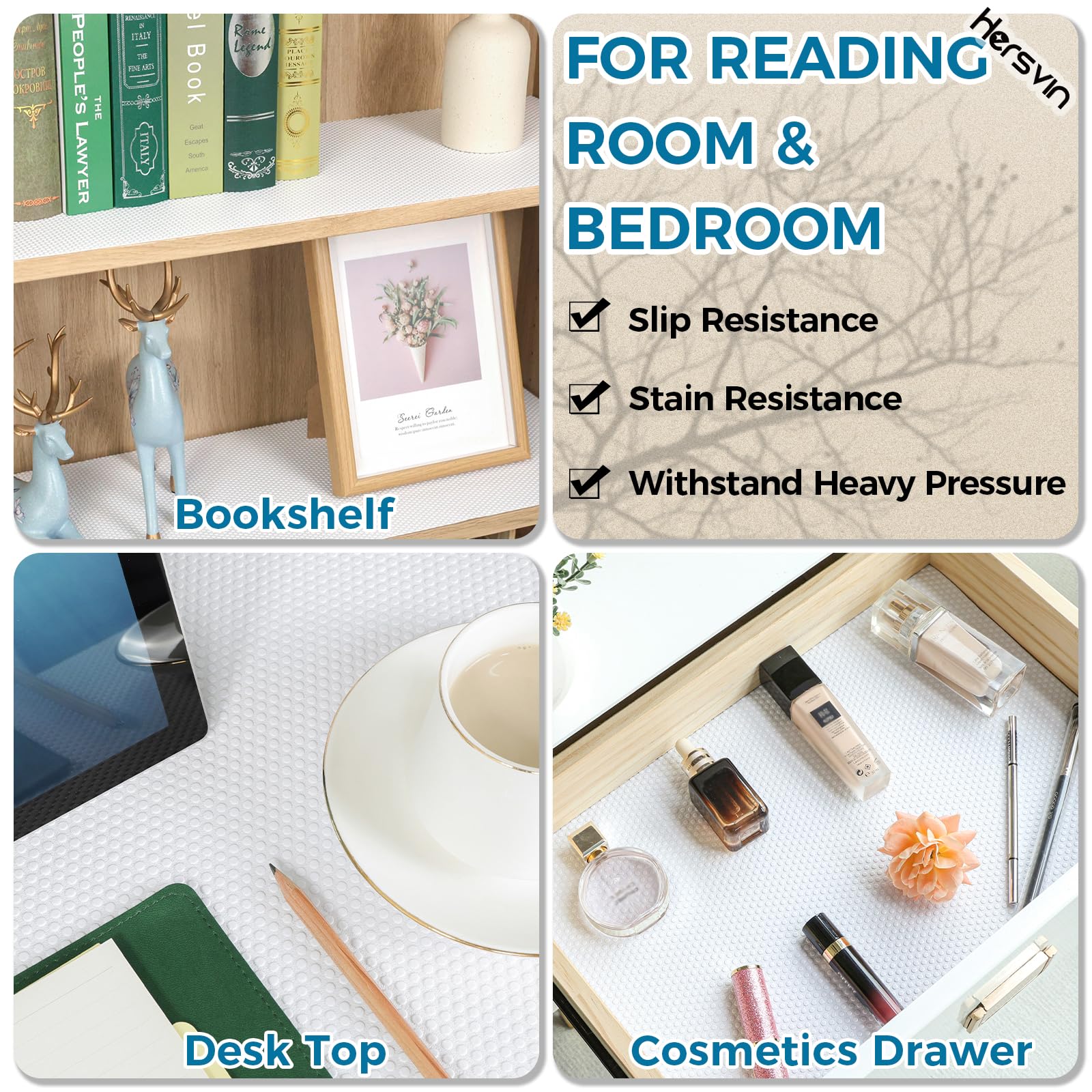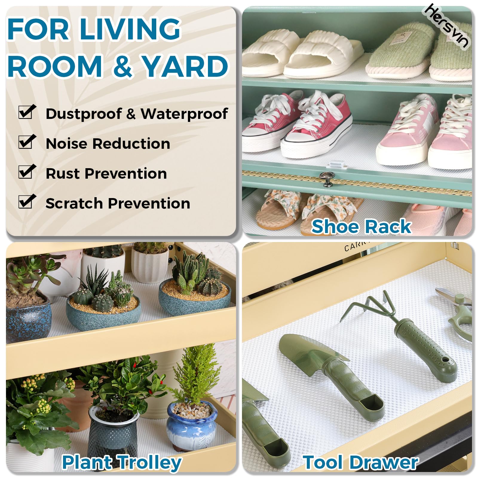 Verschwenden Sie immer noch Ihre Zeit mit Ihrer Hausarbeit? Sind Sie es leid, die Oberfläche Ihrer Schränke oder Ihre Kühlschränke und Waschküche zu reinigen? Hersvin EVA-Regaleinlage kann Ihr Problem lösen und wertvolle Zeit sparen. Halten Sie Ihre aufbewahrten Gegenstände und Regale sauber und geschützt. Sie sind ideal zum Schutz von Glas, Holz, Kunststoffoberflächen und anderen. Sie können in Ihren Schränken, Speisekammern, Kühlschränken, Waschküchen, Büros und Autos verwendet werden. Sie müssen die geschützten Oberflächen nie wieder abwischen. Wenn die Liner schmutzig werden, können Sie sie einfach waschen und dann wiederverwenden. Mit zugeschnittenem Muster ist es einfach, in Stücke zu schneiden und passt in jede Grösse von Schublade und Regal.