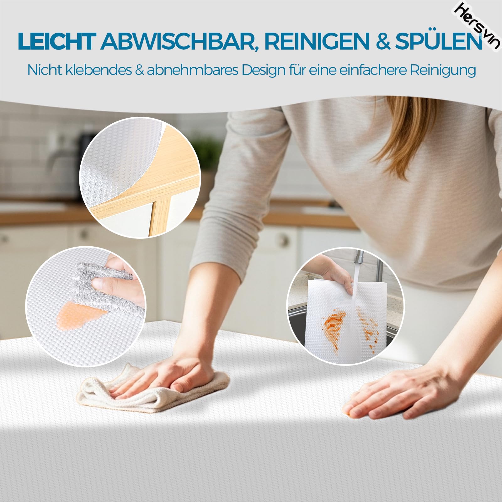 Verschwenden Sie immer noch Ihre Zeit mit der Hausarbeit? Sind Sie es leid, die Oberflächen Ihrer Schränke, Kühlschränke und Waschräume zu reinigen? Hersvin EVA Shelf Liner kann Ihr Problem lösen und Ihre wertvolle Zeit sparen. Halten Sie Ihre Lagergegenstände und Regale sauber und geschützt. Sie sind ideal zum Schutz von Glas-, Holz-, Kunststoffoberflächen und anderen. Sie können in Ihren Schränken, Vorratskammern, Kühlschränken, Waschküchen, im Büro und im Auto verwendet werden. Sie müssen die geschützten Oberflächen nie wieder abwischen. Wenn die Abdeckungen schmutzig werden, können Sie sie einfach waschen und wiederverwenden. Dank des passgenauen Schnittmusters lassen sie sich leicht in Stücke schneiden und passen in jede Schublade und jedes Regal.