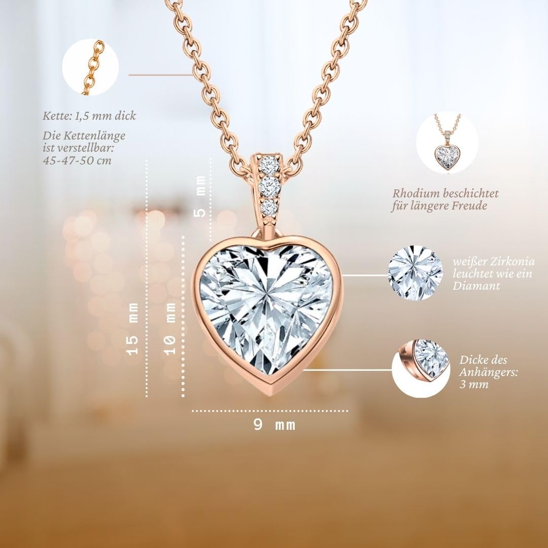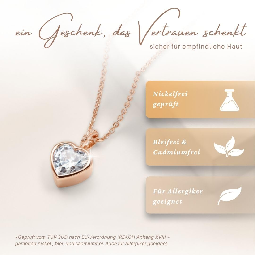 Die LOVENEST Halskette ist als edle Herzkette aus 925 Sterling Silber sowie in Roségold oder Gelbgold vergoldet erhältlich und vereint funkelnden Herzschmuck mit einer liebevollen Botschaft. Der grosse Zirkonia-Herzstein, veredelt durch drei zarte Steinchen, macht diese Kette mit Herzanhänger zu einem eleganten Highlight für jeden Anlass. Alle Varianten sind nickelfrei (TÜV-geprüft), hautfreundlich und ideal für Allergiker – perfekt als täglich tragbarer Damen-Schmuck. Am Verschluss befindet sich ein kleiner Herzanhänger mit der Gravur „Ich liebe Dich“, der diese Halskette zu einem besonders persönlichen und emotionalen Geschenk macht. Die Länge ist verstellbar auf 45 cm, 47 cm und 50 cm und passt sich jedem Outfit ideal an. Geliefert wird die Silberkette in einer hochwertigen Geschenkbox mit Gravur und Echtschmuck-Zertifikat. Eine wunderschöne Geschenkidee für Freundin, Ehefrau, Mama, Tochter oder Schwester – perfekt zum Geburtstag, Hochzeitstag, Jahrestag, Valentinstag oder Weihnachten.