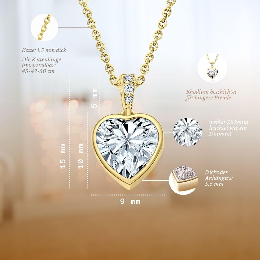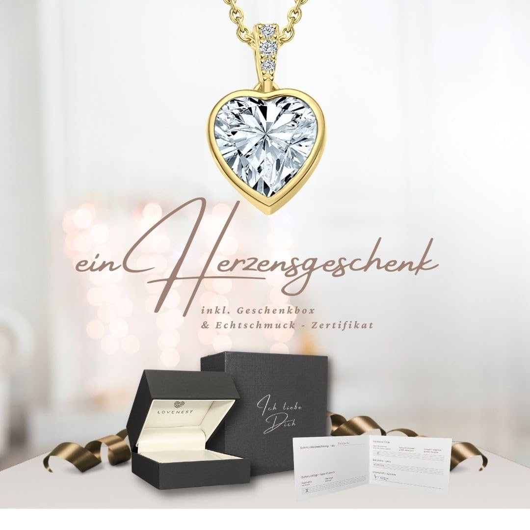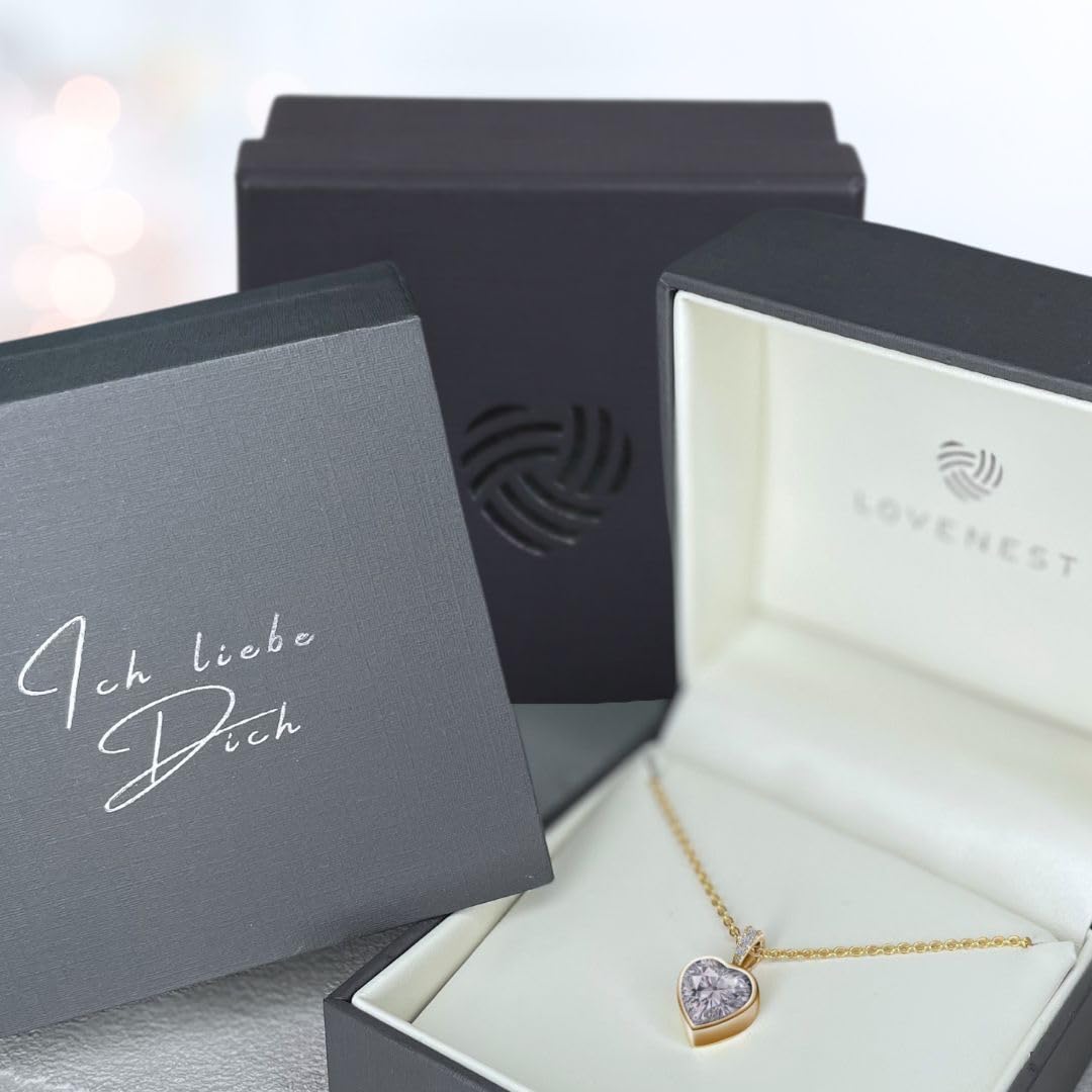 Die LOVENEST Halskette ist als edle Herzkette aus 925 Sterling Silber sowie in Roségold oder Gelbgold vergoldet erhältlich und vereint funkelnden Herzschmuck mit einer liebevollen Botschaft. Der grosse Zirkonia-Herzstein, veredelt durch drei zarte Steinchen, macht diese Kette mit Herzanhänger zu einem eleganten Highlight für jeden Anlass. Alle Varianten sind nickelfrei (TÜV-geprüft), hautfreundlich und ideal für Allergiker – perfekt als täglich tragbarer Damen-Schmuck. Am Verschluss befindet sich ein kleiner Herzanhänger mit der Gravur „Ich liebe Dich“, der diese Halskette zu einem besonders persönlichen und emotionalen Geschenk macht. Die Länge ist verstellbar auf 45 cm, 47 cm und 50 cm und passt sich jedem Outfit ideal an. Geliefert wird die Silberkette in einer hochwertigen Geschenkbox mit Gravur und Echtschmuck-Zertifikat. Eine wunderschöne Geschenkidee für Freundin, Ehefrau, Mama, Tochter oder Schwester – perfekt zum Geburtstag, Hochzeitstag, Jahrestag, Valentinstag oder Weihnachten.
