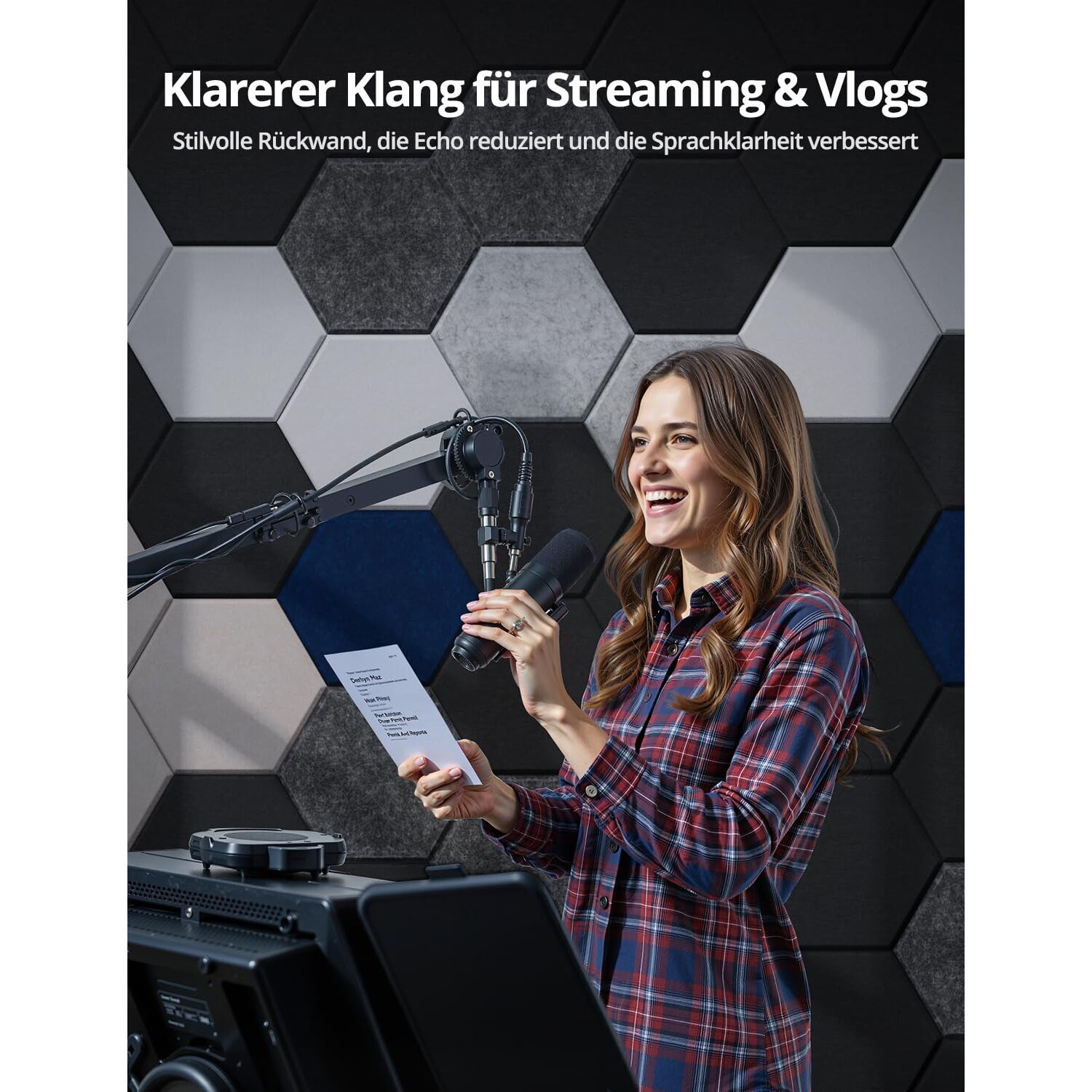 Diese Hexagon Akustikplatten von Kuchoow sind die perfekte Lösung für eine effektive Schalldämmung und Geräuschminderung in verschiedenen Räumen. Mit einer Dicke von nur 0,9 cm nehmen sie überhaupt keinen Platz ein und sorgen durch ihr einzigartiges sechseckiges Design für eine ansprechende Optik. Die selbstklebende Rückseite ermöglicht eine einfache und sichere Montage ohne zusätzliches Werkzeug. Die Platten bestehen aus ungiftigem und harmlosem recycelbarem Polyesterfasermaterial, was sie zu einer sicheren Option für Kinder, Haustiere und Erwachsene macht. Neben der Geräuschreduzierung bieten diese Akustikplatten auch eine Verbesserung der Klangqualität und weisen eine gute Stossfestigkeit, Kollisions-, Rutsch- und Kratzfestigkeit auf. Zusätzlich können sie als Hintergrundwand für Fotos oder Notizen verwendet werden. Diese Akustikplatten sind ideal für Aufnahmestudios, Heimkinos, Konferenzräume, Büros, Musikräume, Klassenzimmer, Hotels, Bandprobenräume und andere Räume, die eine akustische Behandlung erfordern.