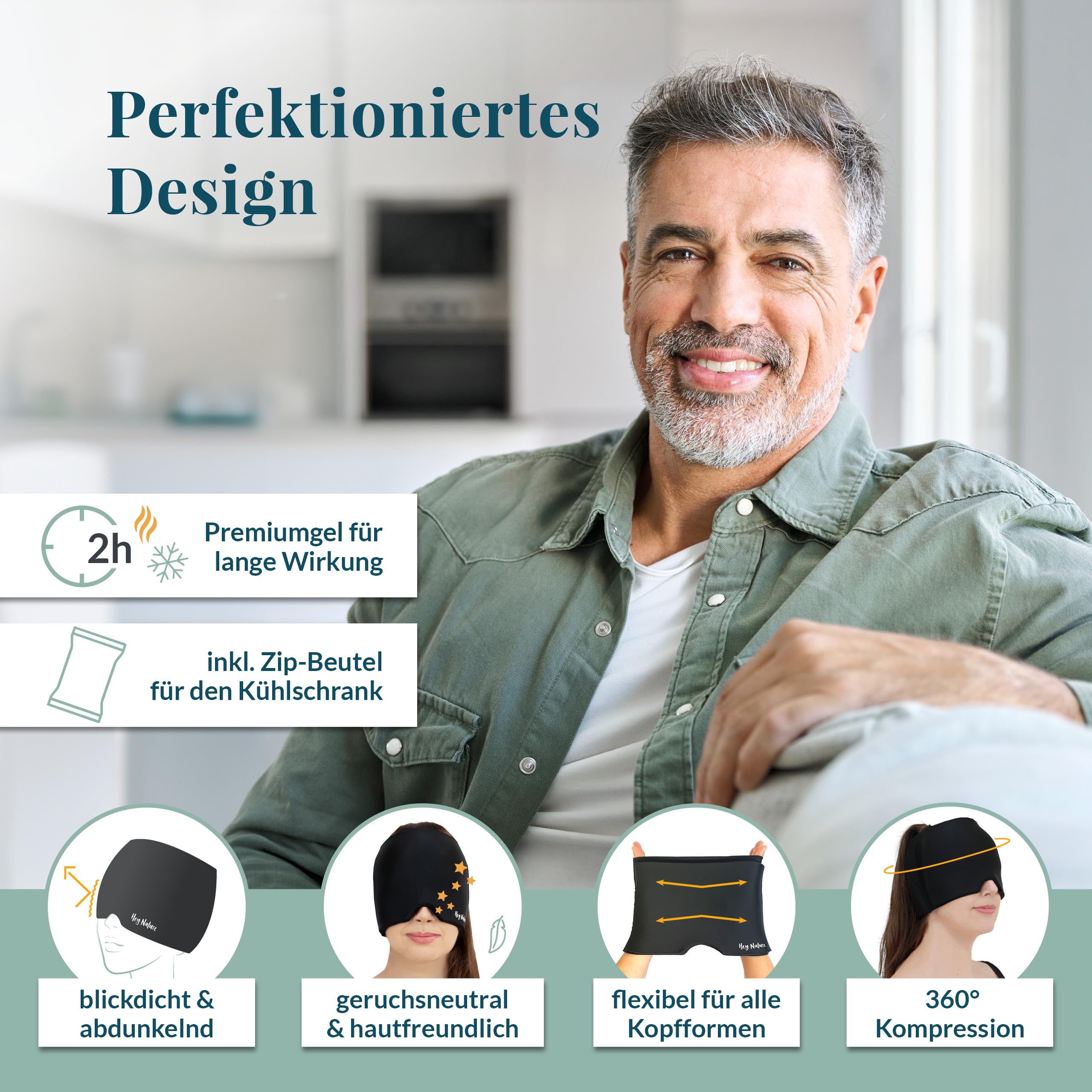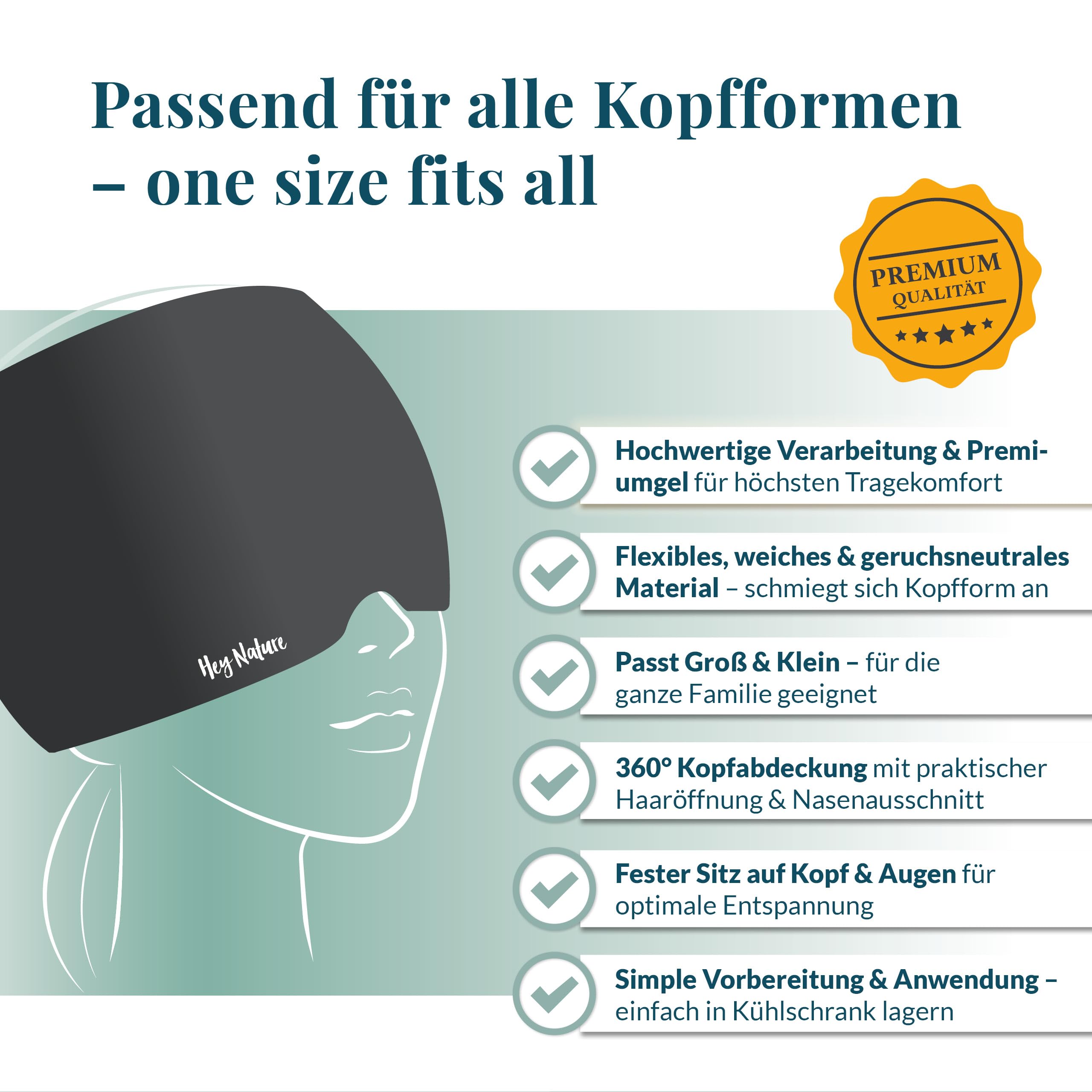 Die Migräne Maske von Hey Nature kannst du sowohl als Kaltkompresse als auch zur Wärmetherapie einsetzen. Es ist eins der Top Geschenke für Frauen, denn die Maske überzeugt durch die hochwertige Verarbeitung und Materialien, die besonders weich sind und sich komfortabel und flexibel jeder Kopfform anpassen, zudem haben wir für unsere Maske besonders dickes Gel verwendet, dass den Kopf 360° umgibt. Bei Migräne empfehlen wir vor allem die Kalttherapie, die Migränemaske wirkt hier deutlich besser als ein kühlendes Handtuch. Kälte wirkt betäubend und kann dein Schmerzempfinden reduzieren. Bei einer Migräneattacke werden oft die Nerven im Kopf- und Gesichtsbereich überreizt, was durch Kälte gedämpft wird. Migräne wird auch durch die Erweiterung von Blutgefässen im Gehirn verursacht. Kälte verengt diese Blutgefässe (Vasokonstriktion), was den Druck und die Schmerzen reduzieren kann. Die Hey Nature Migräne Mütze schützt auch die häufig lichtempfindlichen Augen durch die Abschirmung des Sonnenlichts und übt einen angenehmen, leichten Druck auf den Kopf und auch auf die Augen aus. Warm eingesetzt, hilft die Maske bei Nebenhöhlenentzündungen und Ohrenschmerzen. Denn Wärme fördert die Durchblutung, löst Muskelverspannungen löst und verflüssigt festgesetzten Schleim, was den Druck und die Schmerzen lindert. Zudem beruhigt Wärme die Nerven und unterstützt den Heilungsprozess. Unsere Maske ist zudem Migräne Maske und Schlafmaske in einem. Sie bietet nicht nur die perfekte Abdunklung, sondern hat einen angenehmen kühlenden Effekt. Kompression, Abdunklung, Ohrenschutz in einem - somit besser als jede Schlafmaske aus Seide. Du kannst mit dieser Schlafmaske Seitenschläfer glücklich machen, denn sie ist weich und ohne störenden Nähte. Durch ihre flexible Form ist sie als Schlafmaske Herren und Schlafmaske Frauen gut einsetzbar. Du kannst die Maske bei Kopfschmerzen, als kühlende Augenmaske oder wenn du ein anti Kater Mittel brauchst verwenden. Warm, statt Wärmflasche auch bei Regelschmerzen anwendbar.