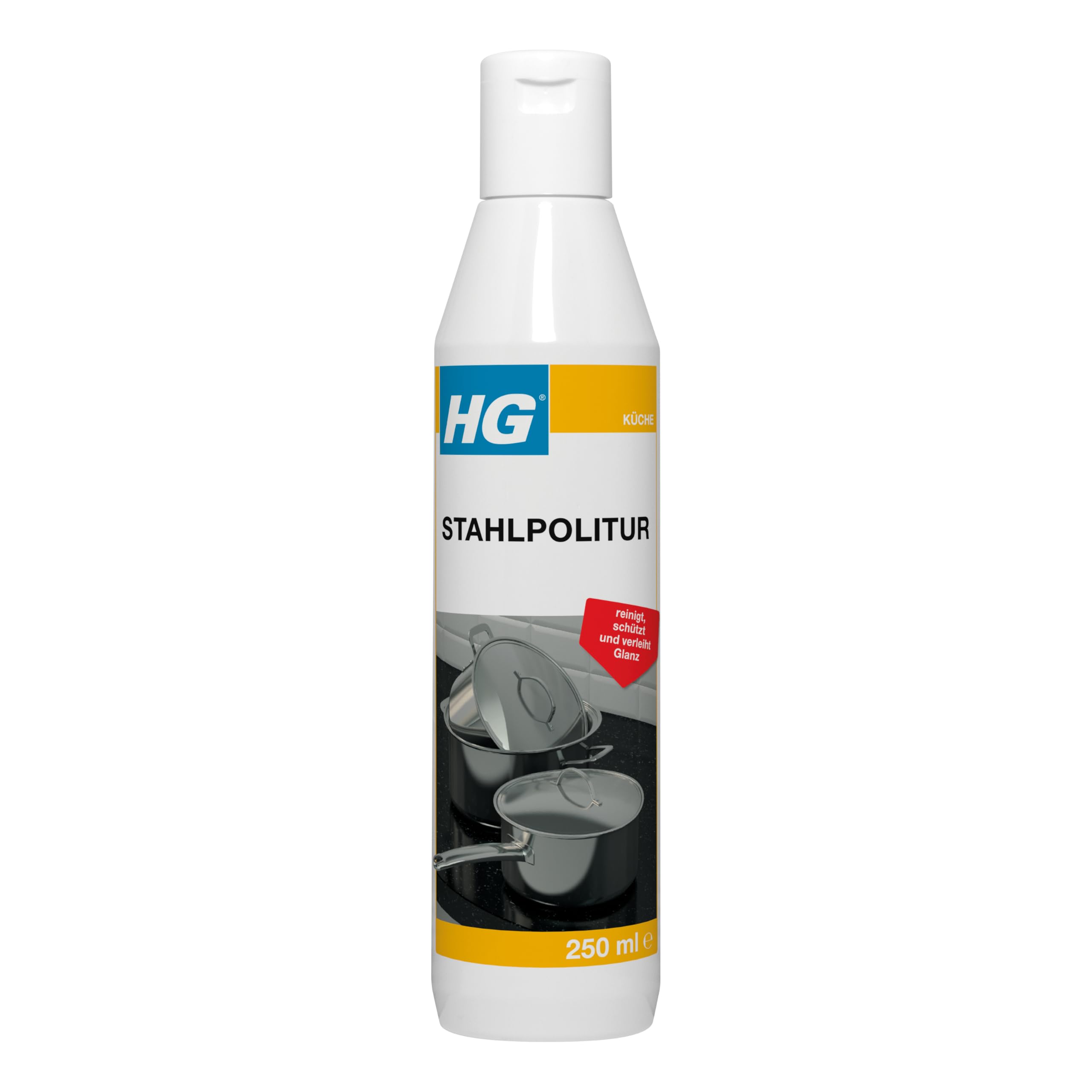 Die HG Stahlpolitur (250 ml Flasche) ist als leistungsstarke Edelstahlpolitur für alle Edelstahloberflächen wie Küchenplatten, Pfannen, Wasserkocher, Griffe, Herde und Küchengeräte bestens geeignet. Ausserdem lassen sich damit auch Aluminium- und Kupferpfannen, Kunststoff-Küchenplatten, verchromte Wasserhähne, Wasserkocher und elektrische Kochfelder auf Hochglanz polieren. Diese vielseitige 3-in-1-Edelstahlpolitur reinigt, poliert und schützt in nur einer Behandlung. Die innovative Formel ist sanft zu Oberflächen, entfernt jedoch auch hartnäckige Speisereste, Flecken, Fingerabdrücke und Verschmutzungen in der Küche und im ganzen Haus. Die Stahlpolitur kann auch als Chrom-, Aluminium- und Kupferpolitur verwendet werden und beugt dank der Schutzwirkung einer erneuten Verschmutzung der Oberflächen vor; die in der Stahlpolitur enthaltenen Poliermittel lassen die Oberflächen streifenfrei glänzen. Zudem ist das Produkt äusserst hautfreundlich und verursacht keine Reizungen. Inhalt: 1 x HG Stahlpolitur (250 ml Flasche) So verwenden Sie die HG Stahlpolitur: 1. Vor Gebrauch gut schütteln. 2. Geben Sie eine kleine Menge der HG Stahlpolitur auf ein feuchtes Tuch. 3. Reiben Sie die Oberfläche mit etwas Druck ein; dabei sollten Sie immer in eine Richtung arbeiten, denn die Stahlpolitur hat eine polierende Wirkung. 4. Wischen Sie die Oberfläche mit einem ausgespülten Tuch und anschliessend mit einem sauberen, trockenen Tuch ab. 5. Die HG Stahlpolitur kann auch mit einem feuchten Schwamm für leichte Ablagerungen oder Verschmutzungen verwendet werden; anschliessend mit einem feuchten, sauberen Tuch abwischen. Lesen Sie vor der Anwendung immer das Etikett. Testen Sie es zuerst an einer unauffälligen Stelle. Bevorzugen Sie ein Spray? Dann empfehlen wir Ihnen den HG Edelstahl Schnellreiniger. Entdecken Sie die grosse Auswahl an HG-Spezialreinigungsprodukten für Ihr Zuhause, Ihr Büro und Ihren Aussenbereich.