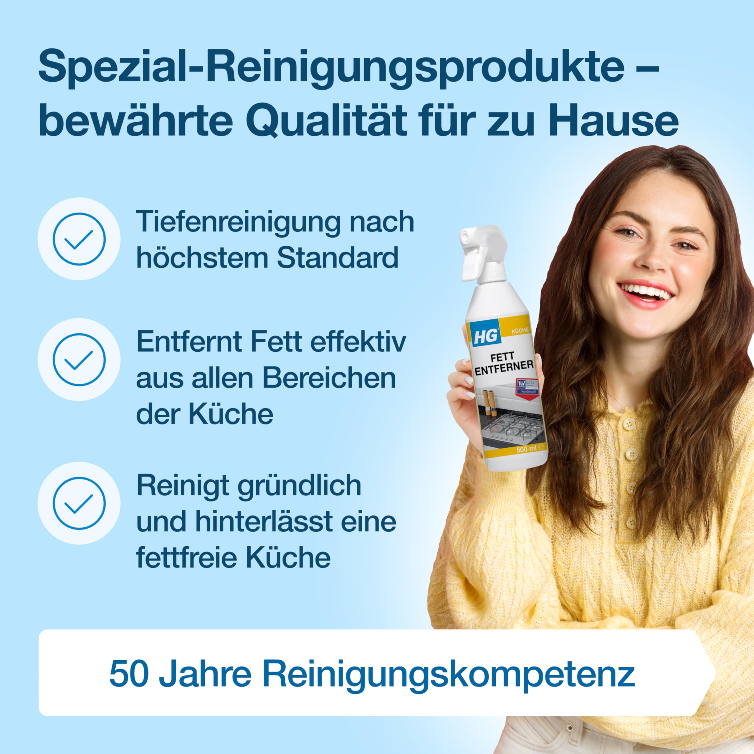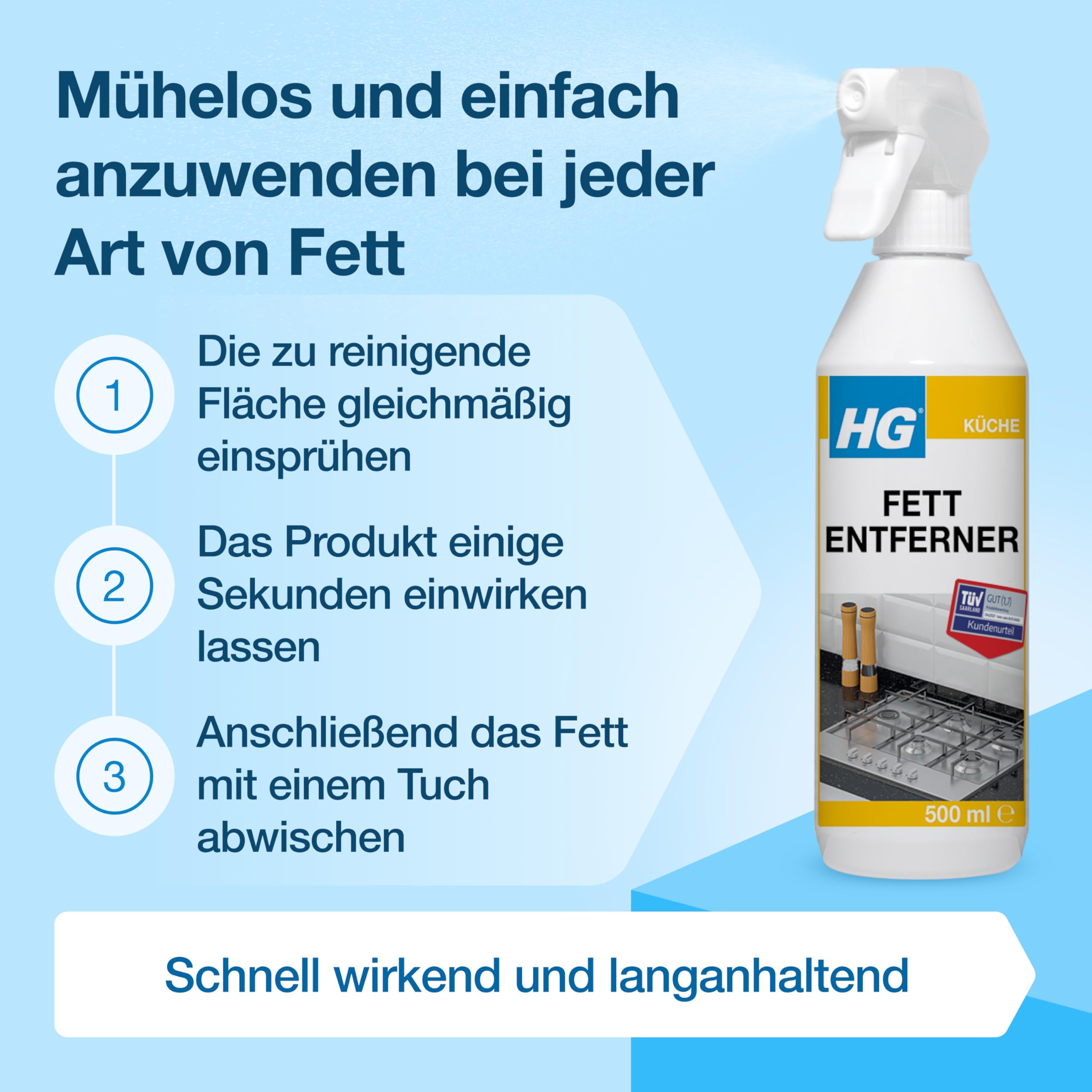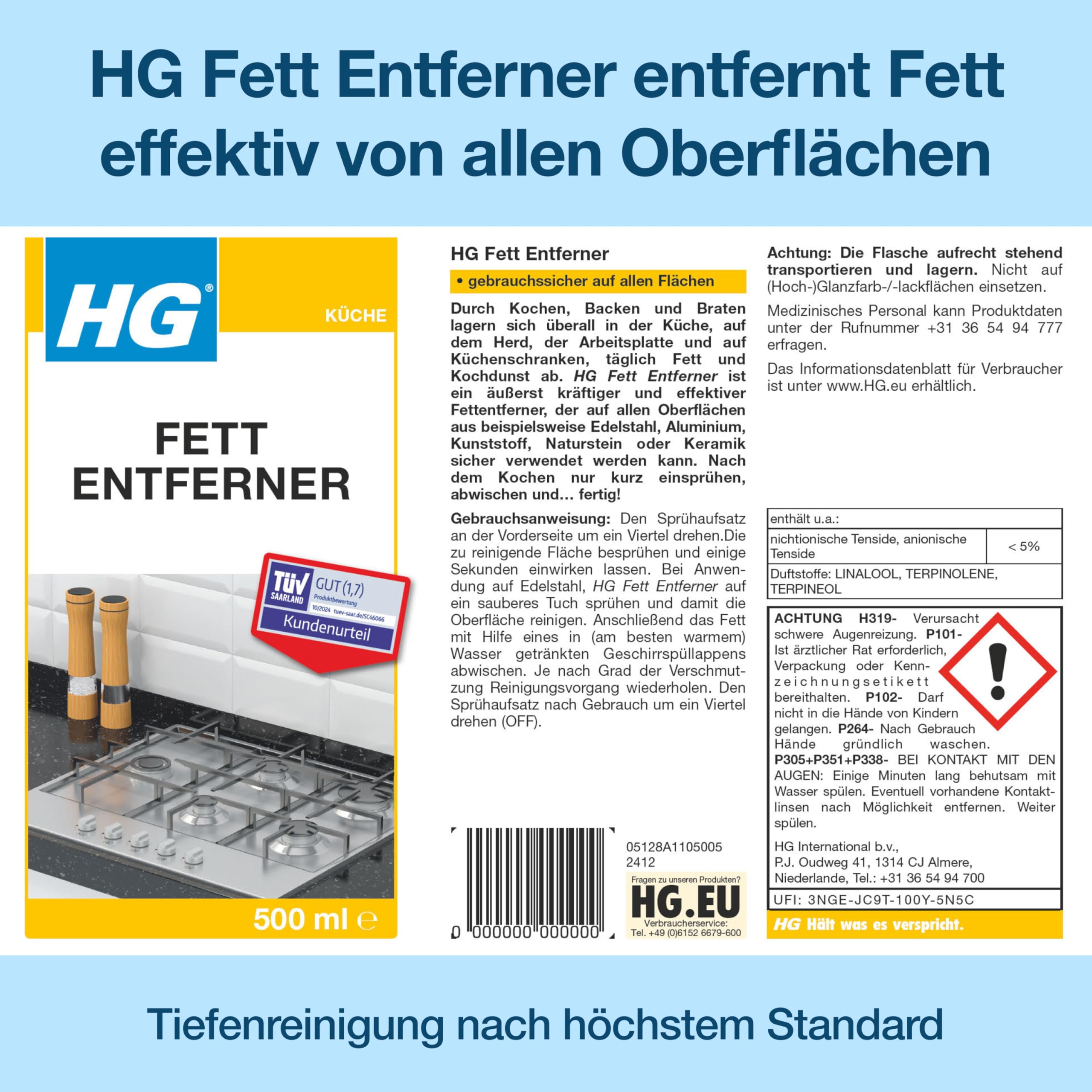 • HG Fettlöser: Entfernt wirksam und zuverlässig tierische und pflanzliche Fette sowie Speiseöle
