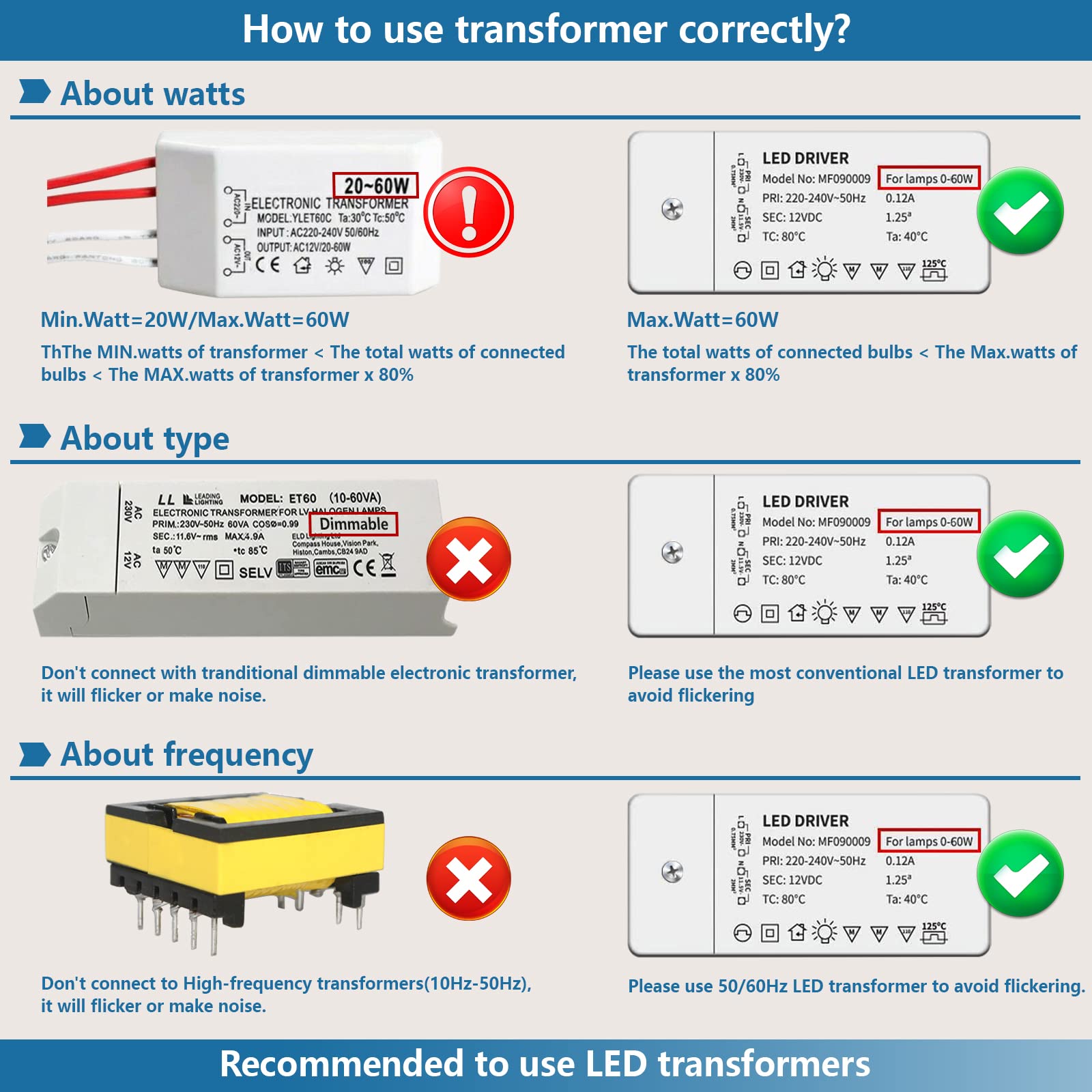 5. Wenn Sie einen Halogen-Transformator verwenden, stellen Sie bitte sicher, dass die minimale Leistung geringer ist als die Leistung der Glühbirne. Bitte beachten Sie die Tipps zur Transformatorauswahl in der Abbildung oben.